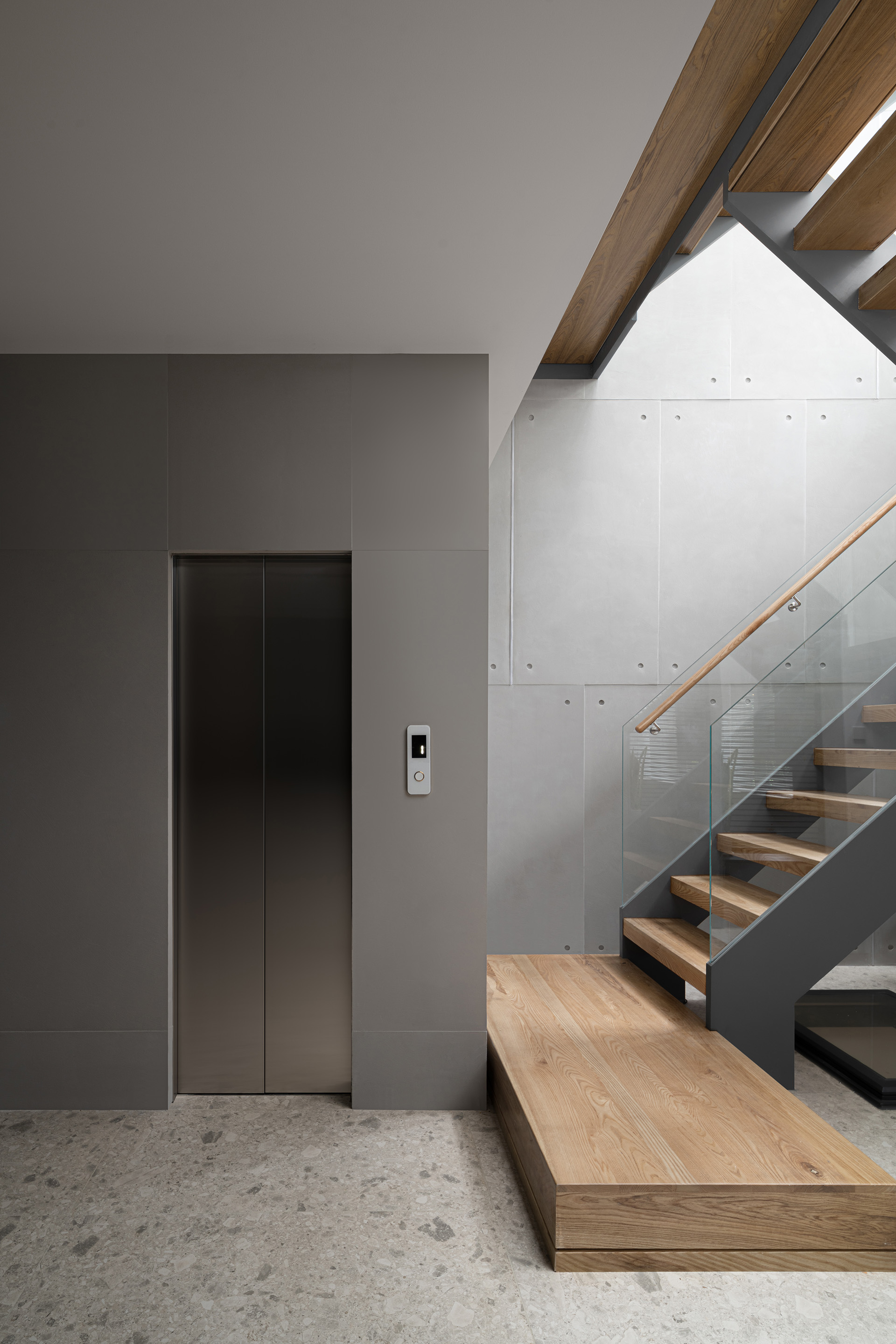 钢结构外框+原木色梯步,层叠递进地穿插在清水混凝土的空间中,其「混凝土」般粗犷的质感,在强调建筑「纯净性」的同时,又强化空间形态,赋予了「空间新的力量」。顶面天花采用阳光房的设计手法,尽可能保障空间的良好光线与通透性。阳光房顶面下方,安装仿木方通,与悬空的木色梯步呼应,也让人产生顶面与外景相通的错觉。