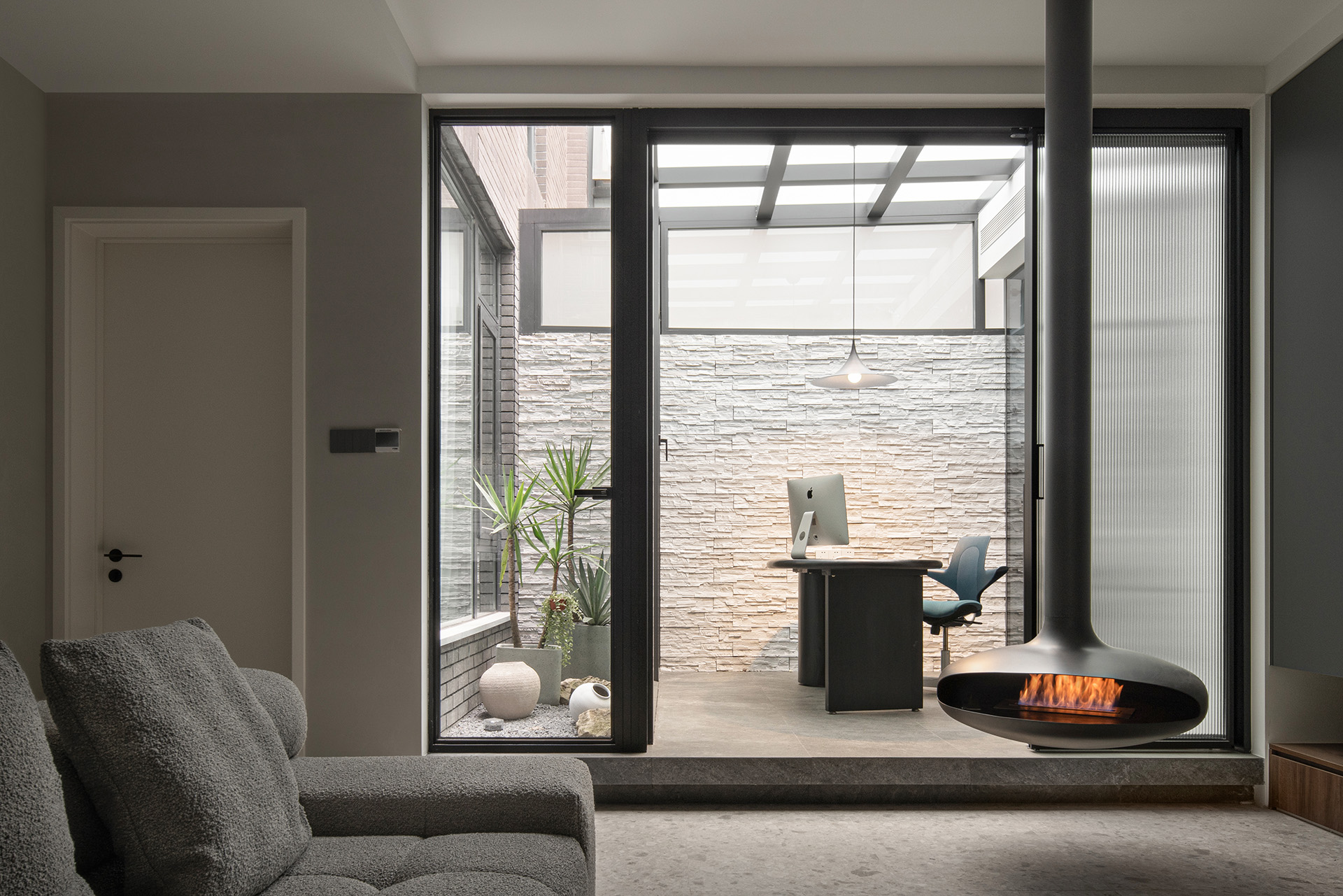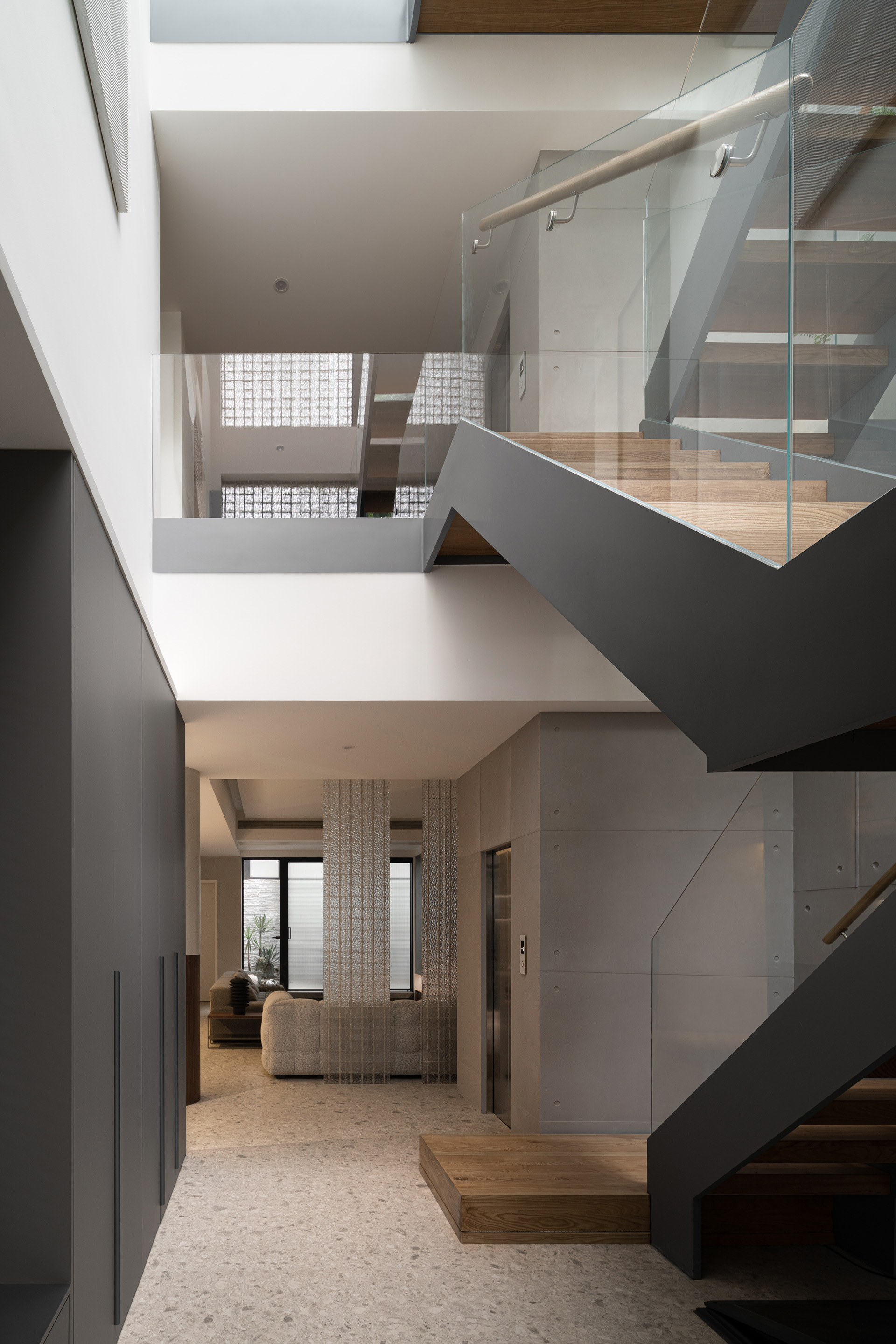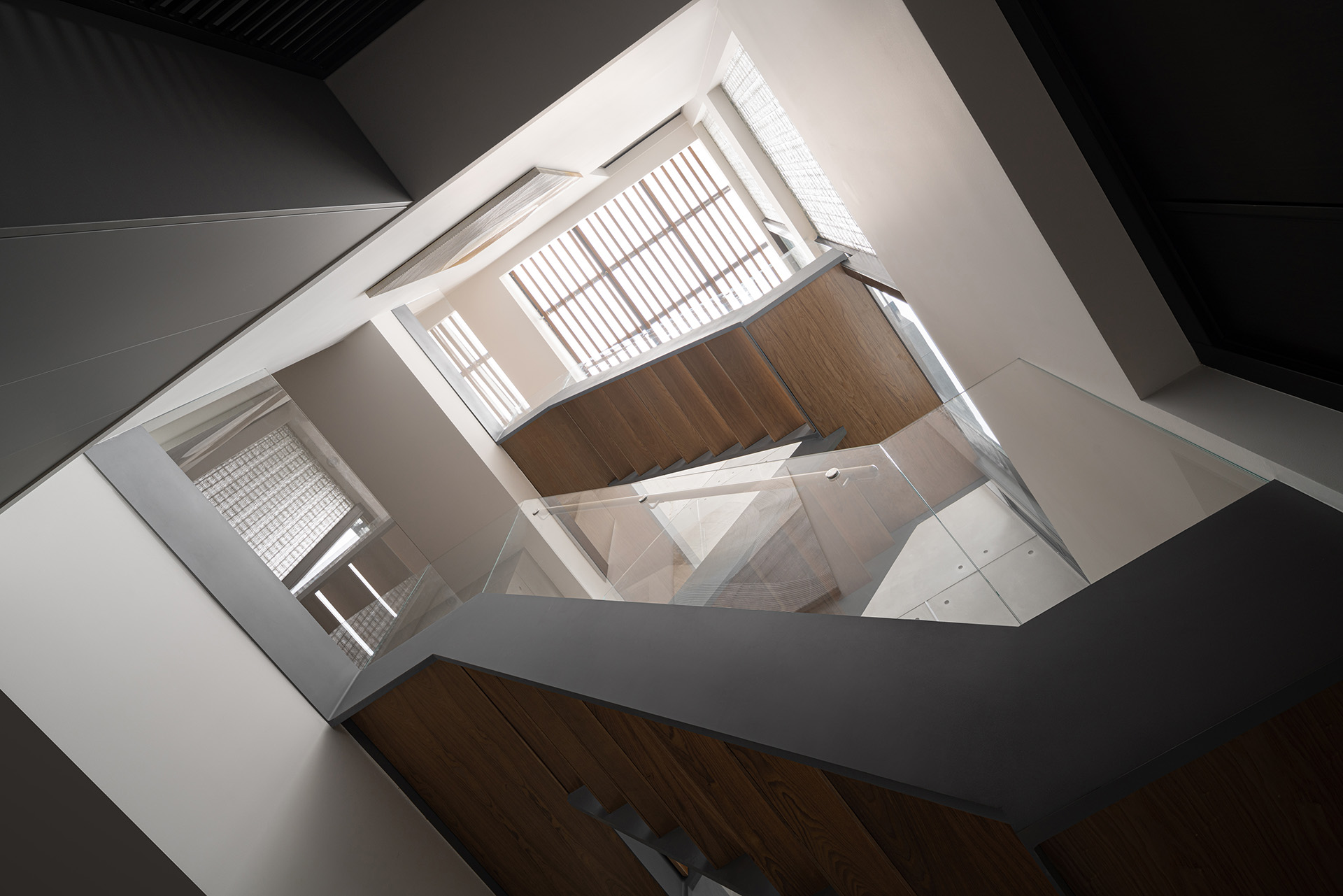 入户楼梯下方新开的天窗,增加地下1楼采光,同时还能通风。一段光沿着楼梯自上而下,从明亮到暗淡、直至深沉,到了拐角的中庭又完全暴露。在这多维、复杂的光影中,空间有了多重效果。搭建后的天井,2、3楼楼梯处利用窗户+玻璃砖的形式,增加通透性的同时,又保证私密性。纵向的通透既强化了空间体量,又最大限度地将室“外”光线引入了室“内”,由此剔除了空间“里”和“外”的界定,空间的交互便由此产生。