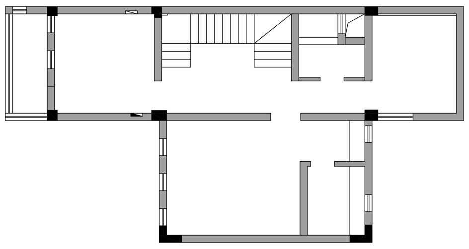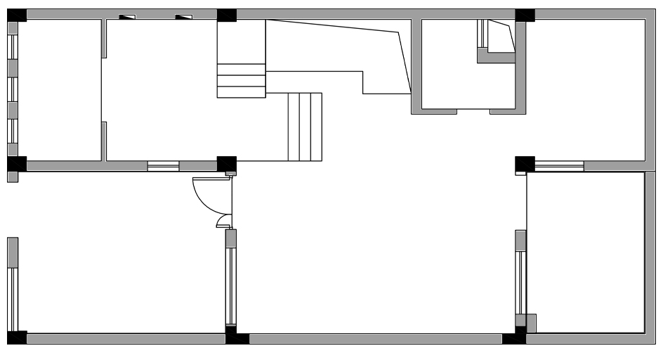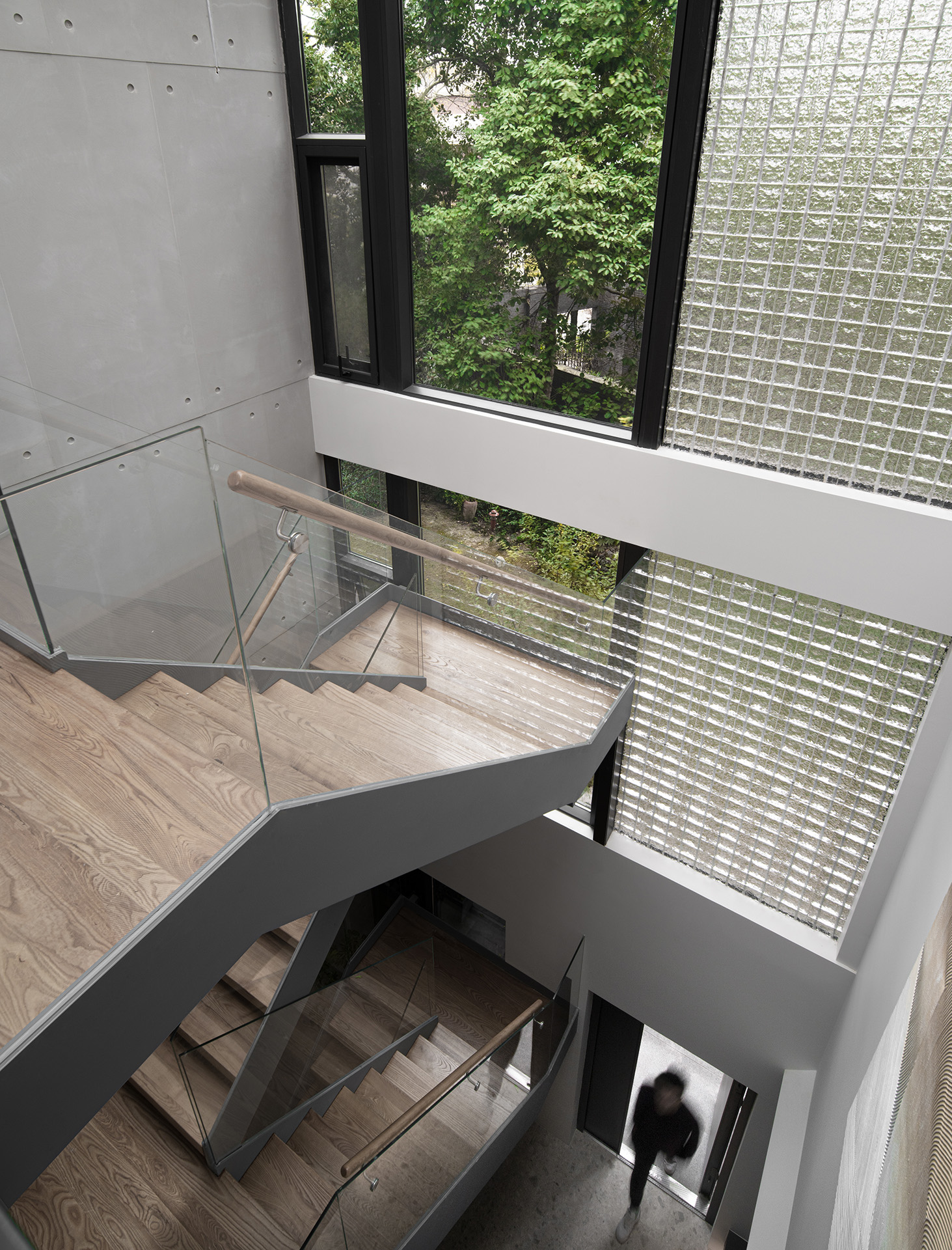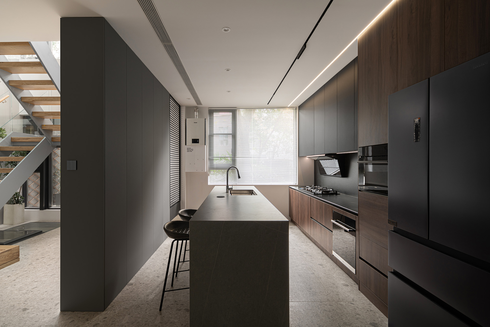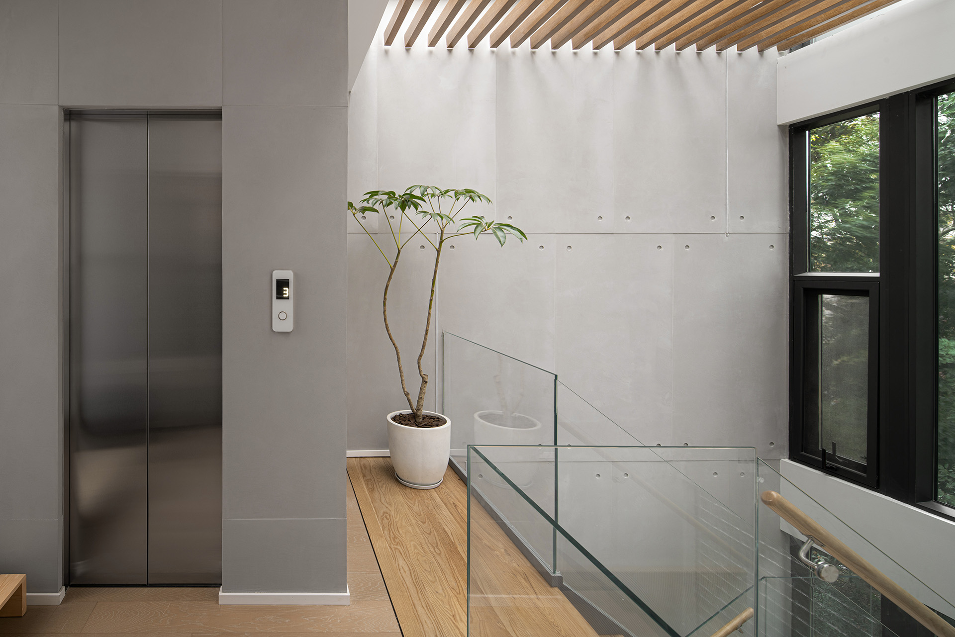 入户楼梯下方新开的天窗,增加地下1楼采光,同时还能通风。一段光沿着楼梯自上而下,从明亮到暗淡、直至深沉,到了拐角的中庭又完全暴露。在这多维、复杂的光影中,空间有了多重效果。搭建后的天井,2、3楼楼梯处利用窗户+玻璃砖的形式,增加通透性的同时,又保证私密性。纵向的通透既强化了空间体量,又最大限度地将室“外”光线引入了室“内”,由此剔除了空间“里”和“外”的界定,空间的交互便由此产生。