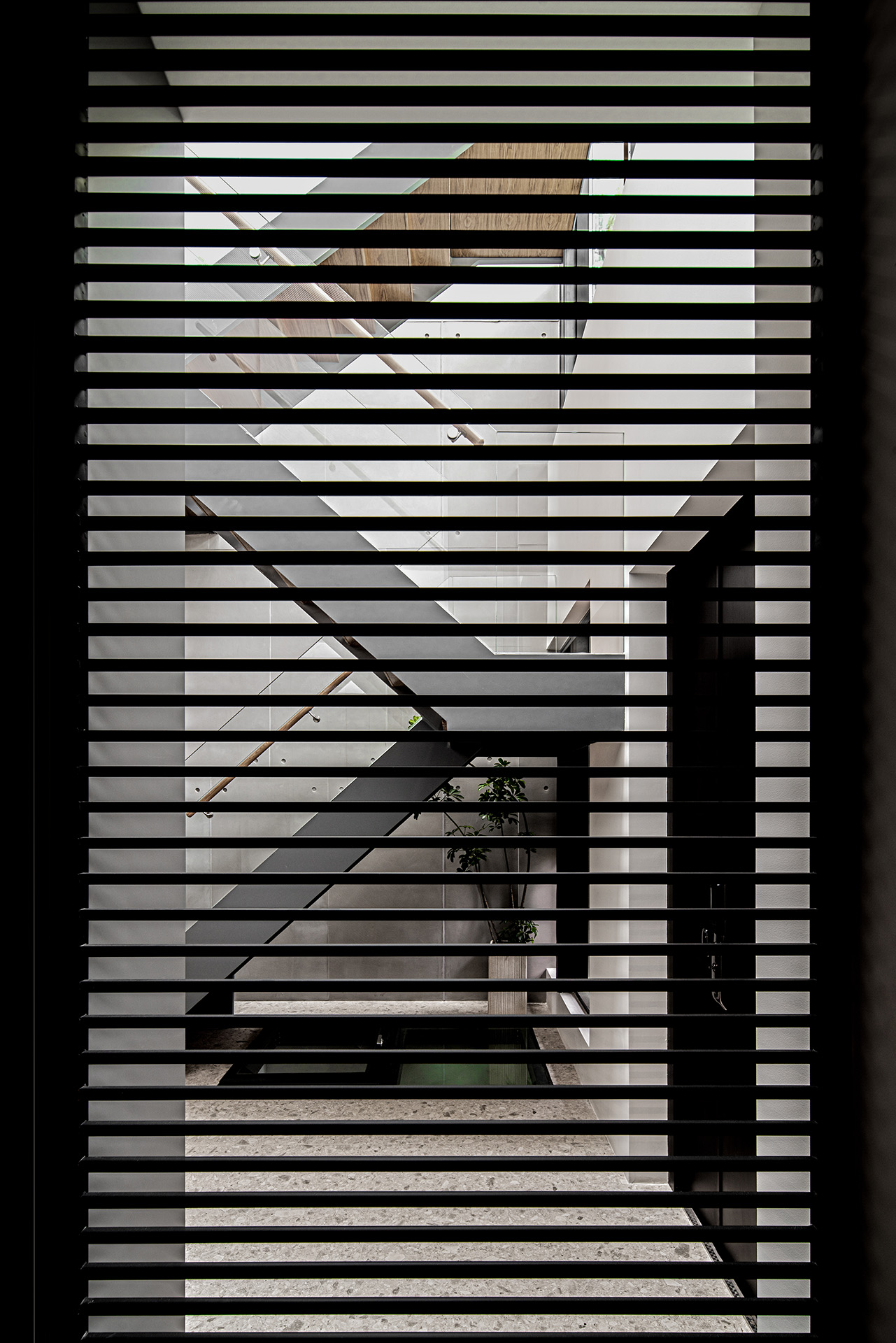 原始1楼虽然拥有不错的采光面积,但因为楼层矮和阳光照射的角度等因素,室内的采光并不充足。设计师将房屋前院扩入室内,建造贯穿整屋的天井。从2、3楼及顶面的搭建的窗口引入光线,即使在传统阴暗的1楼,同样能够获得更多光线。