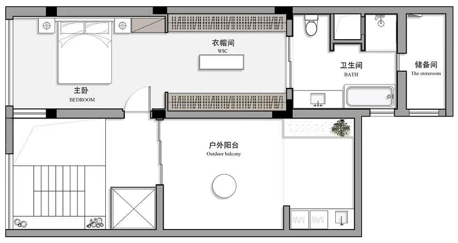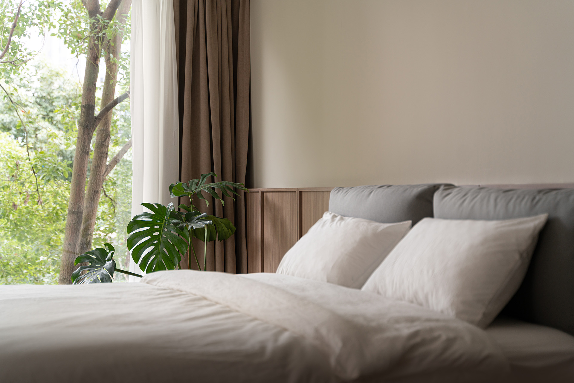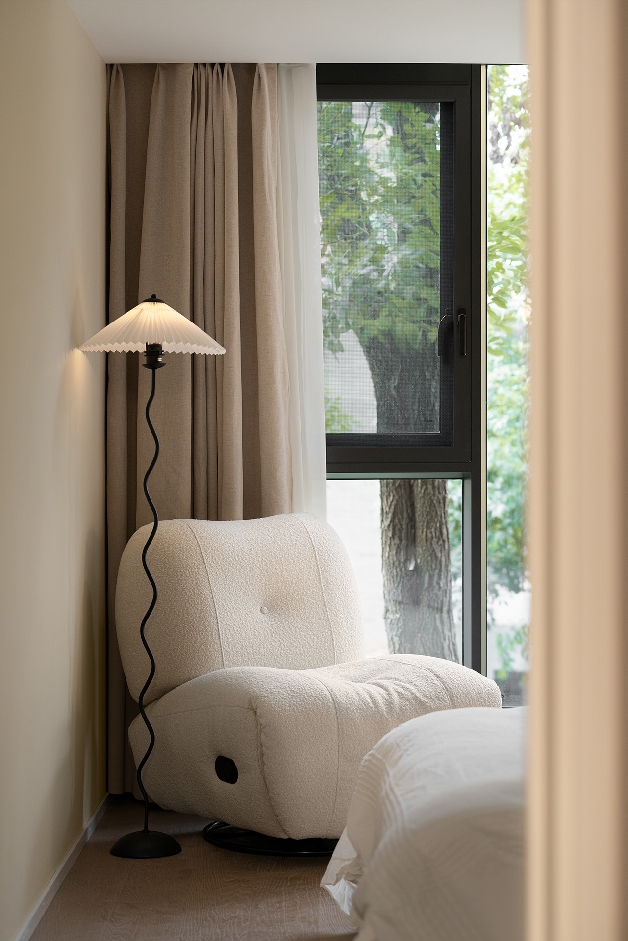 3楼部分搭建空间,设定为主卧。映衬窗外的绿意,主卧将现代与原木结合。让窗外的景观,成为卧室的自然画卷。