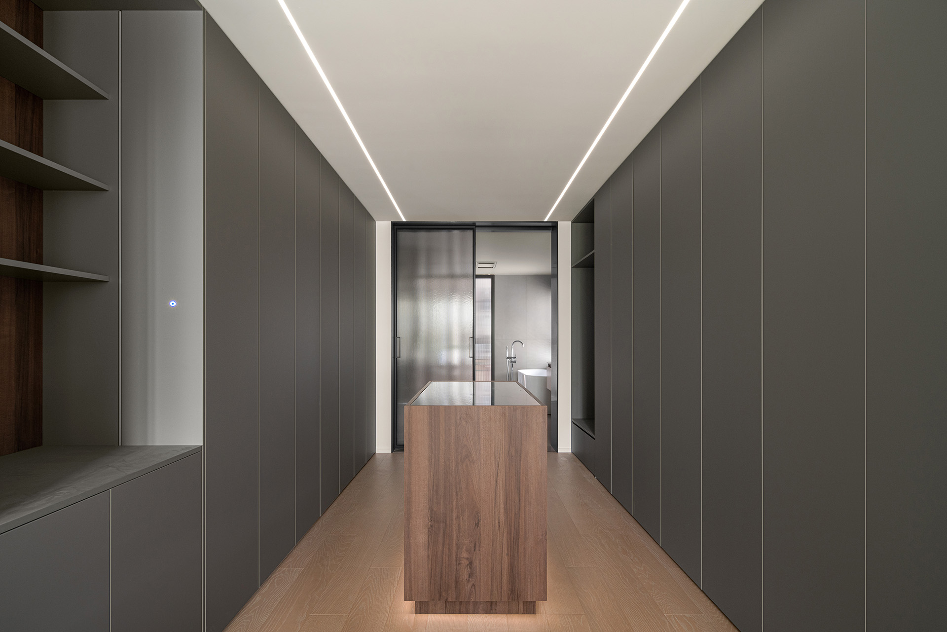 光影与其交织,从平行光到天光,从冷光到暖光。光影流动的同时,既给予了空间特性,也给予了建筑生命。拾阶而上,步移景异。光影的流转,让空间开始呈现不同的质感,明与暗的交错,似乎也在诉说空间里的情感。