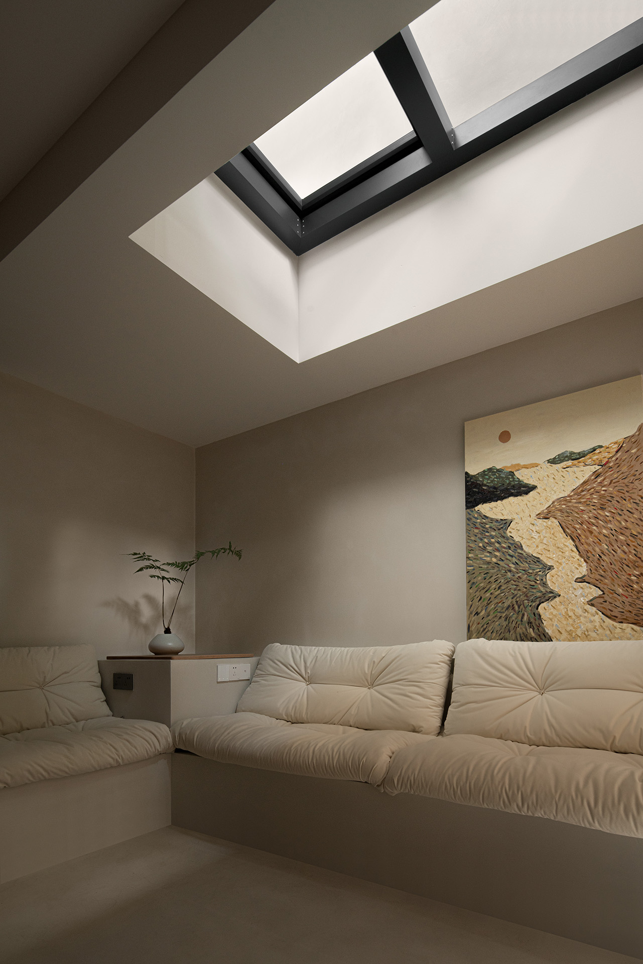光斑在天窗周围的墙面流动,潋滟闪烁,整个建筑自内而外散发着光辉。在「时间」和「空间」维度上的自由感,来自超大的空间尺度。室内低调、谦逊又气氛轻松,完全以居家的舒适感作为考量,放弃形式上的惊人之举。室内的氛围与室外自然环境形成反差,自然光线与室内光线交织共存,饰面上新与旧的衔接,共存。