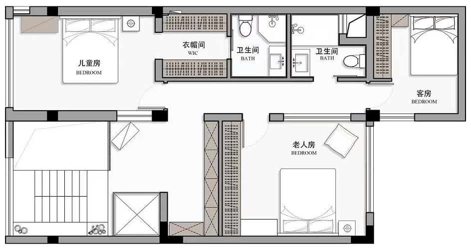 2楼空间以儿童房、老人房、客房为主。改造后的儿童房,拥有优异的尺度感,设计了寝居空间、衣帽间与卫生间。