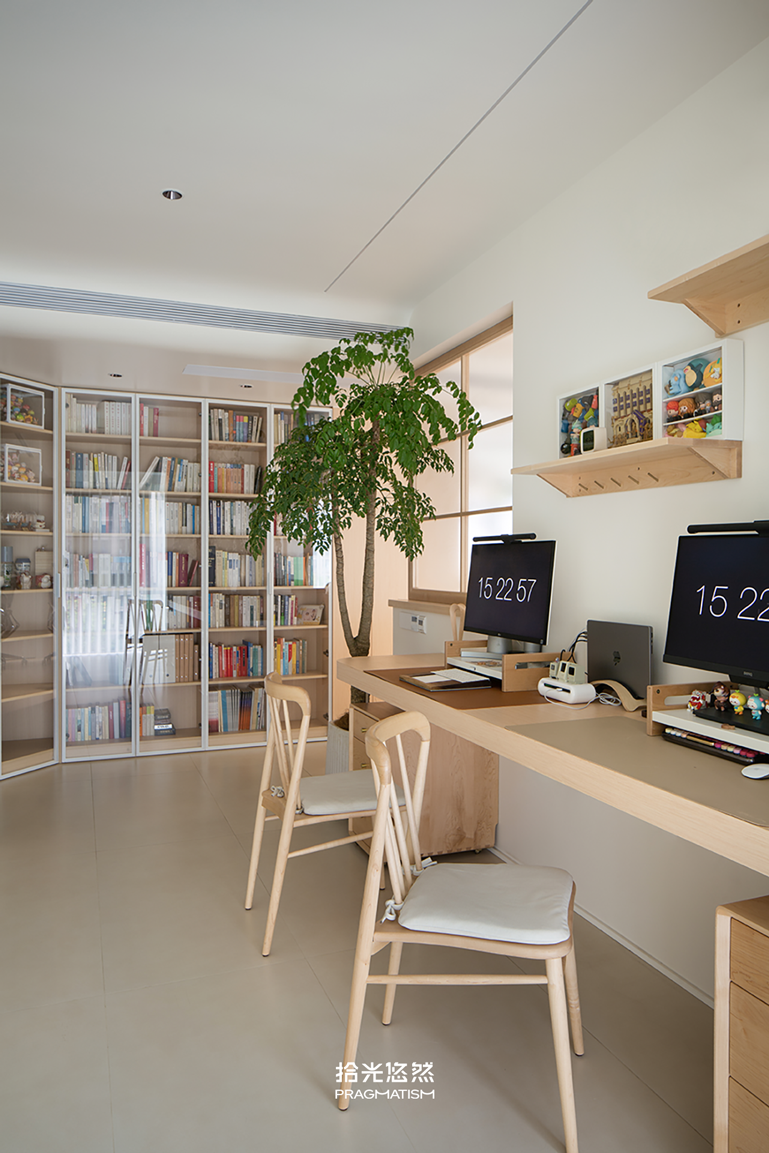 整个书房设计充满了自然、简约和舒适的气息,让人感受到一种与自然和谐相处的美好。这个宁静而舒适的空间,为家庭成员提供了一个专注工作和休闲阅读的空间,让他们能够在这里享受美好的生活。