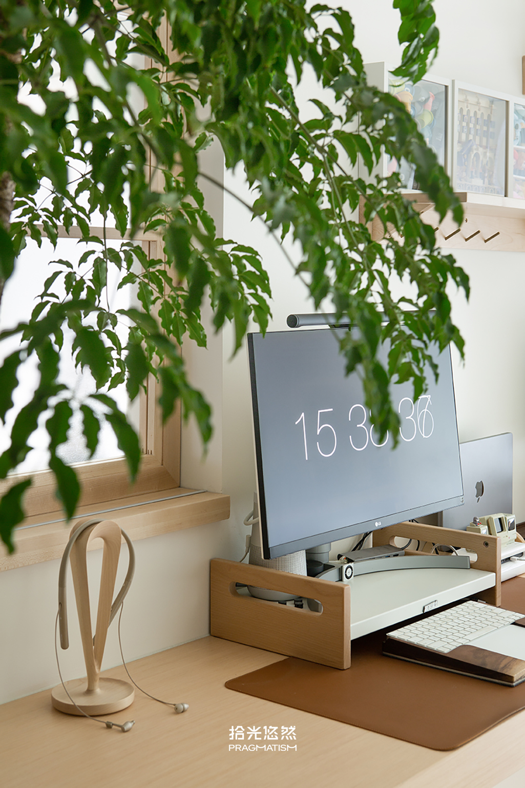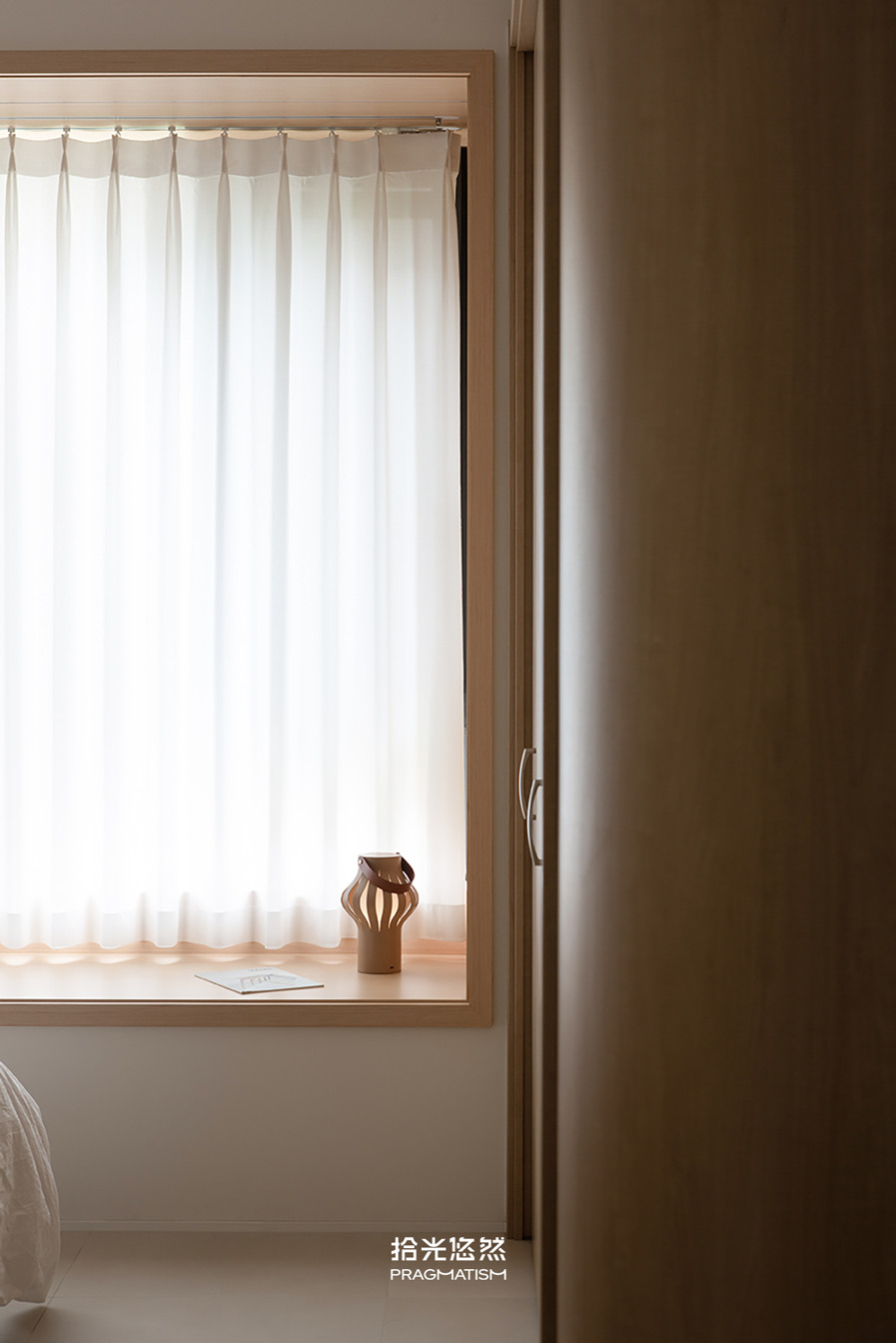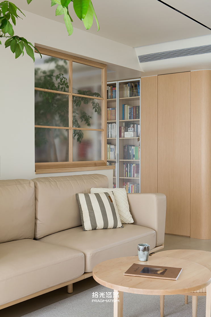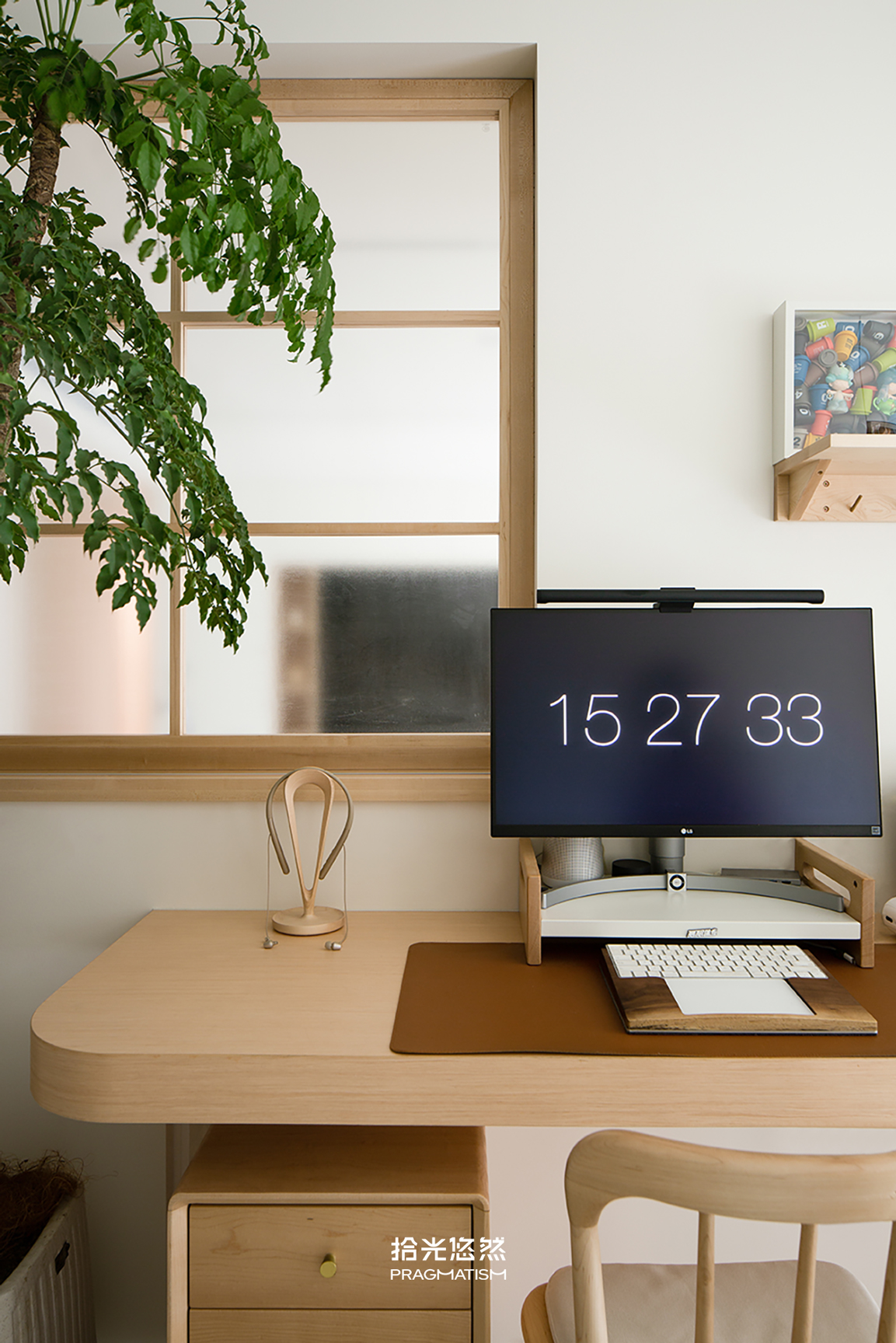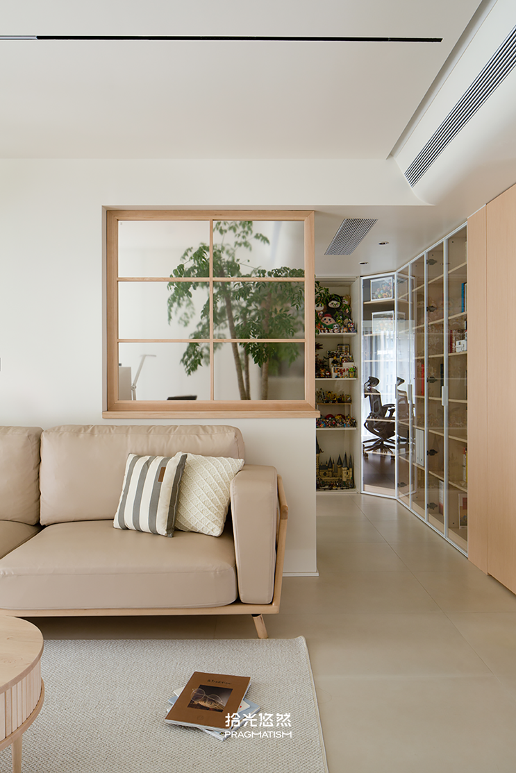 书房由客厅背后的客卧改造而成,与公共区域相通,为了增强空间的交流,设计师巧妙地设计了一扇木窗,让书房与客厅可以相互观望。这扇木窗不仅让光线充分进入书房,同时也让家庭成员之间能够保持互动和联系。