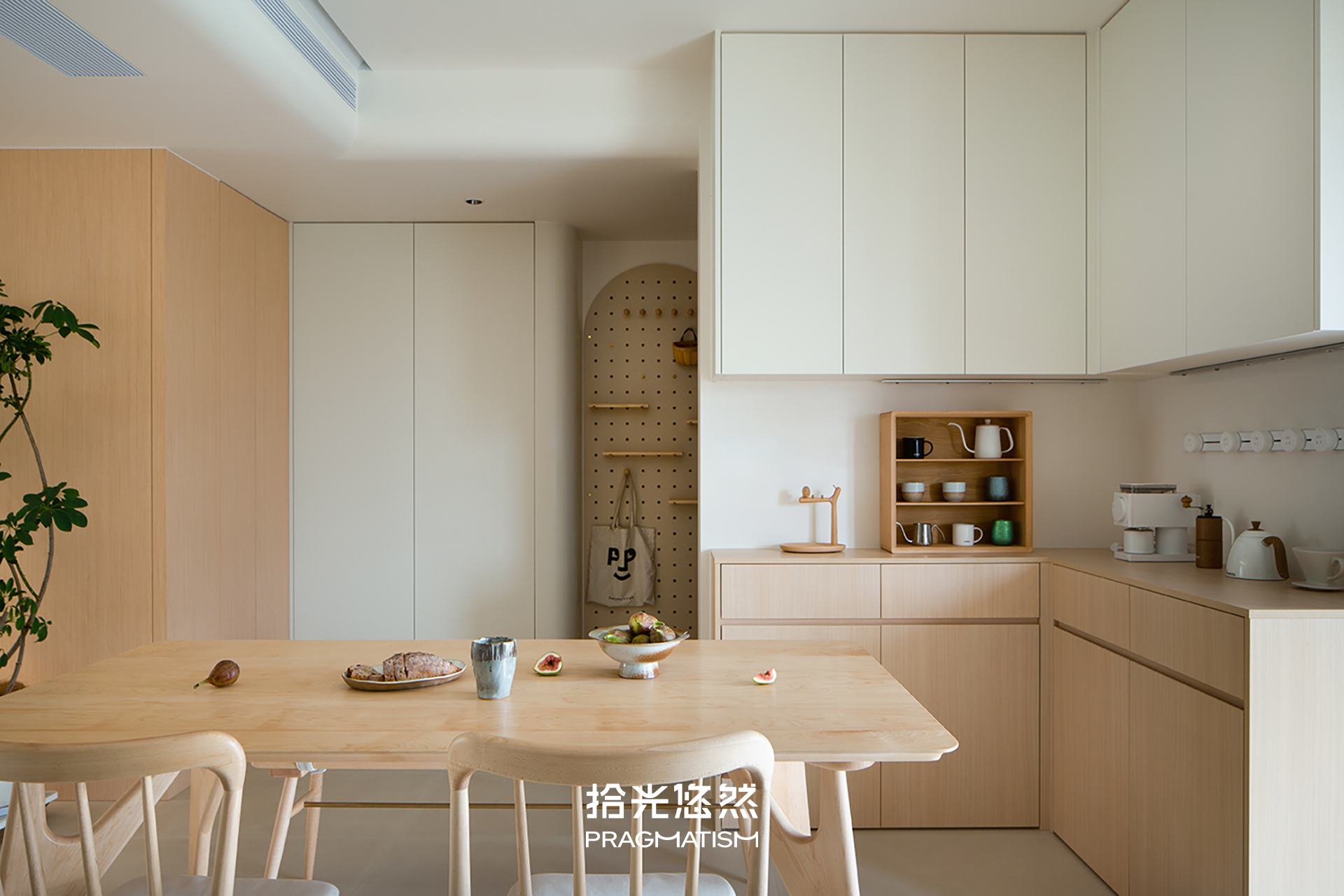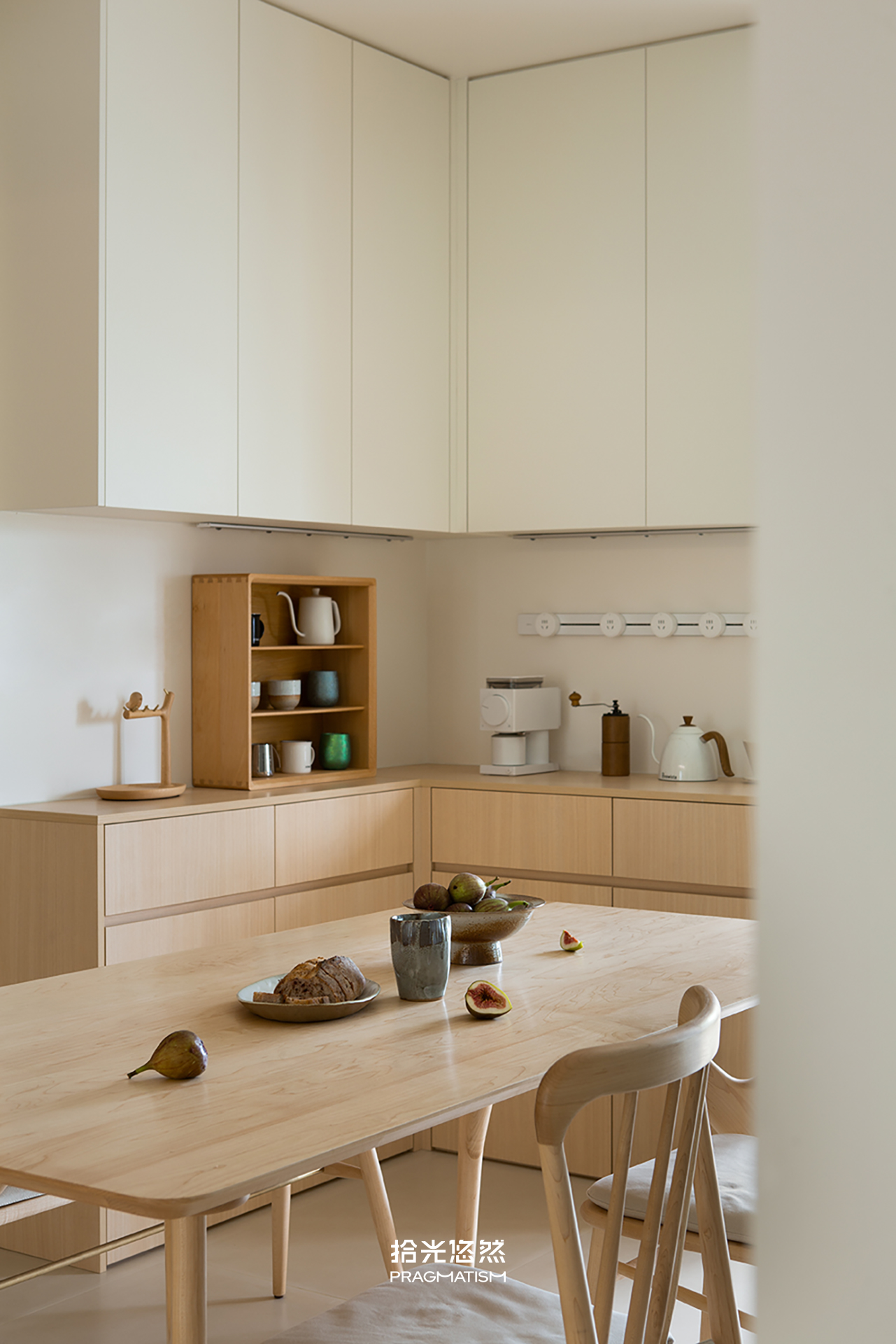 在餐厅的一角设计了原木色+白色的餐边柜,不仅具有充足的收纳功能,安装的轨道插座,让这里也成为餐厅的茶水台。一个小巧的杯架,上面摆放着家人喜欢的杯子、茶具。手摇磨粉后,手冲壶沁润滤纸,再一点点在咖啡粉上画着圈,滴答滴答……休息日的悠闲时光,享受一杯自己制作的手冲咖啡,惬意美妙到了极点。