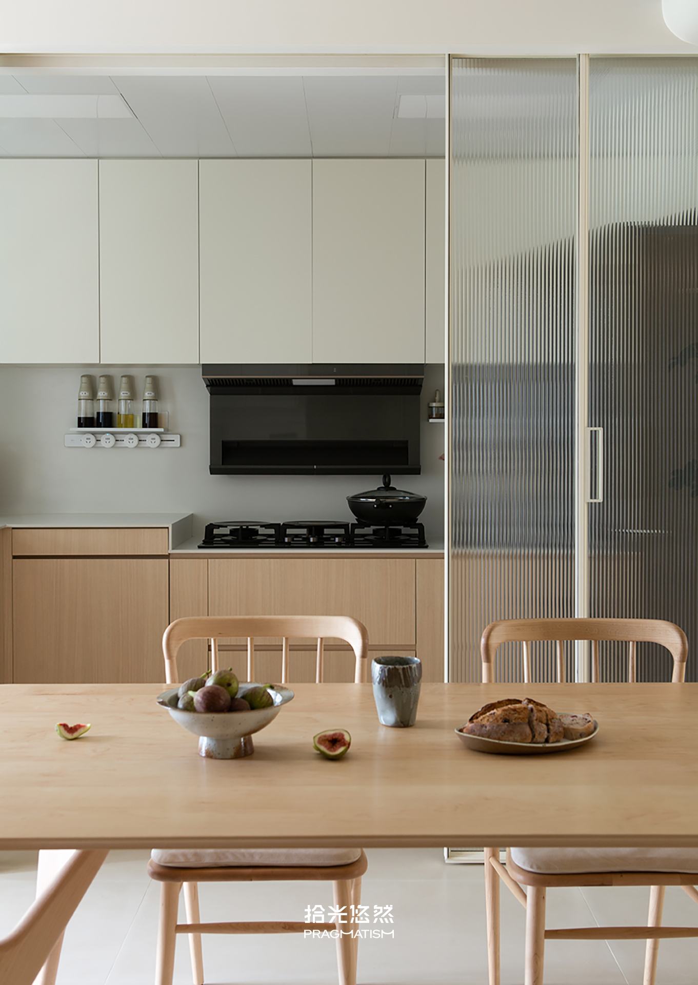 ❷ 厨房拆除了门洞墙体,改为长虹玻璃的推拉门,增加厨房的通透视觉。