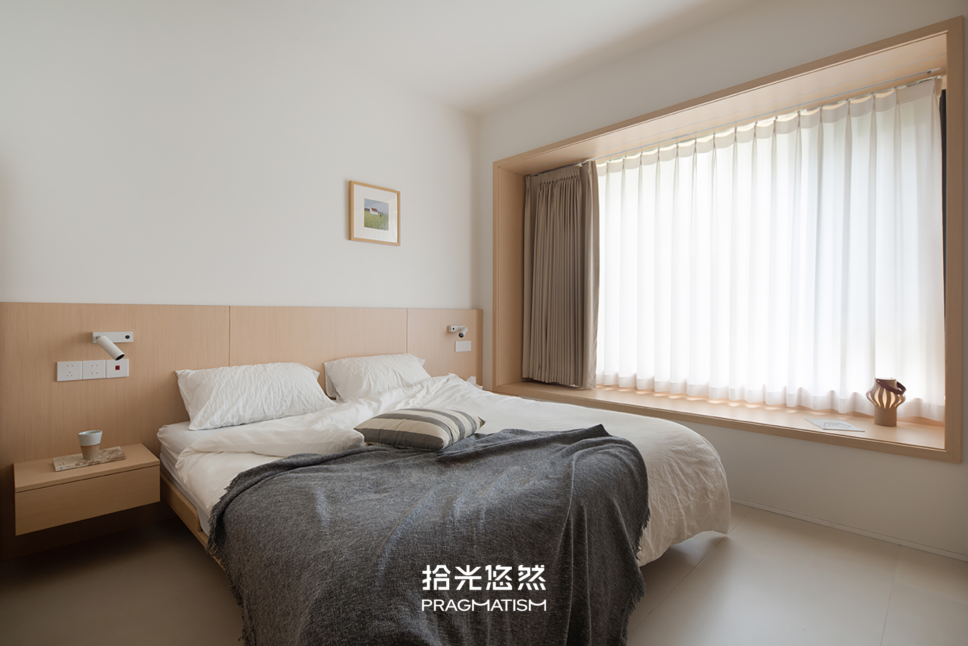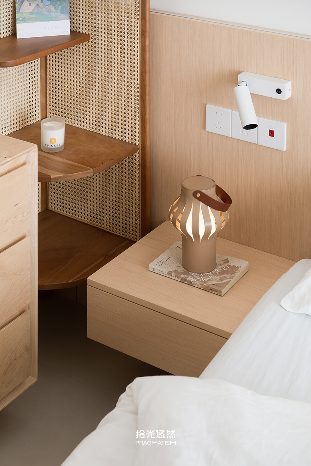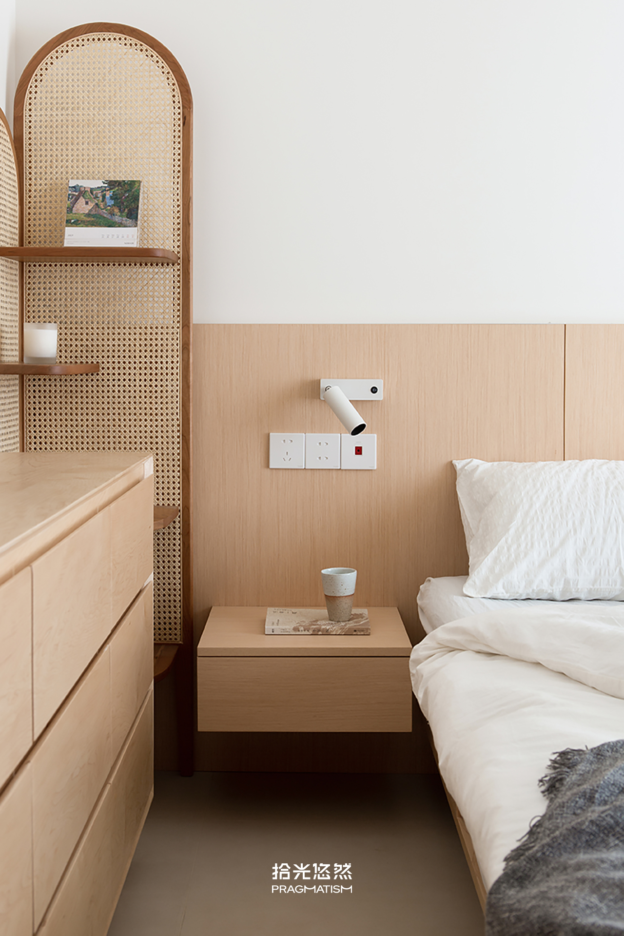 主卧是一个温馨而舒适的空间,原木家具、木床屏、藤编置物架……卧室充满了自然、简约和舒适的气息,飘窗采用木饰面包裹,与家具的原木调性相匹配,营造出一种自然、简约的氛围。清晨,阳光透过窗户洒进房间,在地板上轻轻跳动,让人感受到生活的美好。