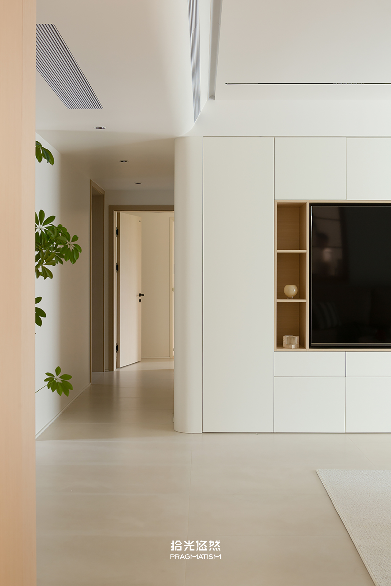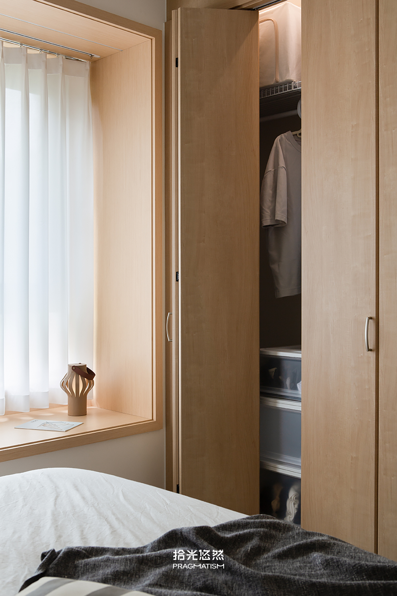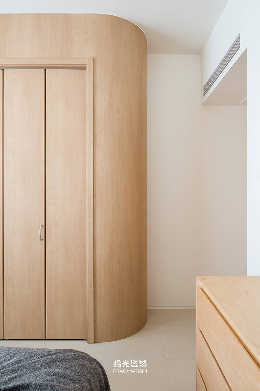 原始的主卧空间没有合适的空间设计衣帽间,为了让屋主能够在这个温馨而舒适的空间中享受美好的生活,设计师设计了储物体量较大的衣橱。衣橱圆弧的设计造型,同样让屋主在进入卧室的视野变得柔和,没有直角的生硬感。拉开折叠门,围合而成的空间,成为小型衣帽间般的存在。