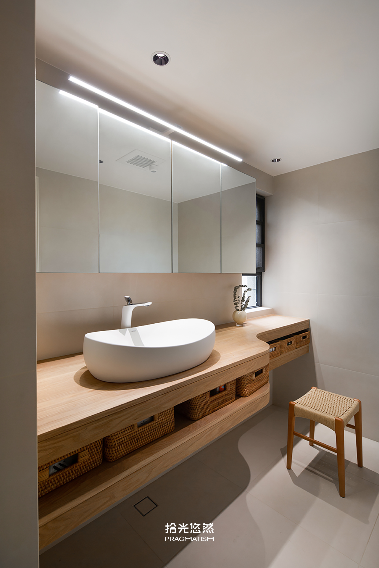 屋主认为客卫存在的淋浴间已经能够满足他们的日常欲求,于是在主卫想要舍弃淋浴功能。为了方便日常的起居生活,设计师保留了洗漱台、梳妆区以及马桶。主卫定制的台面设计师咨询了很多专业的产品知识,使用了阿克苏水性漆,让木质的台面更耐生活用水和雨水的侵蚀。