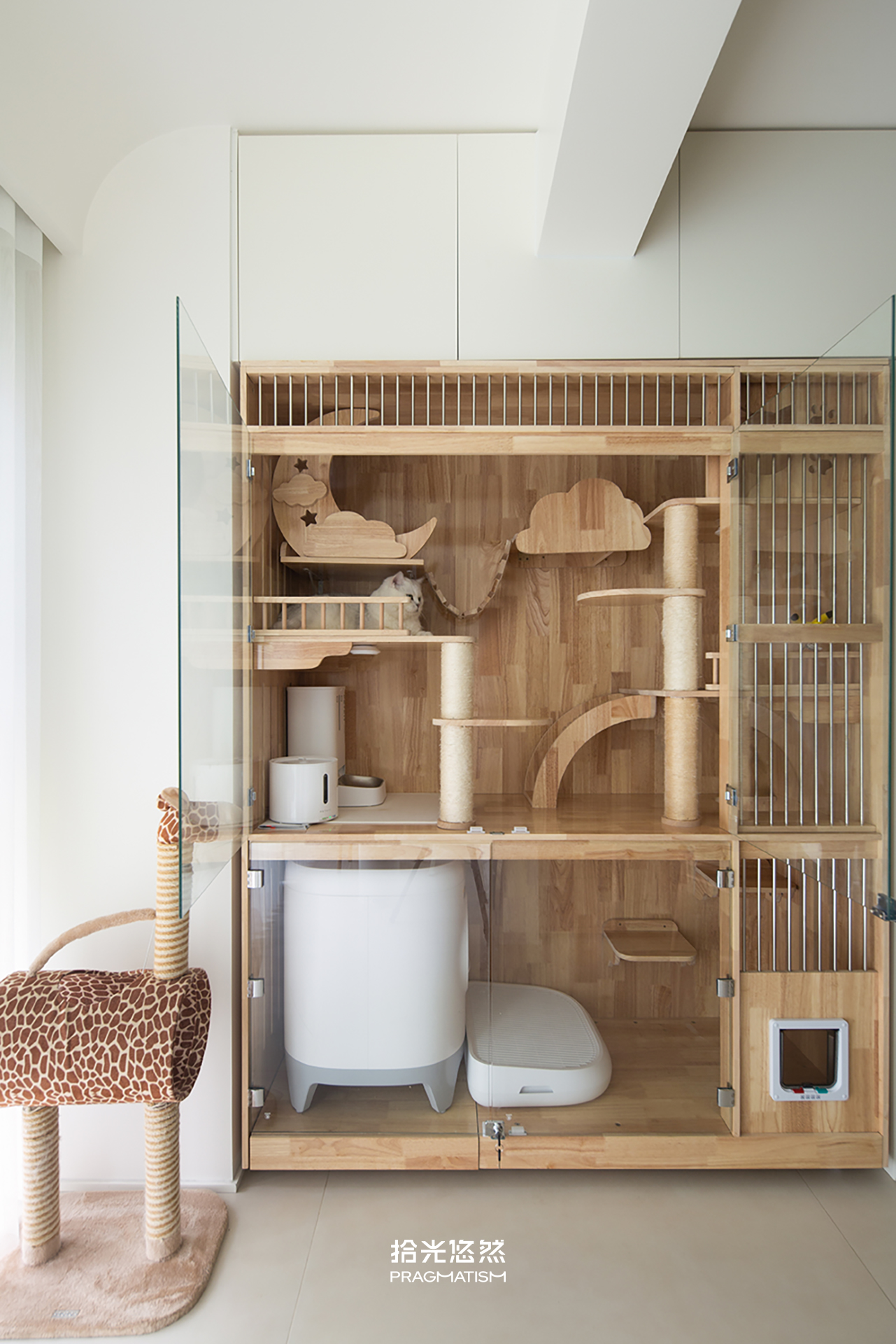 在柜体更深入的地方,是同色系的猫别墅。家里的猫咪在这里吃饭、睡觉、上厕所,享受着专属的舒适空间。猫别墅的设计充分考虑了猫咪的生活需求,让它能够在这里愉快地生活。