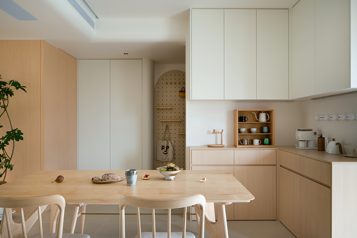 在清晨,屋主匆匆忙忙地出门上班。他们可以在玄关快速找到要穿的鞋子,然后顺手把包包从洞洞板上取下。设计师把生活经验注入在生活的每个角落,让屋主在忙碌的早晨也能保持有序,避免遗漏重要物品。