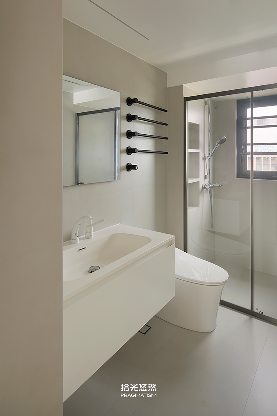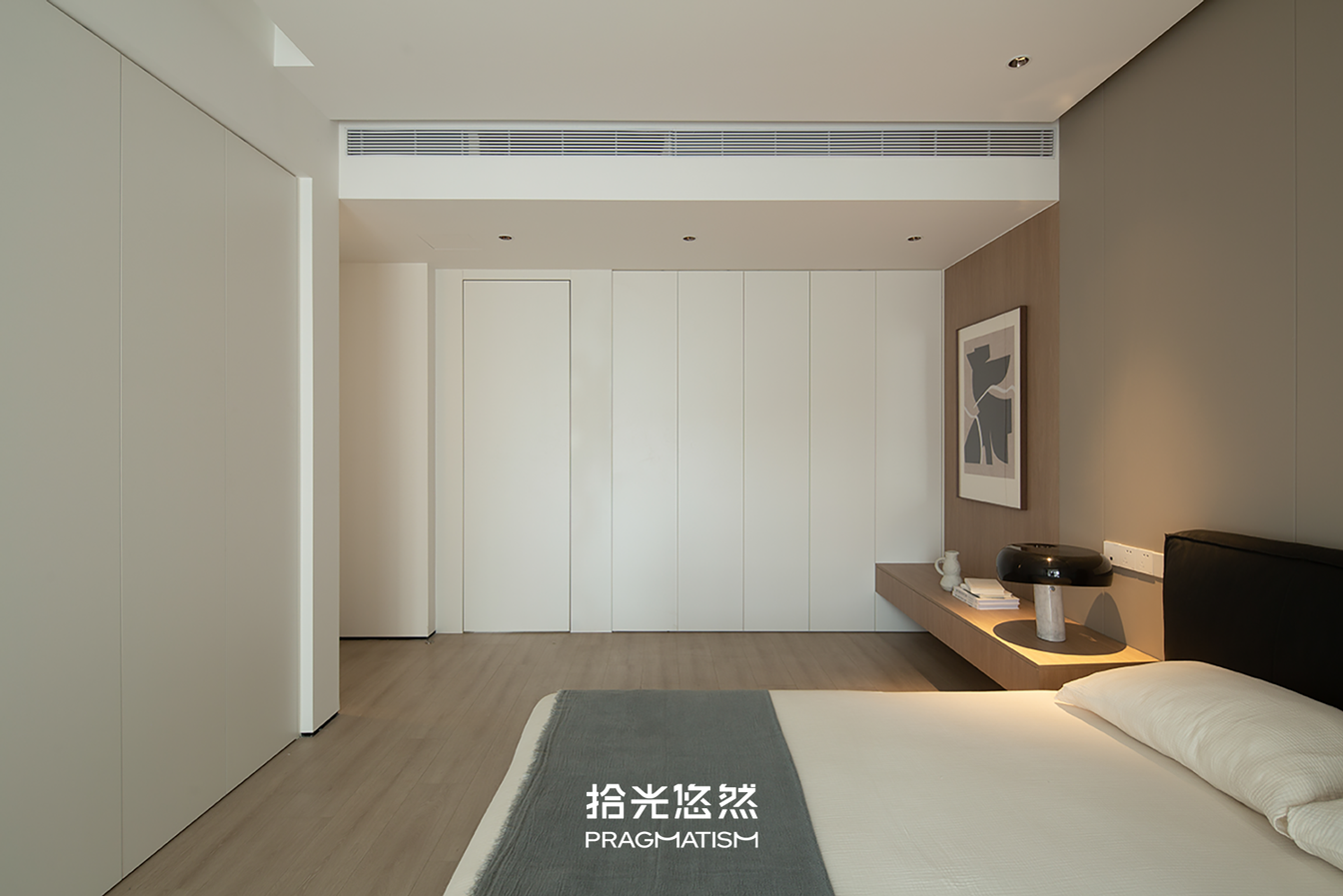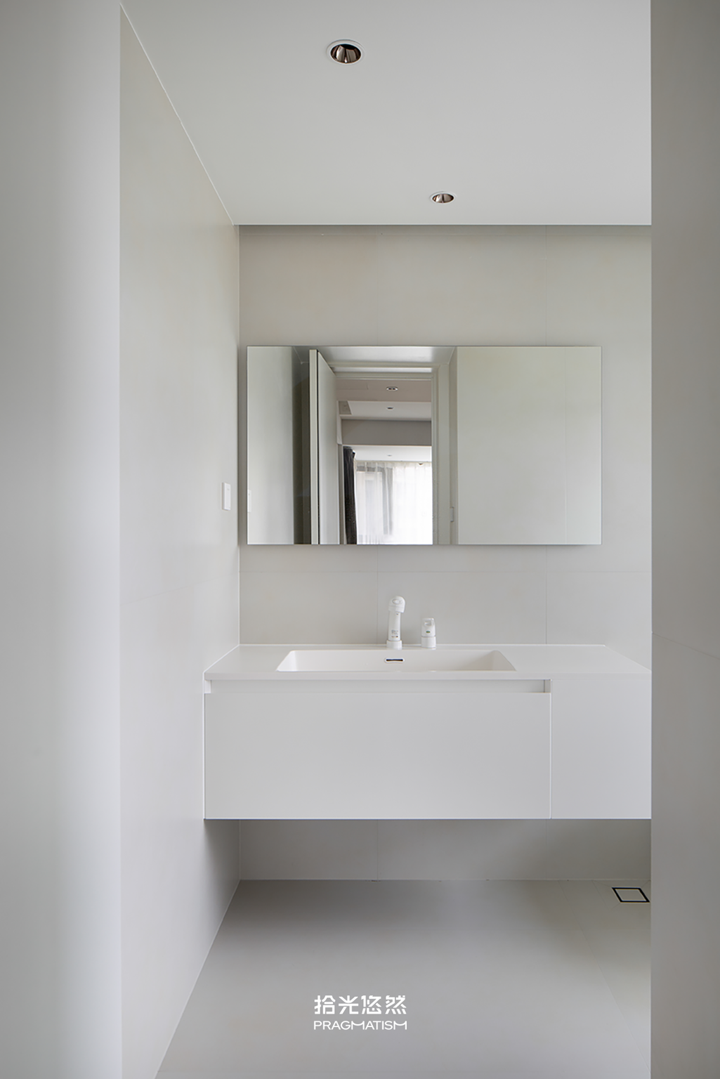 其次,我们将墙面、柜体以及主卫隐框门做成同色,使得整个空间看起来更加整洁、干净。