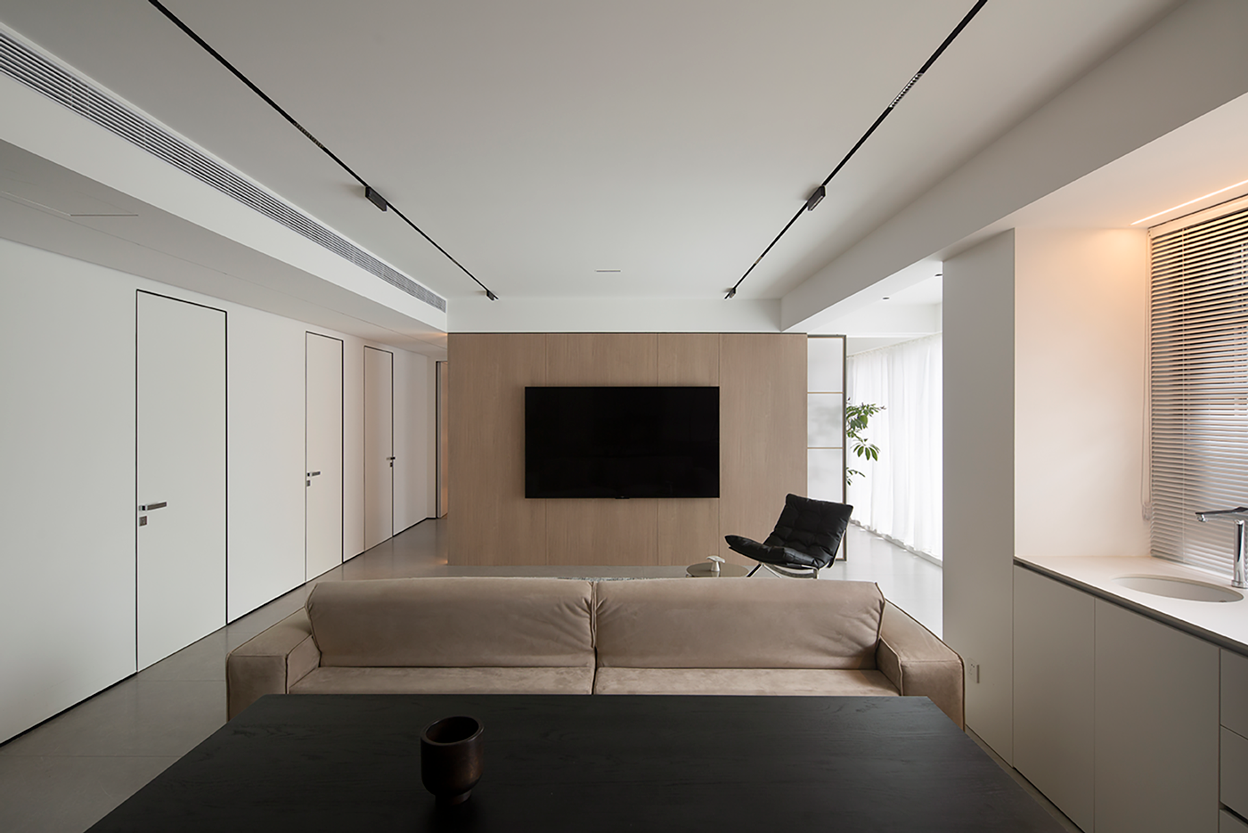 两扇隐藏在墙体里的口袋门,能够让书房在封闭与互通之间灵活切换。关闭口袋门,书房可以变为封闭的空间,以满足隐私需求。当书房开敞时,书房与客厅之间形成洄游动线,使得空间的互动性和联系性更强。