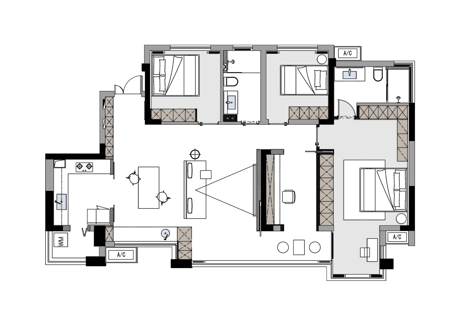 我们向书房和主卫进行了压缩,以增加主卧的储物量。我们将书房的空间进行了压缩,通过精心设计,使得书房内的书柜、书桌和椅子等家具更加紧凑,从而减少了书房的占用面积。同时,我们还为主卧增加了储物空间,以满足屋主对于衣物、鞋子、被子等物品的收纳需求。