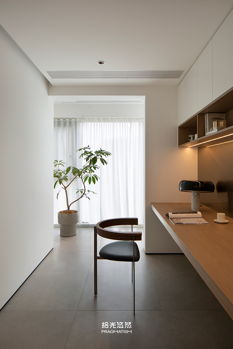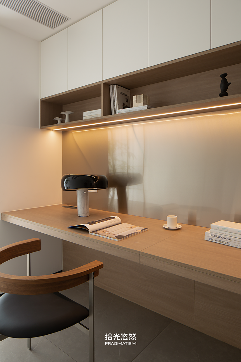 在设计家居空间时,考虑到男主人在家有办公的需求以及未来宝贝上学后需要学习、写作业的地方,书房成为他们必不可少的空间。为了满足这一需求,我们为屋主设计了半开放式的书房,让空间既能够保持独立,又能够方便互动。