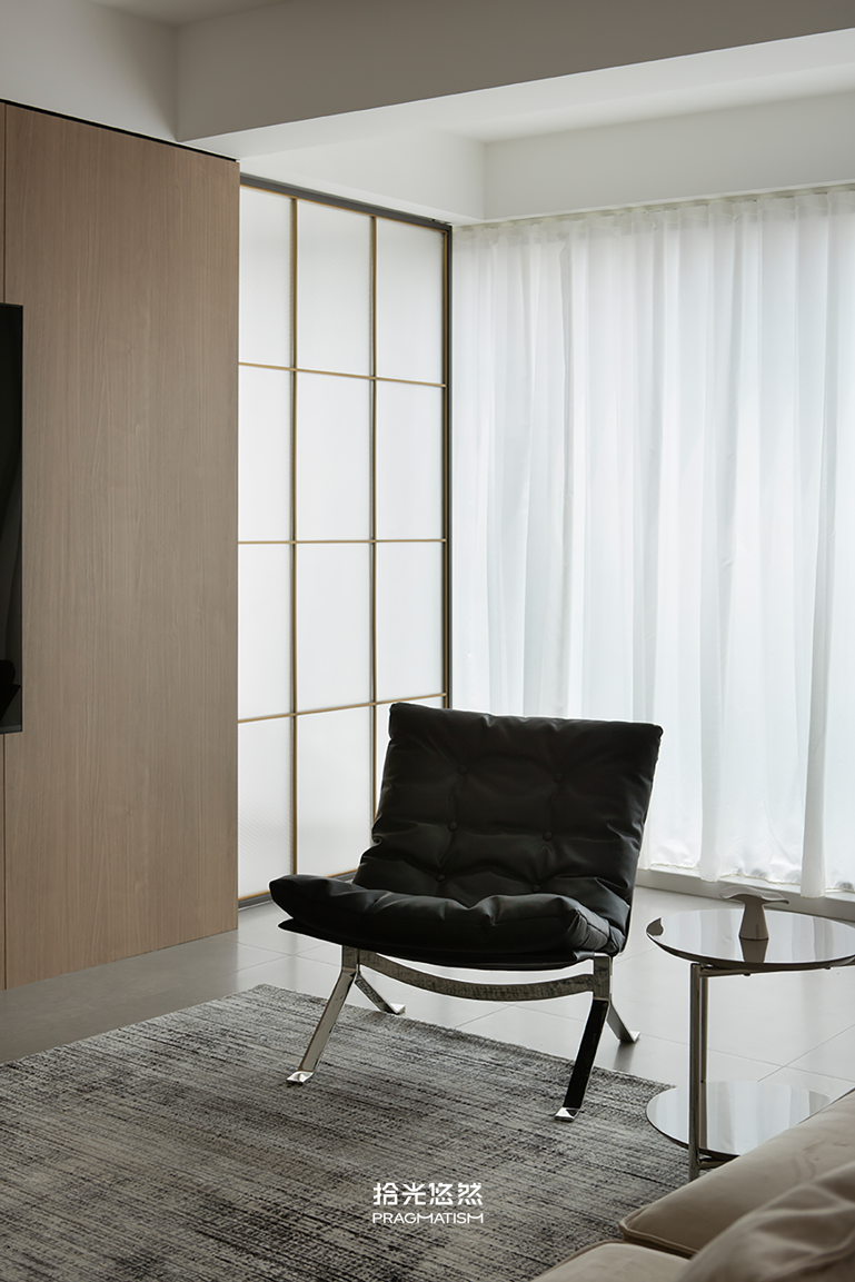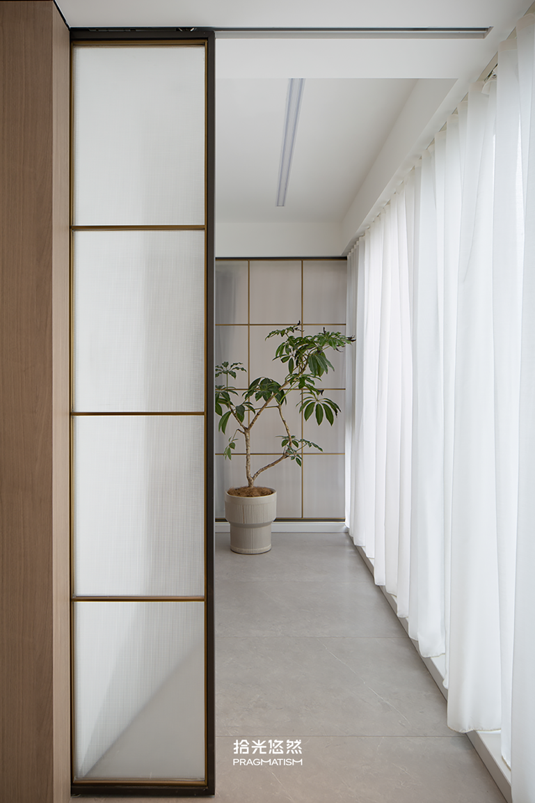 休闲阳台部分空间划分给主卧,用玻璃隔断阻隔,增加主卧空间的同时,也增加了阳台的延伸感,增设的窗帘也无需担忧主卧的隐私性。