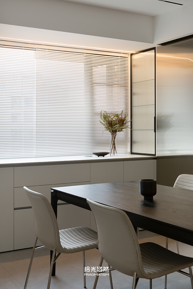我们在餐厅旁增加了西厨柜+家政柜,增加西厨柜和家政柜作为厨房的补充功能,使得整个家居空间的功能更加完善,同时也提高了空间的使用效率。预先规划的水位和可升降插座,让屋主可以方便地洗水果和准备茶水,这样的设计考虑到了生活的细节,让人感到非常贴心。嵌入的玻璃柜体内部规划了电路,屋主能够放置一些微波炉、饮水机等小型厨用电器,让使用更为方便快捷。这种设计既现代又实用,为家居生活带来了更多的便利。