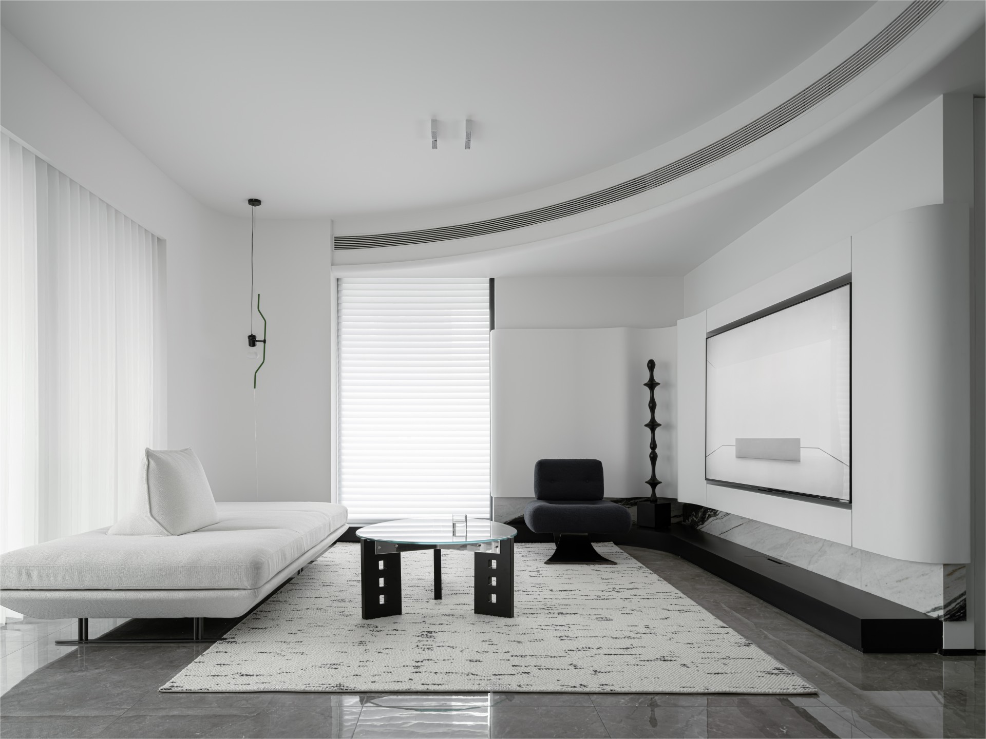 顺着弧线的指引,墙角被打磨成圆润的模样,圆弧地毯如同涟漪般舒展在地面,电视墙也以流畅的曲线回应着这份温柔。黑白极简的线条在空间里游走,时而笔直刚硬,时而婉转灵动,理性与感性在此刻完美交融。