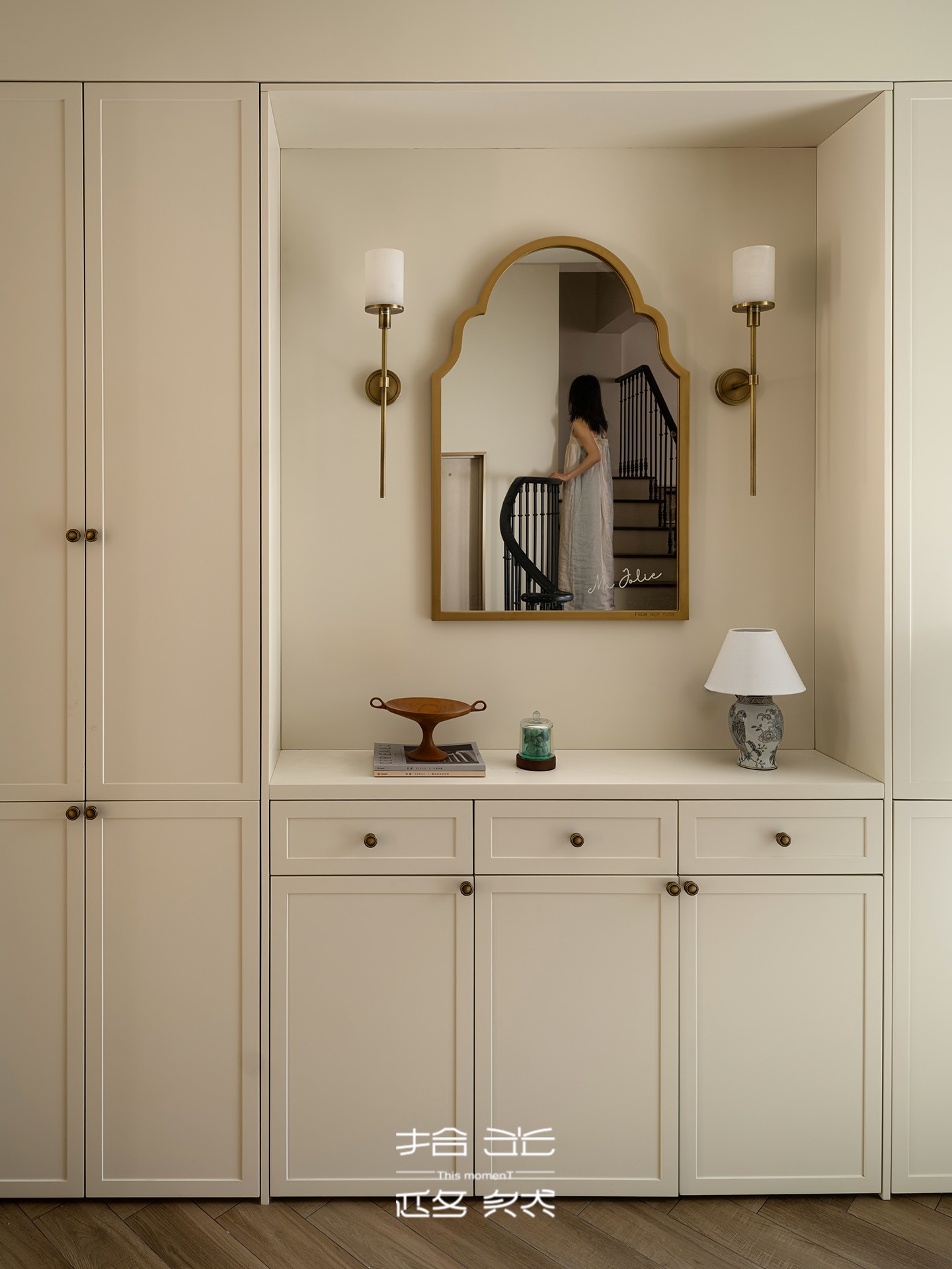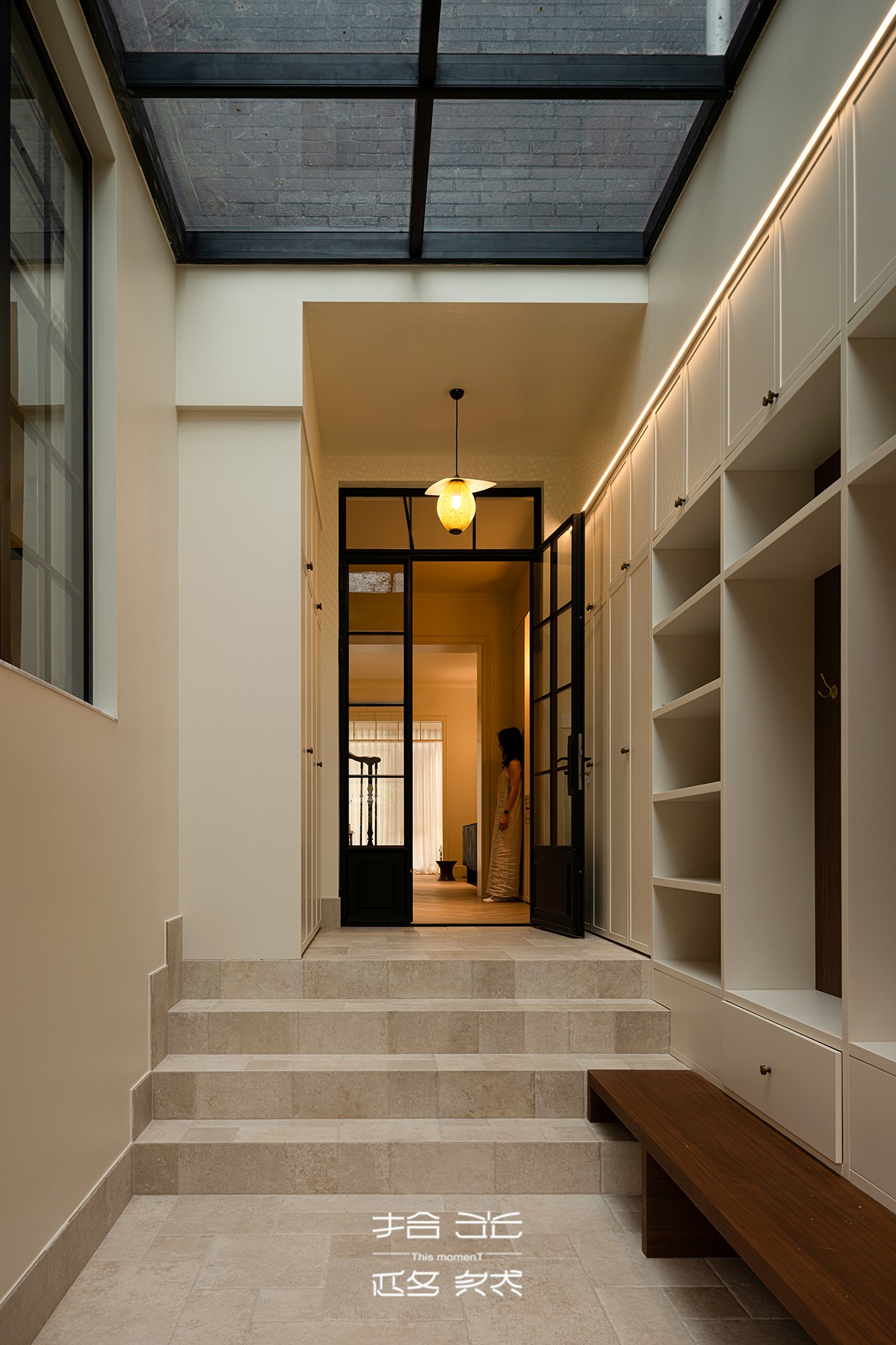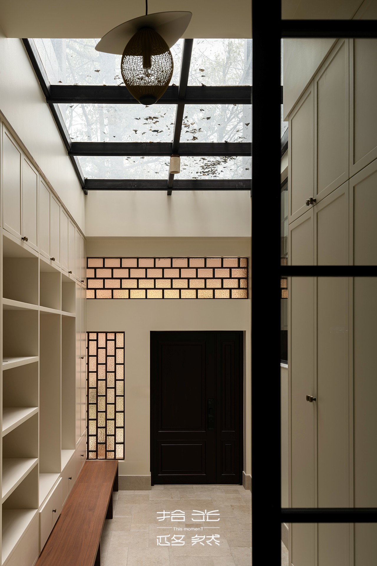 门厅,作为家的第一印象,承载着欢迎与期待的情感。此次设计,我们特别注重光与空间的互动,采用了独特的玻璃顶设计,将自然的馈赠——光,巧妙地引入室内。每当阳光洒落,门厅便沐浴在温暖而明亮的光辉之中,仿佛被赋予了生命与活力。