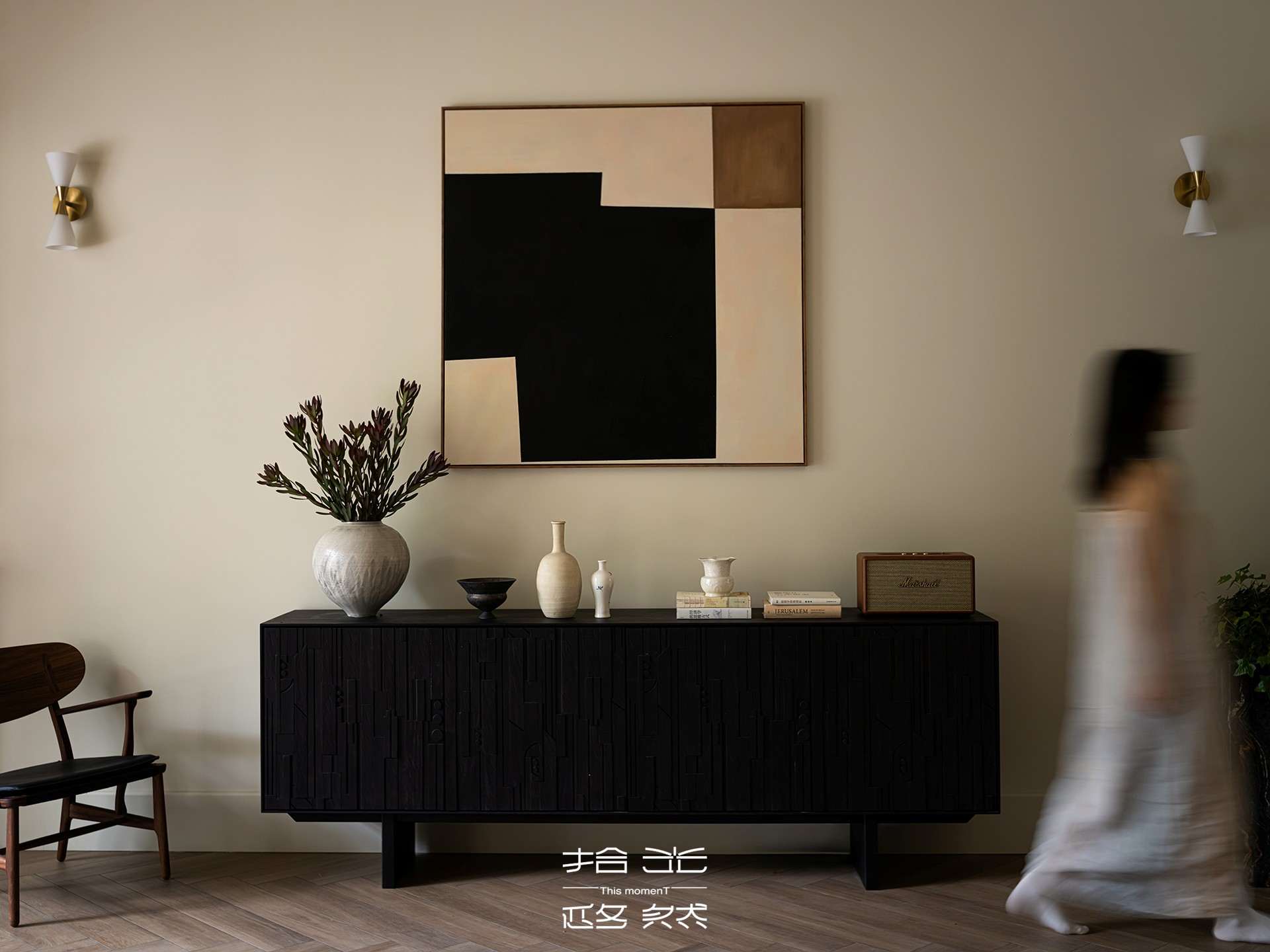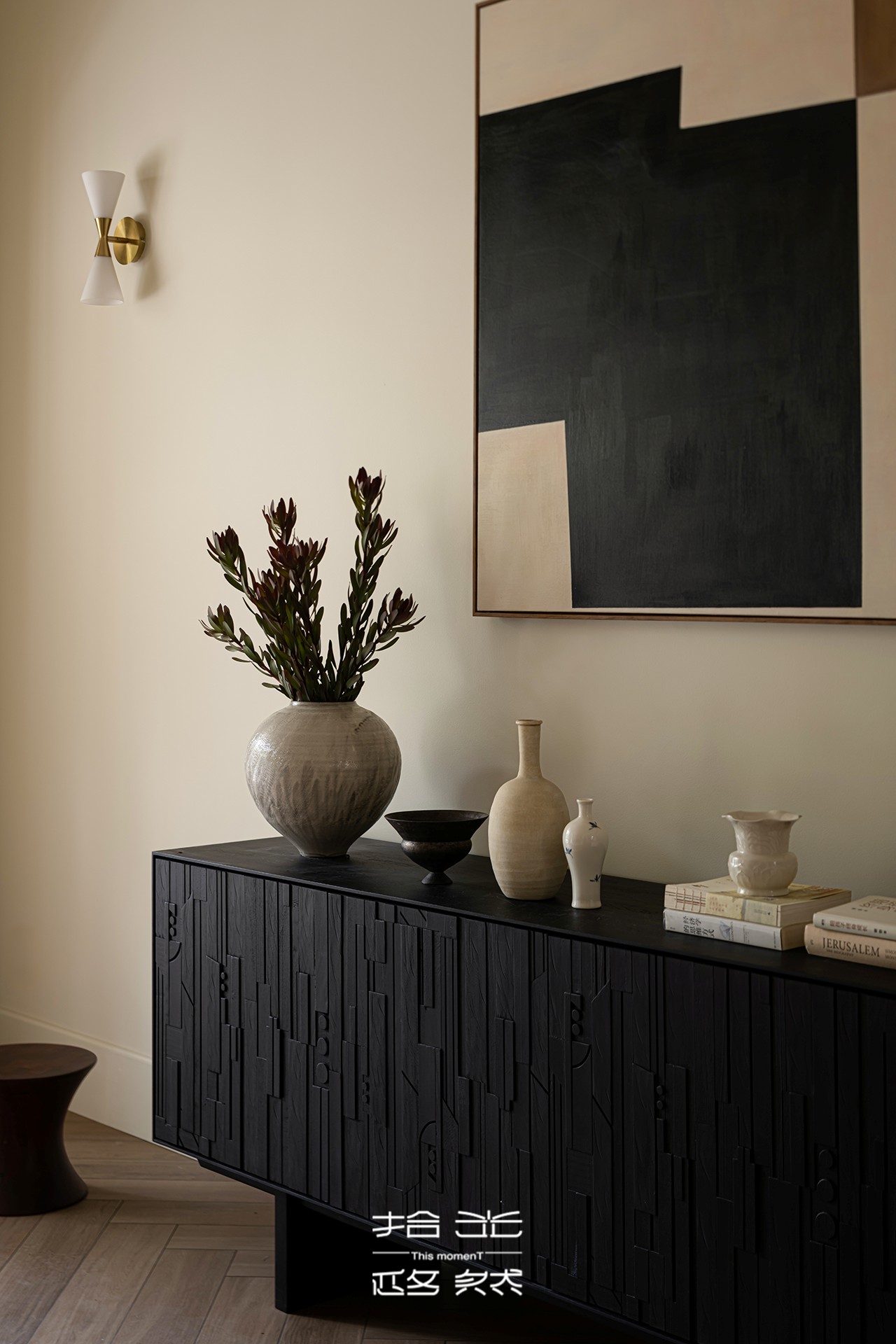 黑色的玄关柜,表面有手工雕刻的肌理,摸上去是凹凸的故事感。它像个沉默的生活容器,盛着陶罐里的枝桠、旧碗里的时光,和书脊上的温度,每一件器物都在说「我和这个家,一起生长」。
