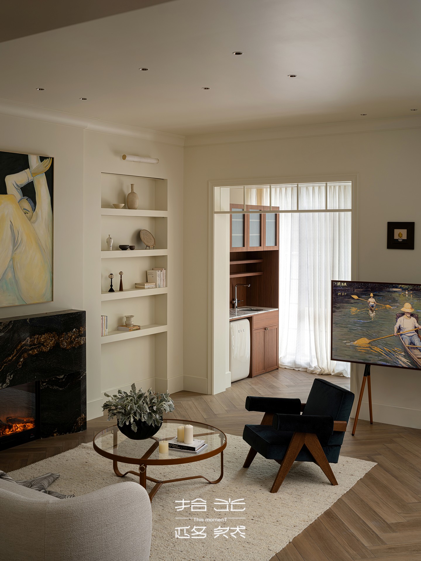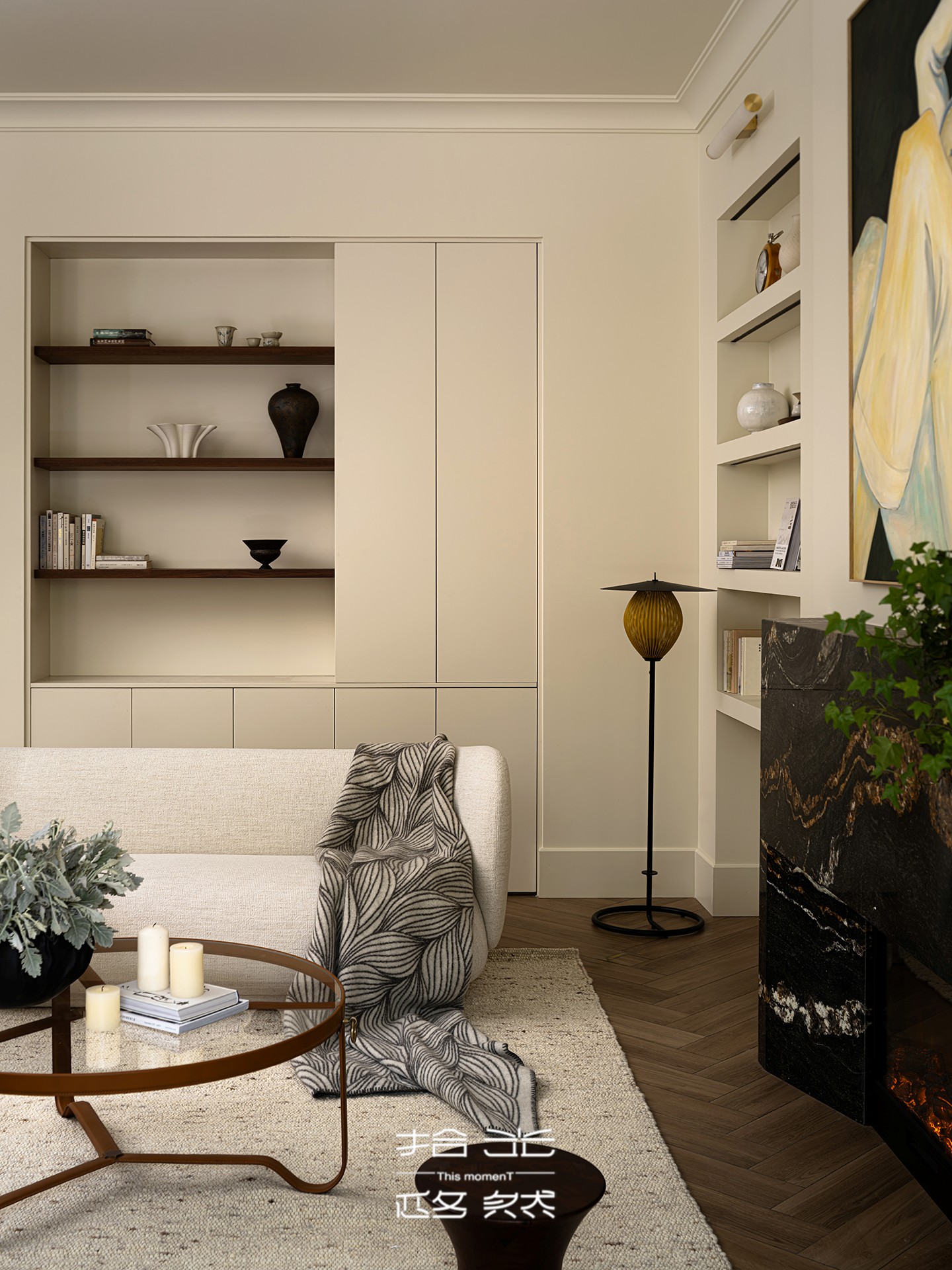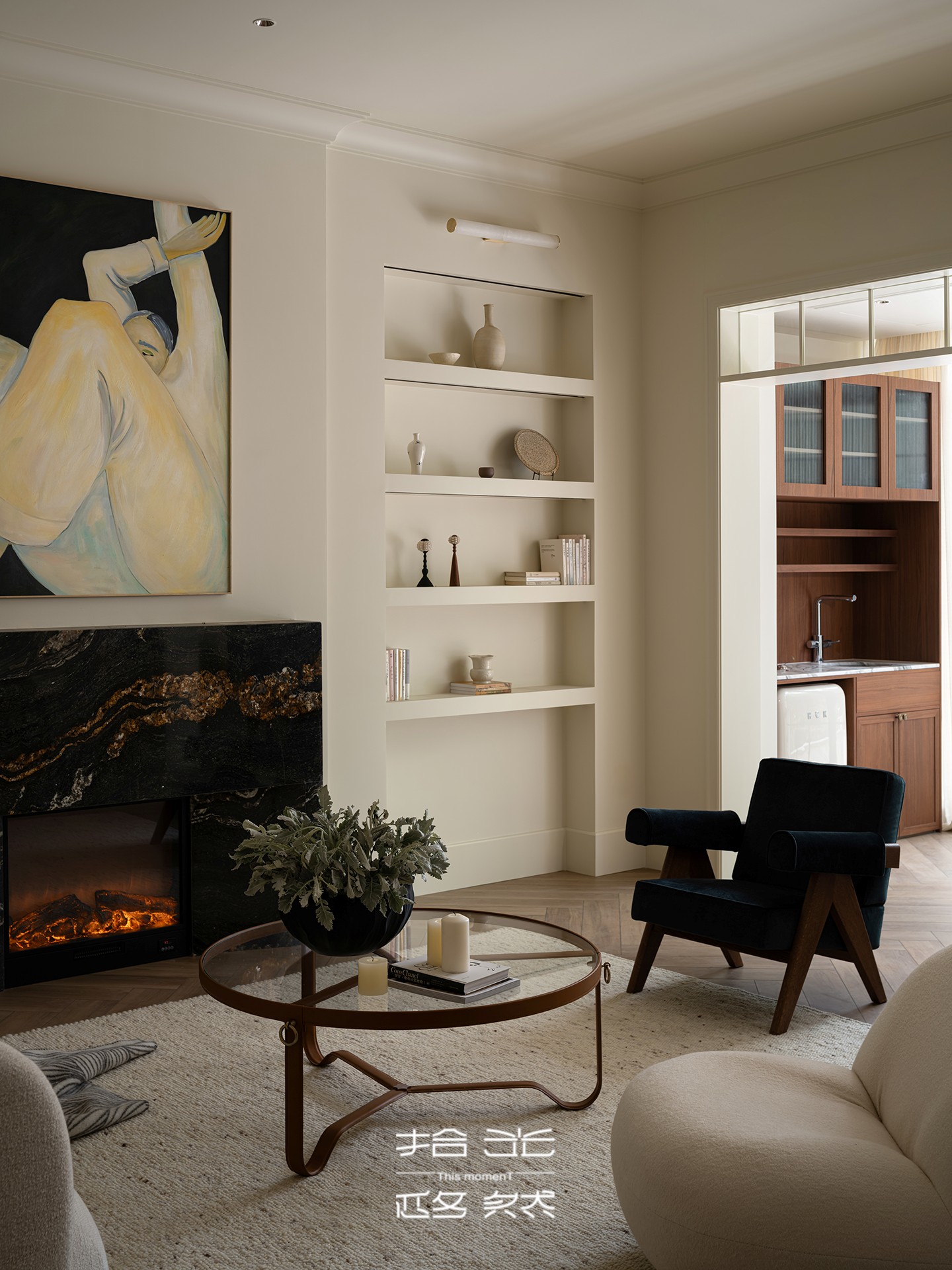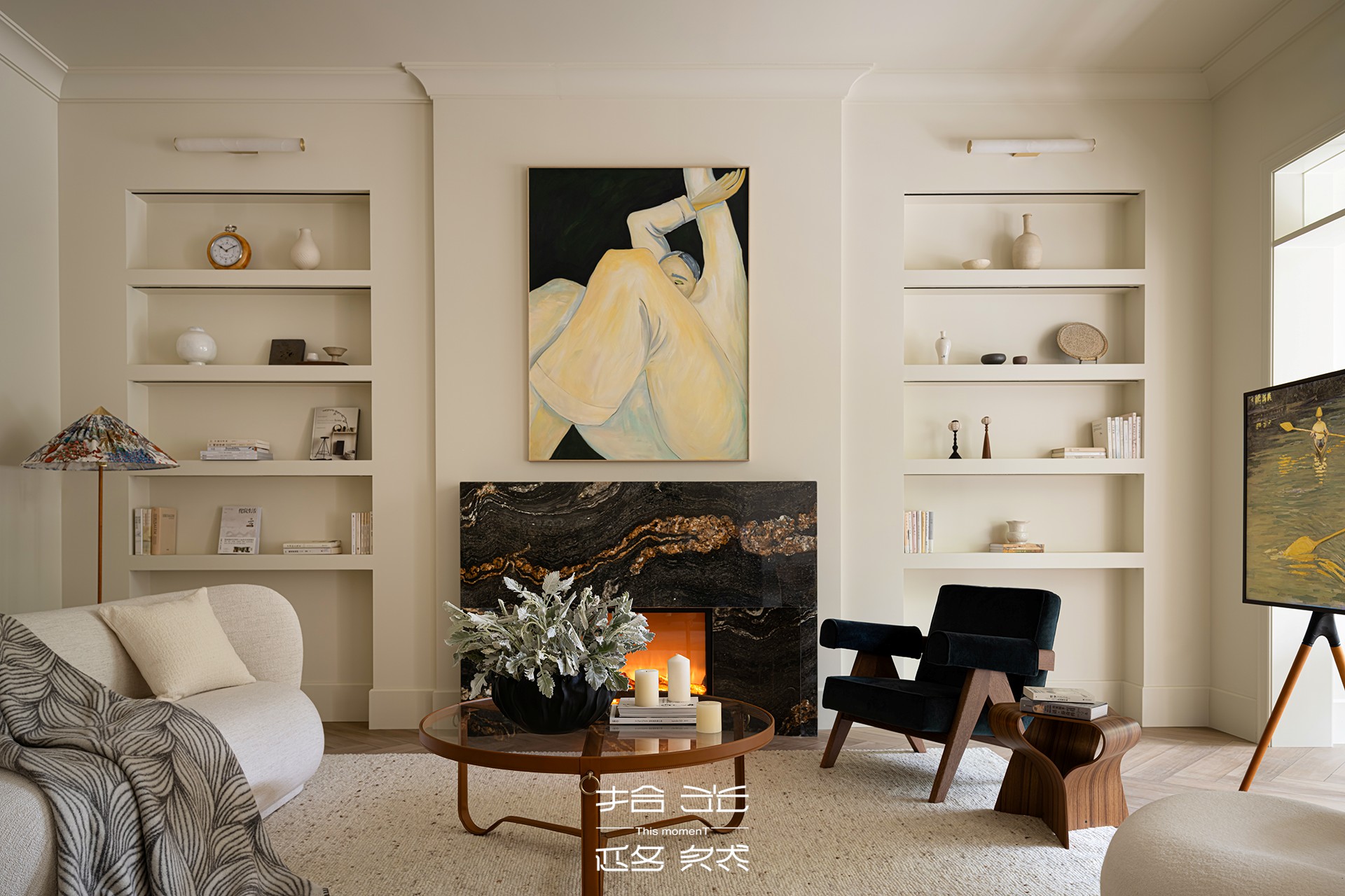 这种低饱和的温柔,让深色的壁炉石材、墨绿单人沙发,都成了画龙点睛的情绪锚点,冲突里藏着细腻平衡。