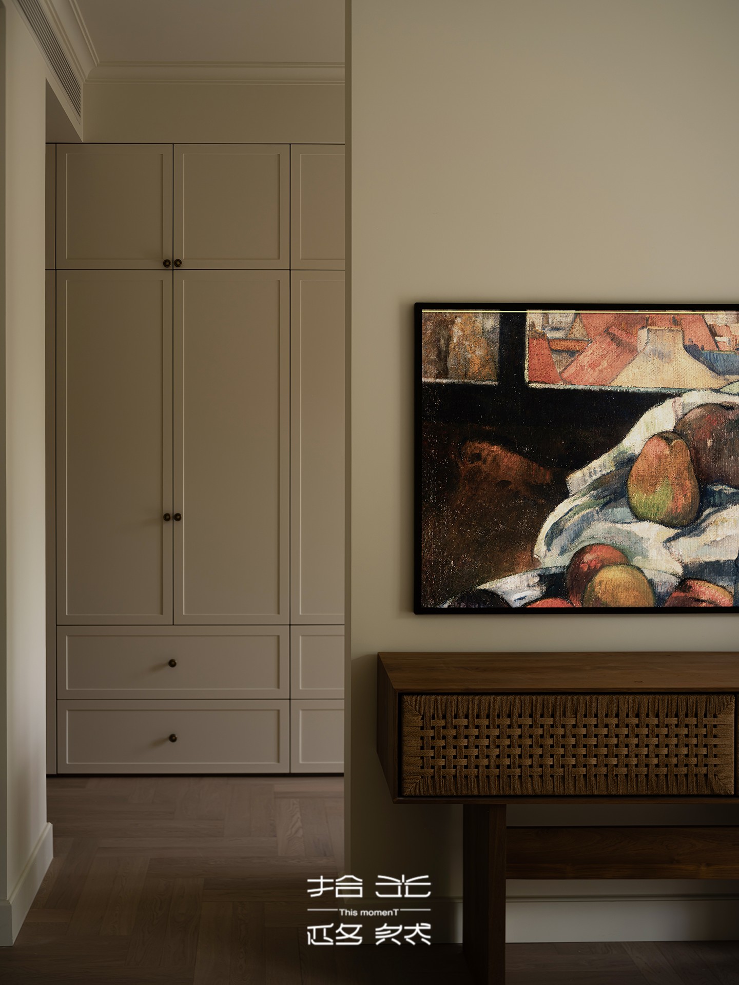 床尾电视墙背后是大面积的衣帽间,没有刻意的华丽,却用温润的木作、合理的分区,把四季衣物与被褥,都「收」成生活的诗意。