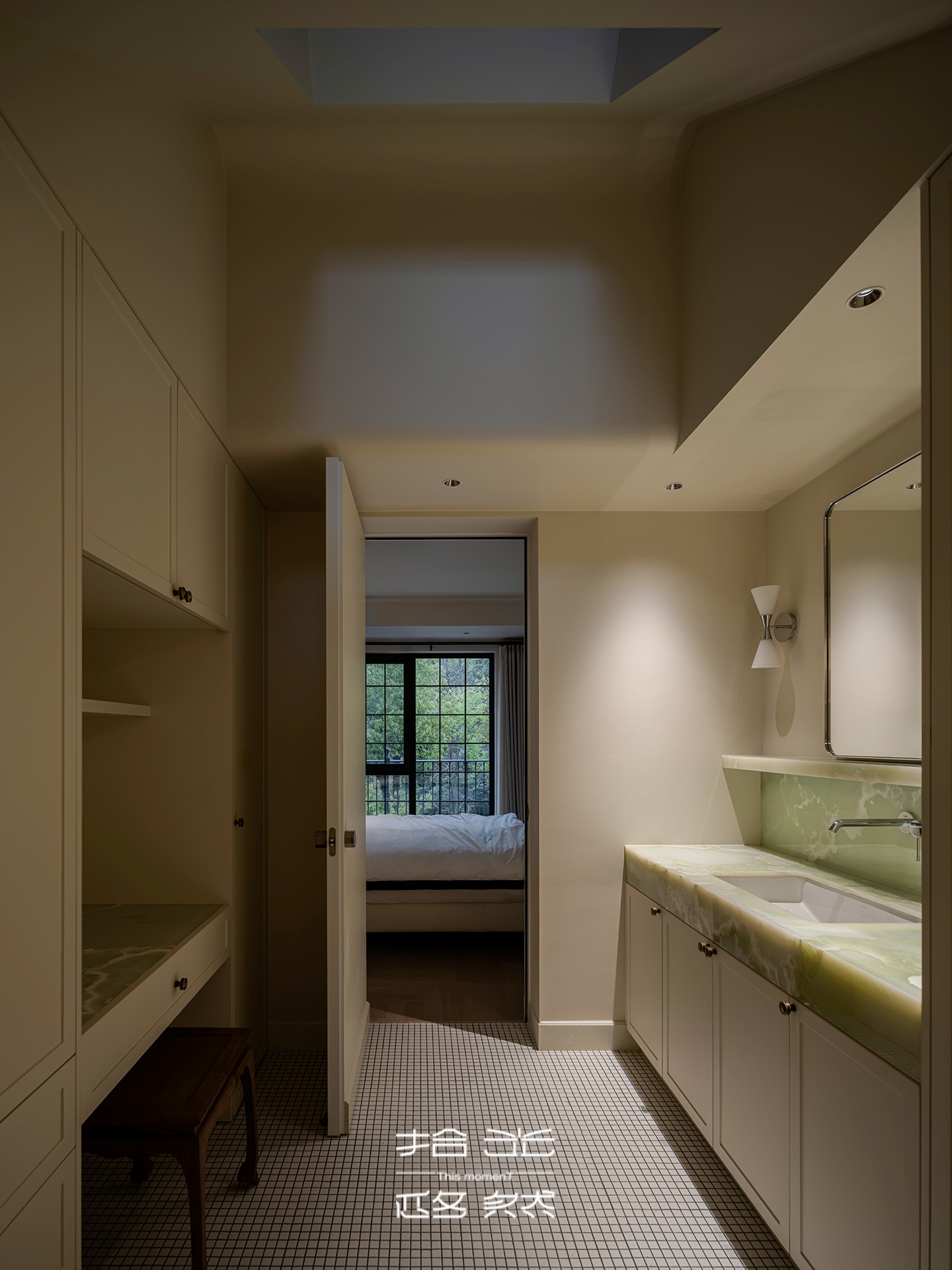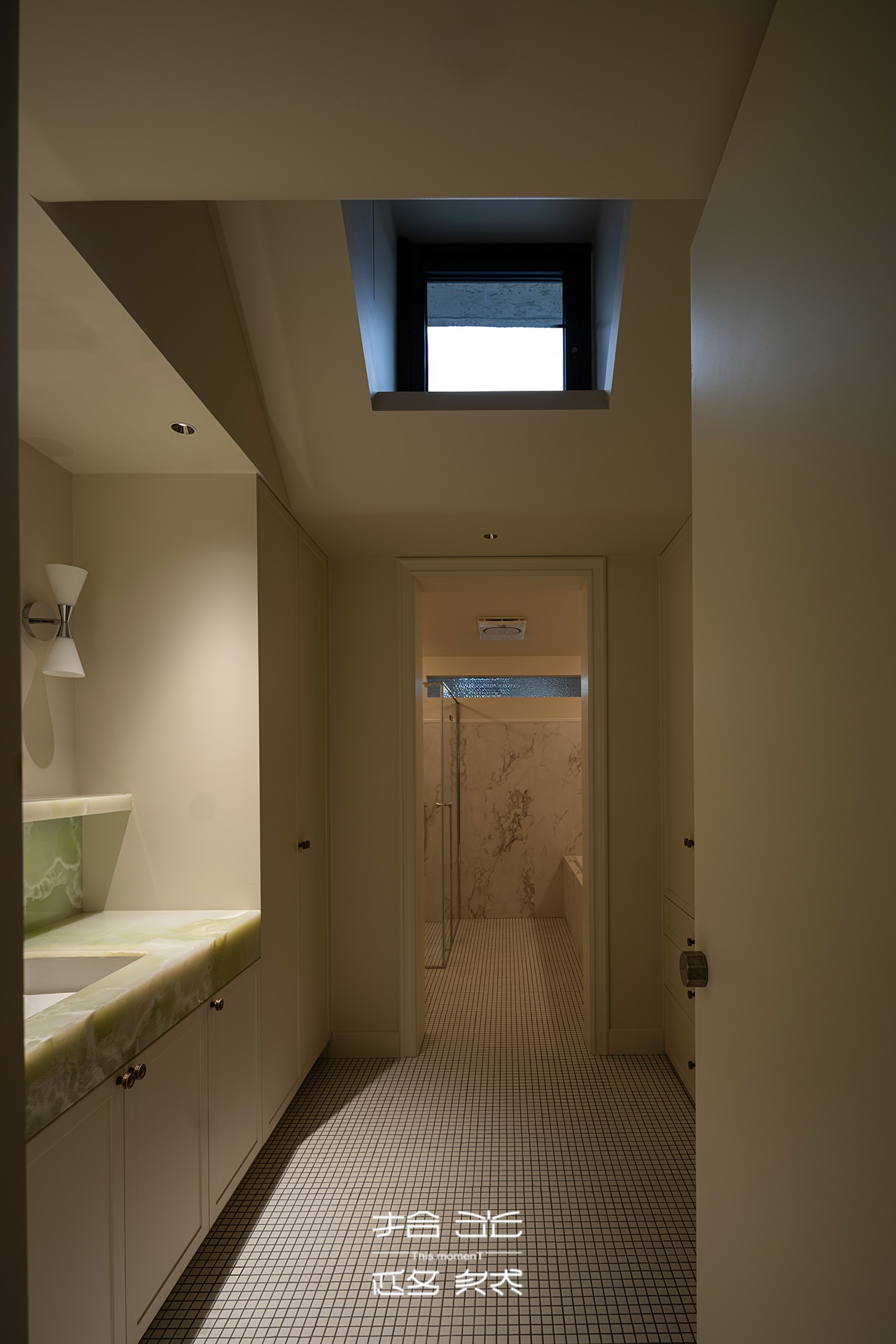 浅米色墙面接住天窗的光,在长条形空间里,织出明暗交错的网。尽头的淋浴区、手边的洗漱台,被光轻轻划分,却又连成一片呼吸的场所,让每一次踏入,都像被宁静包围。