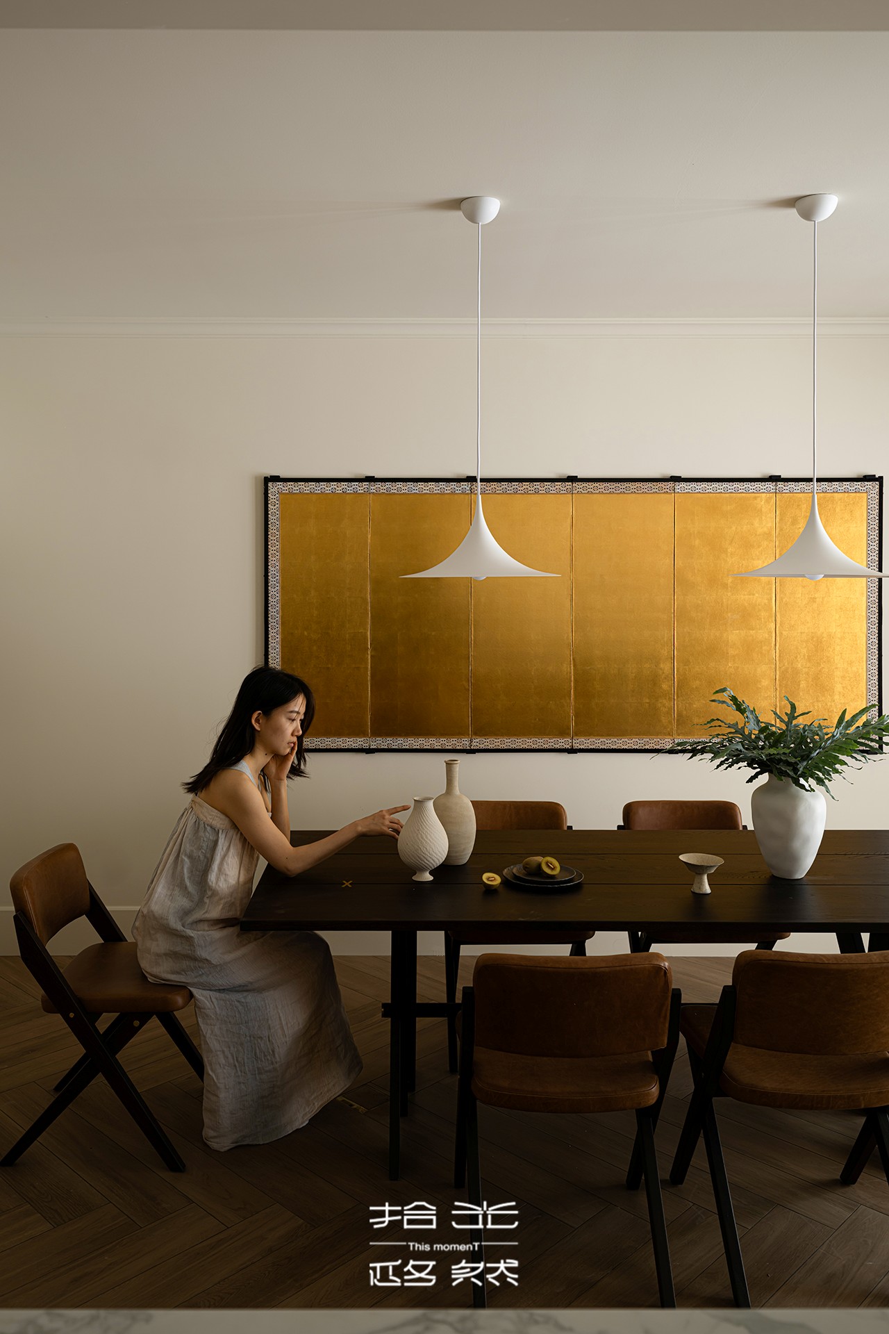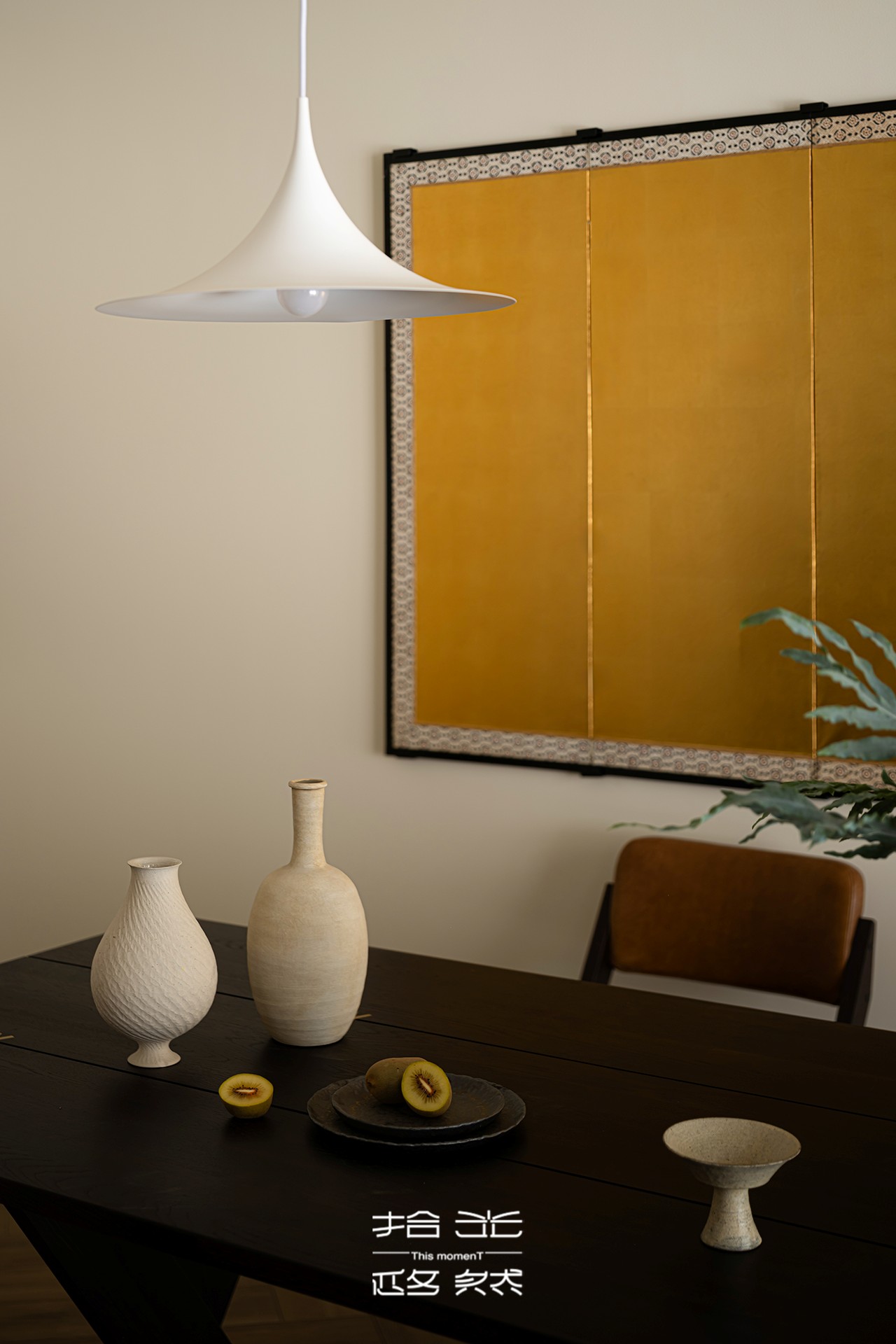 浅米色墙面,静静托住那幅金色屏风。日光漫进来时,金箔的光泽会轻轻晃,和浅墙的温柔碰撞,在空间里揉出一层暖金滤镜,连空气都沾了几分静谧。