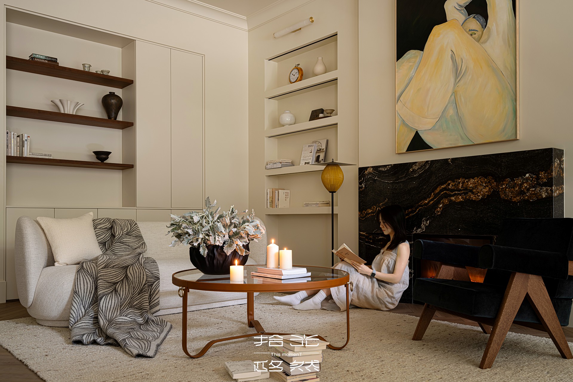 墙面的天然肌理与低饱和度,无声勾勒出宁静的空间底色。墙面选了接近奶霜的浅米色,不是直白的白,而是像清晨七八点的阳光,被纱帘滤过、晕开,轻轻覆在空间里。