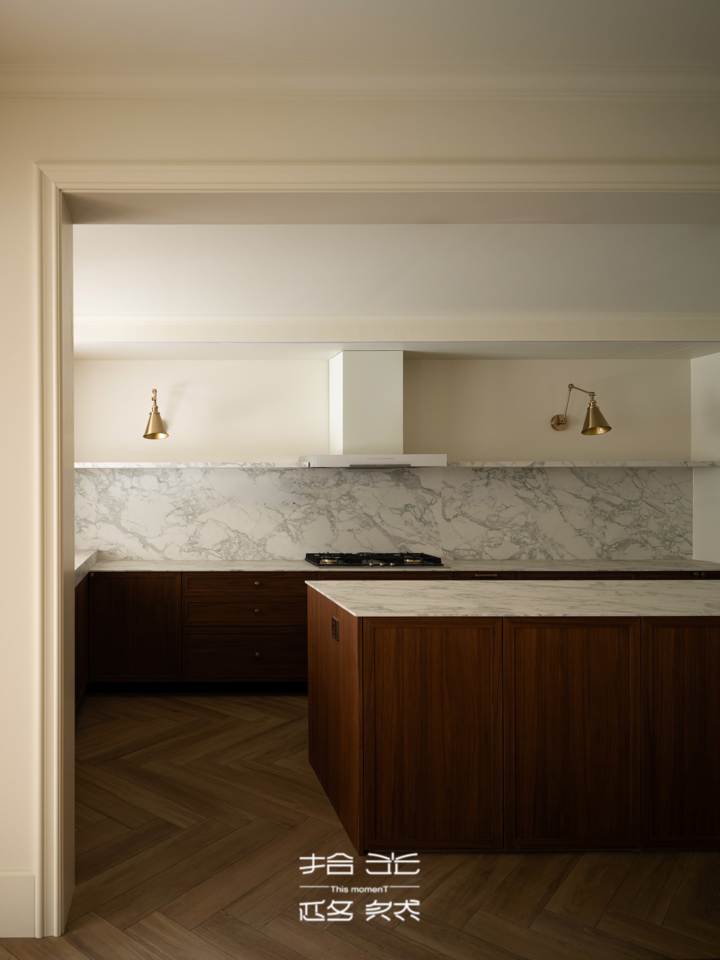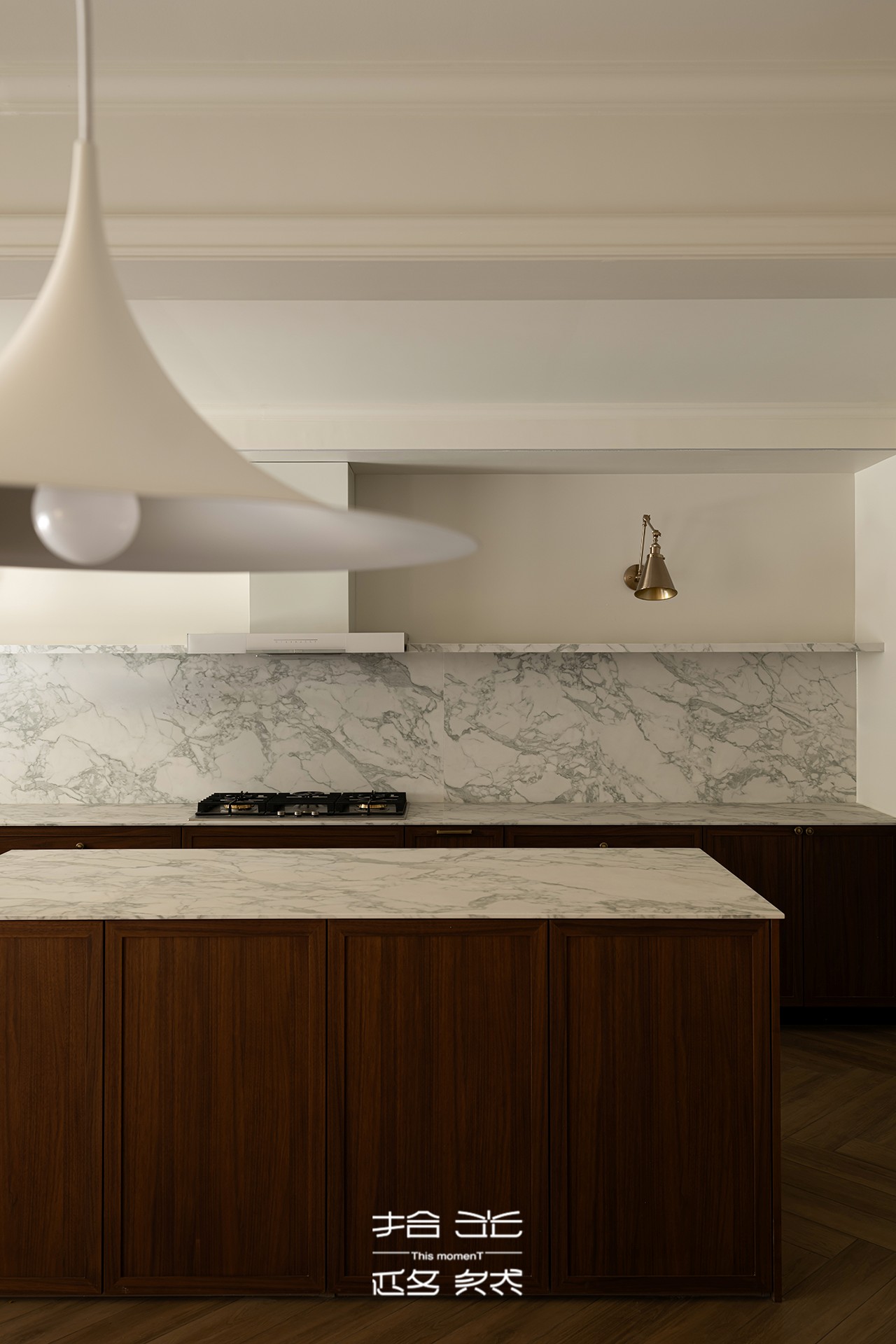 厨房的大理石台面,纹理里藏着山水的影子。深色木柜带着质朴的温度,把锅碗瓢盆的烟火,都衬得更有生活质感。