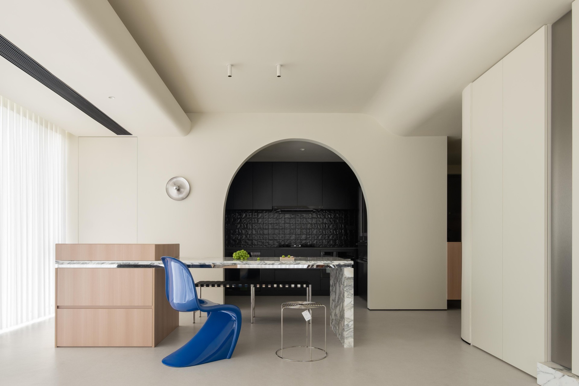 厨房与外部餐厨区的明亮色彩不同,厨房内部采用黑色系橱柜与台面。沉稳的黑色不仅耐脏易打理,更与外部的克莱因蓝、木色形成强烈视觉对比,从视觉上拉长了空间纵深感,让开放式布局的空间不显杂乱,反而更显精致有层次。