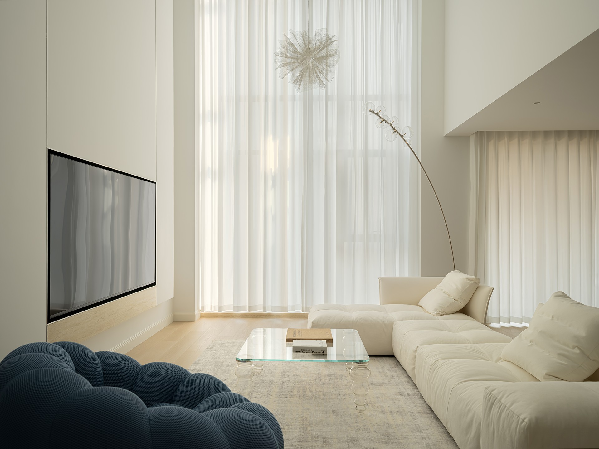 没做复杂的吊顶,保留了原来的挑高,把空间的通透和开阔感做到了极致。无遮挡的高度配上整面落地窗,视野和光线都没话说。