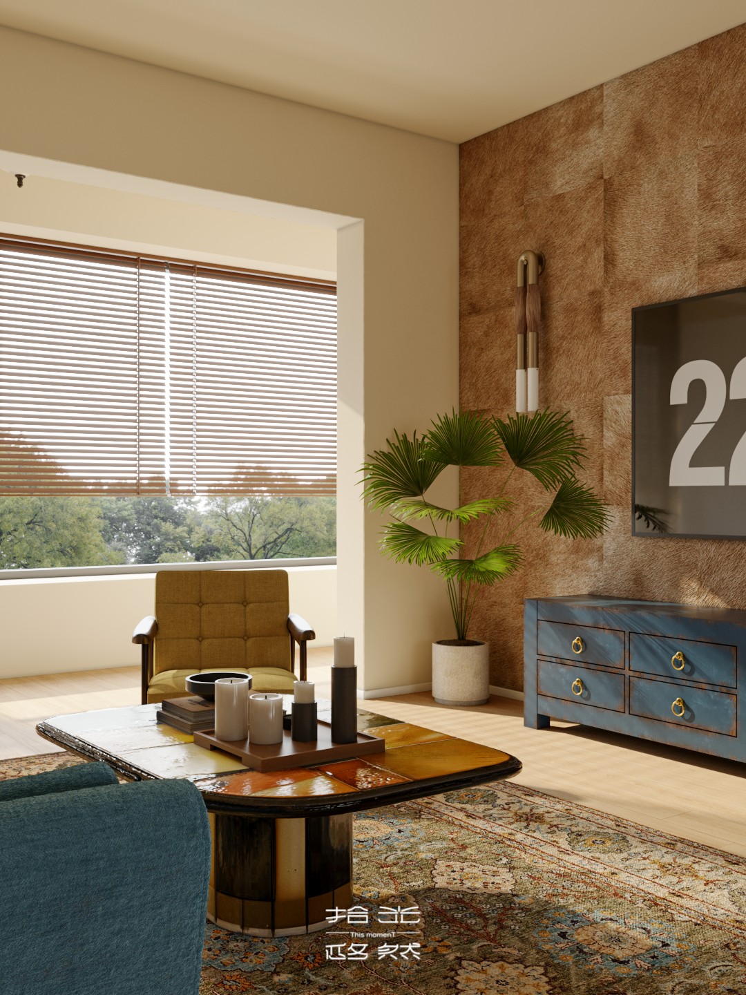 当复古不再是风格的复刻,而是设计语言的解构,这套住宅便成了一场关于质感与情绪的空间实验。设计师以暖棕为基底,用精准的材质碰撞、层次丰富的光影系统和充满叙事感的动线规划,将复古元素拆解重组,在当代生活场景中生长出既有设计张力、又能容纳烟火的居住空间。 设计的巧思藏在每一处细节的精准控制里:客厅的肌理感墙面与蓝色沙发形成色彩对冲,复古花纹地毯串联起空间层次,黄铜壁灯的金属光泽为暖棕底色注入精致感;餐厅的实木餐桌搭配藤编与铁艺混搭的座椅,刻意营造的 “不统一” 让空间更具呼吸感;主卧的橄榄绿窗帘与肌理艺术墙形成材质对话,三层叠级吊灯在睡眠区柔化光线,让设计感与舒适感达成平衡。 从钢琴区的木质百叶窗控光系统,到浴室的藤编柜与大理石台面的材质碰撞,再到走廊序列感营造的空间仪式感,每个区域都在讲述设计的逻辑 —— 它不追求表面的复古符号,而是通过材质、光影与动线的交织,让复古成为一种可感知的空间情绪,最终让家既是屋主青睐的设计范本,也是能承载日常烟火的温暖容器。