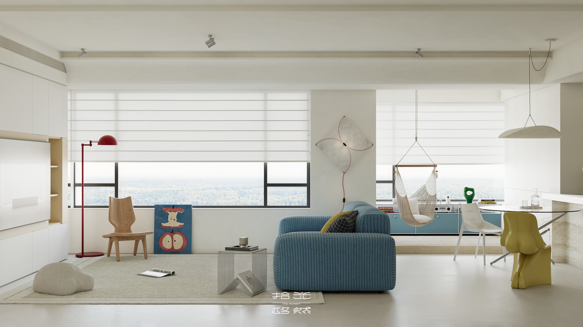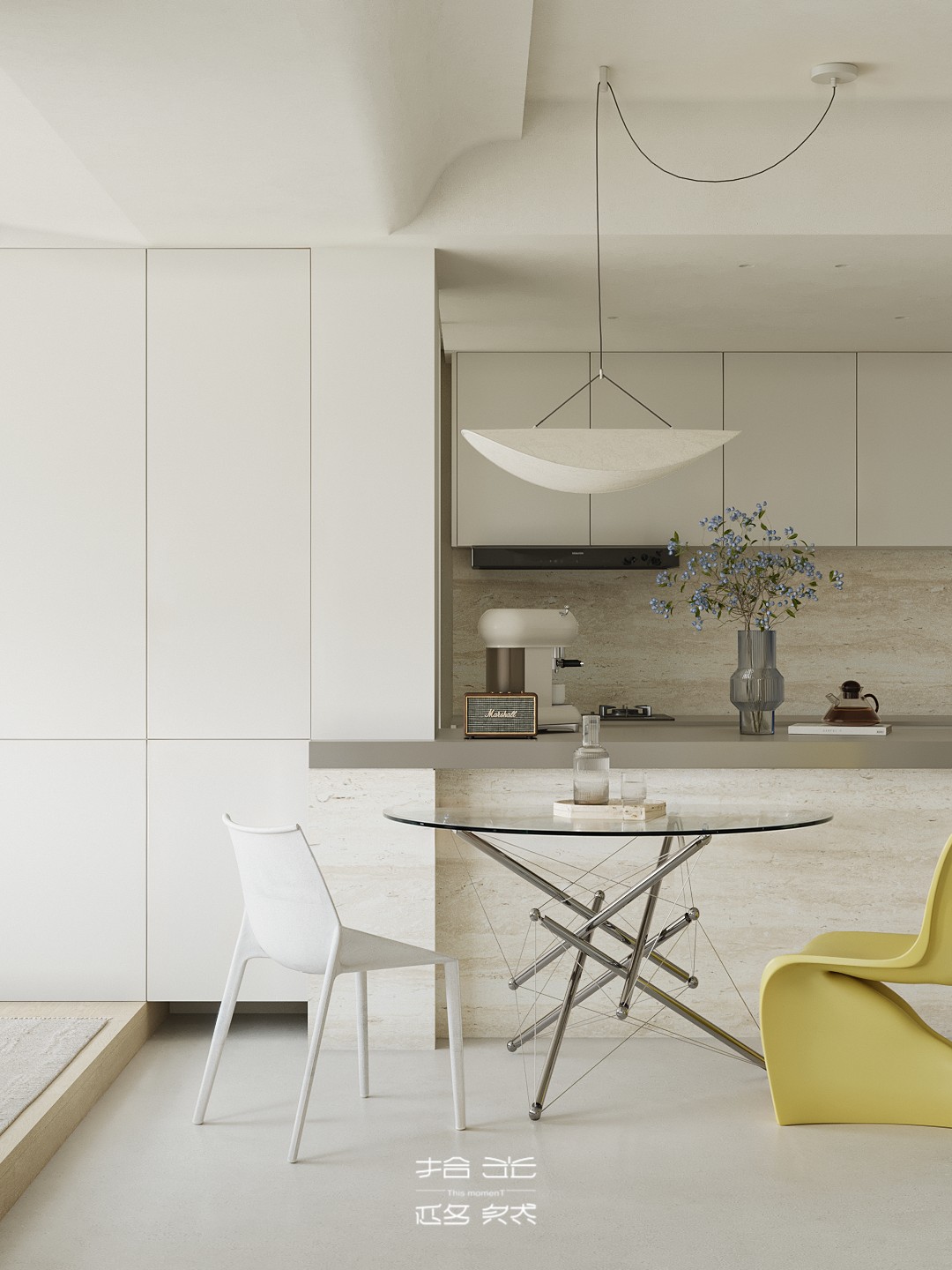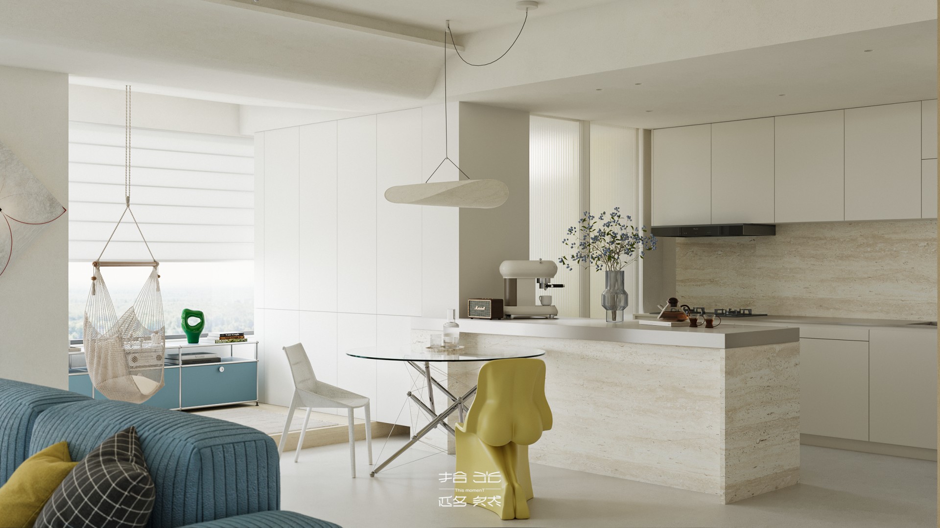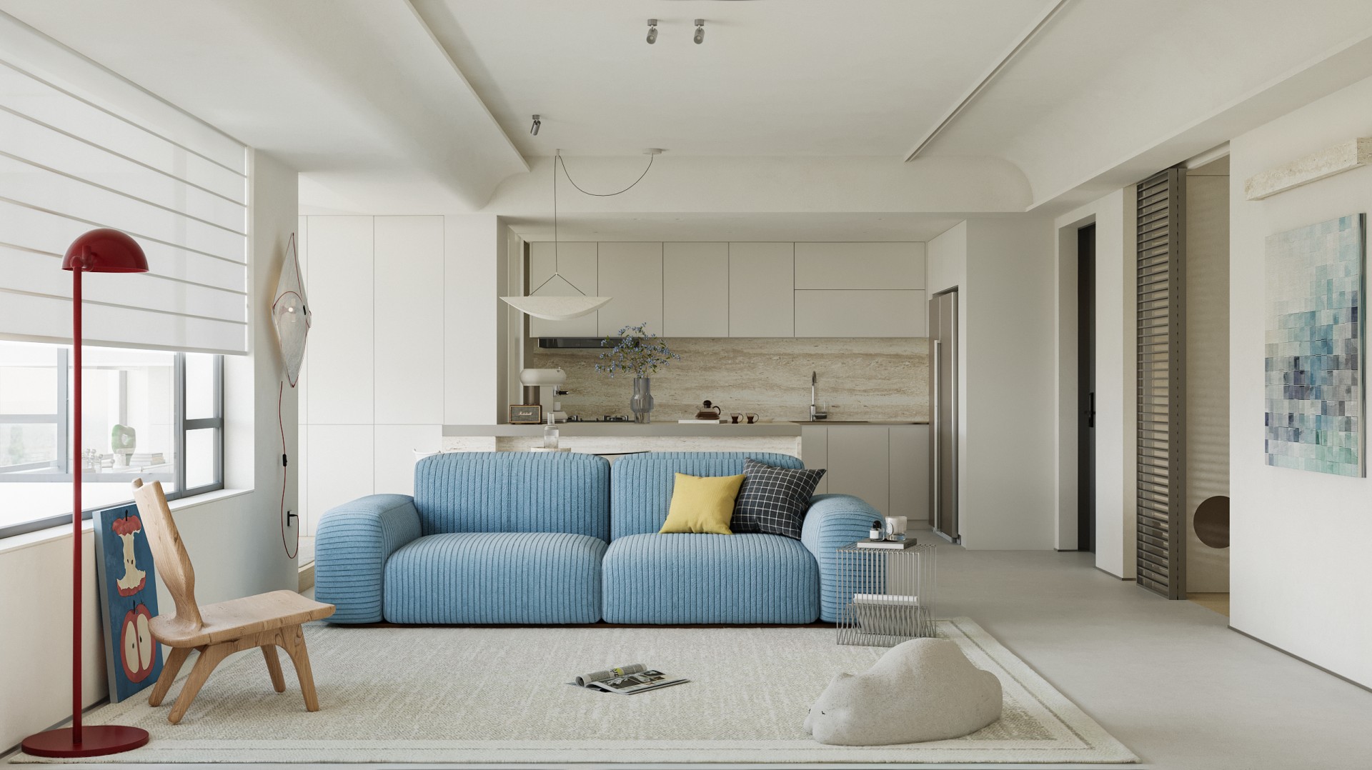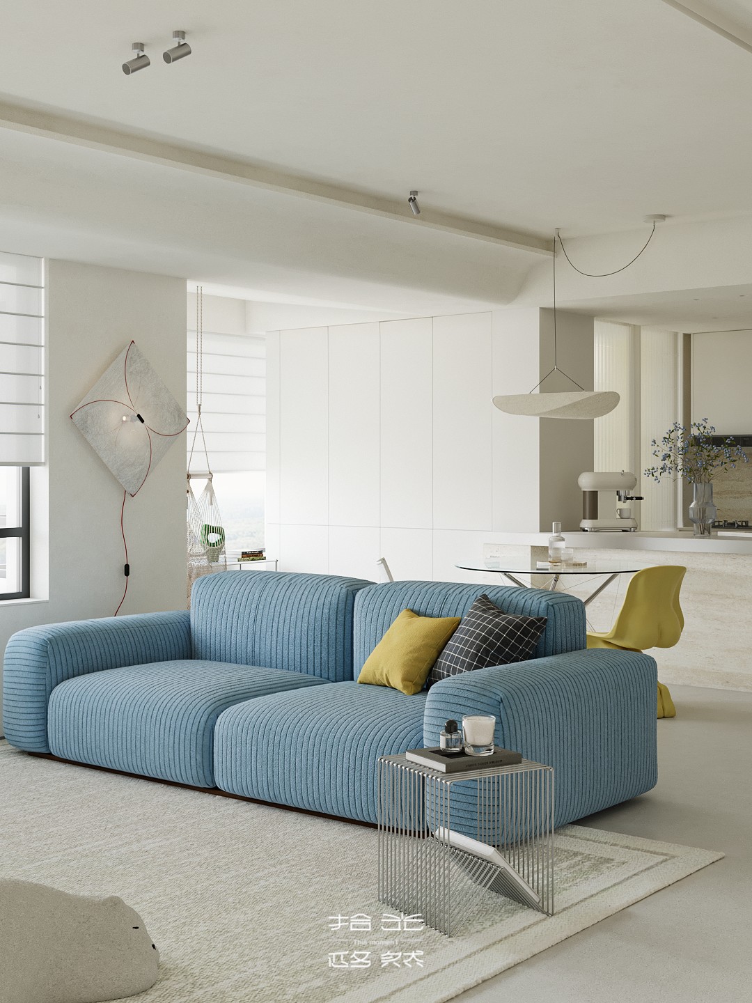 清晨的阳光穿过百叶窗,在微水泥地面上落下温柔的光影,女主人正站在洞石岛台边冲手冲,咖啡香混着面包机的嗡鸣漫开;孩子窝在窗边的吊椅里晃腿,克莱因蓝沙发上的黄抱枕被蹭到了地毯上。 这套 127㎡的精装房没有陷入 “千篇一律” 的刻板,设计团队以 “消隐边界、色彩叙事、质感植入” 为核心策略,在保留原有结构的基础上,用精准的设计巧思重构空间,让精装房跳出标准化模板,成为兼具设计张力与生活温度的居住容器。 设计的核心,在于打破精装房的空间桎梏与视觉惯性:拆除冗余墙体,让客餐厨三大公区形成无界洄游,阳光从落地窗涌入时,能穿透整个公共空间;以低饱和米白为基底,用克莱因蓝沙发作为视觉锚点,搭配柠檬黄雕塑椅、红色落地灯形成撞色层次,让色彩成为情绪的表达而非装饰;洞石岛台、微水泥地面与木质地板的材质碰撞,在极简框架下注入温润质感;整屋隐藏式收纳系统与墙面齐平,让视觉秩序感与实用功能完美平衡。 从公共区的开阔通透到私密区的柔和包裹,从色彩的精准碰撞到材质的层次营造,每一处设计都在回应 “精装房如何住出专属感” 的命题。它没有彻底推翻原有结构,而是用设计的力量激活空间潜能,让 127㎡的家既能承载一家