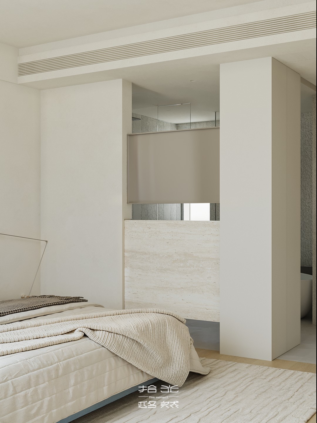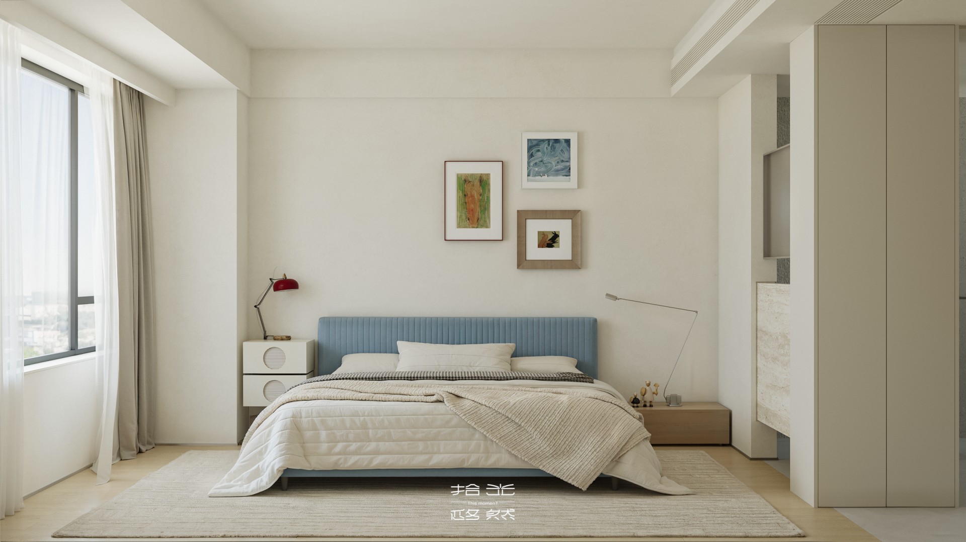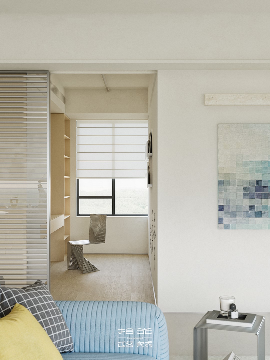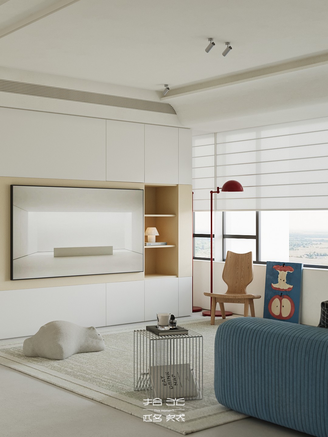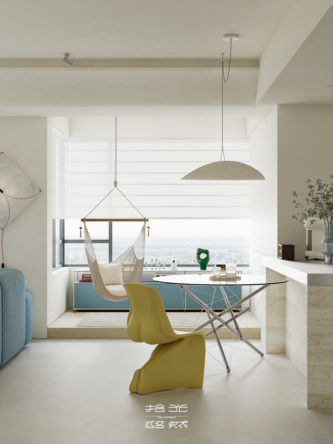 清晨的阳光穿过百叶窗,在微水泥地面上落下温柔的光影,女主人正站在洞石岛台边冲手冲,咖啡香混着面包机的嗡鸣漫开;孩子窝在窗边的吊椅里晃腿,克莱因蓝沙发上的黄抱枕被蹭到了地毯上。 这套 127㎡的精装房没有陷入 “千篇一律” 的刻板,设计团队以 “消隐边界、色彩叙事、质感植入” 为核心策略,在保留原有结构的基础上,用精准的设计巧思重构空间,让精装房跳出标准化模板,成为兼具设计张力与生活温度的居住容器。 设计的核心,在于打破精装房的空间桎梏与视觉惯性:拆除冗余墙体,让客餐厨三大公区形成无界洄游,阳光从落地窗涌入时,能穿透整个公共空间;以低饱和米白为基底,用克莱因蓝沙发作为视觉锚点,搭配柠檬黄雕塑椅、红色落地灯形成撞色层次,让色彩成为情绪的表达而非装饰;洞石岛台、微水泥地面与木质地板的材质碰撞,在极简框架下注入温润质感;整屋隐藏式收纳系统与墙面齐平,让视觉秩序感与实用功能完美平衡。 从公共区的开阔通透到私密区的柔和包裹,从色彩的精准碰撞到材质的层次营造,每一处设计都在回应 “精装房如何住出专属感” 的命题。它没有彻底推翻原有结构,而是用设计的力量激活空间潜能,让 127㎡的家既能承载一家