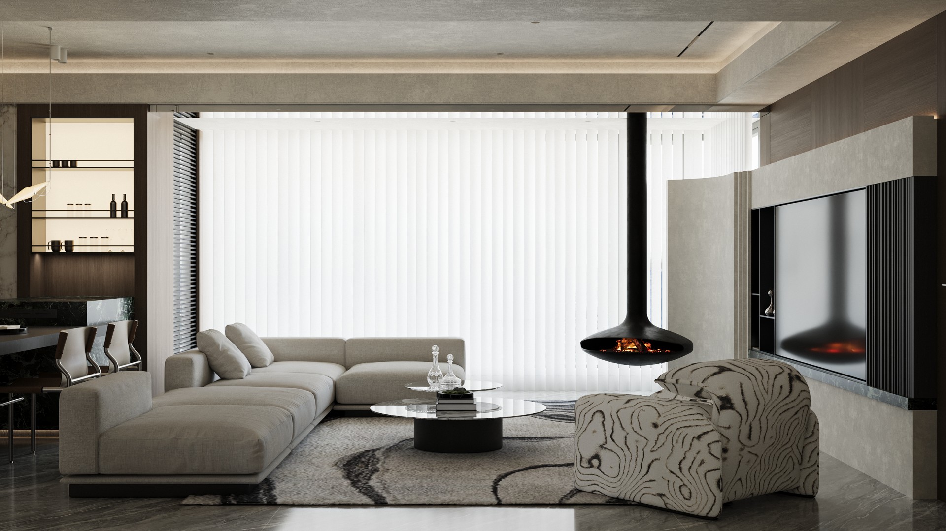 傍晚的风穿过竖百叶窗,悬浮壁炉里的火光在微水泥墙面漾开暖纹,男主人窝在艺术感单人椅里翻书,开放式餐厨区飘来刚烤好的巴斯克香气。这套 124㎡的精装房没有困在标准化的模板里,设计团队以「材质层次化、空间无界化、功能场景化」为核心策略,在保留原有结构的基础上,用精准的设计巧思打破精装房的刻板印象,让空间既承载都市精英的质感日常,也容纳一家人的松弛相处。 设计的核心,在于重构精装房的空间逻辑与质感表达:拆除冗余墙体,让客餐厨三大公区形成洄游动线,阳光从落地窗涌入时,能穿透整个公共空间;以低饱和米灰为基底,用深色木饰面、墨绿大理石与微水泥形成材质碰撞,在极简框架下注入温润层次;悬浮壁炉作为视觉锚点,搭配艺术感单人椅与水纹地毯,让都市客厅拥有壁炉旁的松弛仪式感;整屋隐藏式收纳系统与墙面齐平,将功能需求隐于美学秩序之下,让空间既整洁又充满设计张力。 从公共区的开阔通透到私密区的静谧包裹,从材质的精准碰撞到功能的场景营造,每一处设计都在回应「精装房如何拥有专属质感」的命题。它没有彻底推翻原有结构,而是用设计的力量激活空间潜能。