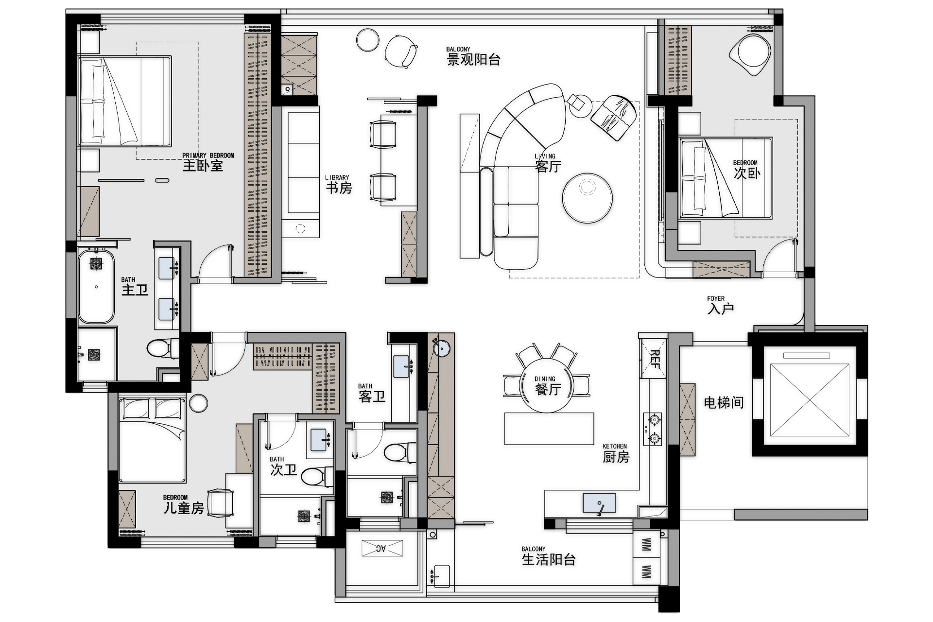 当精装房的标准化模板遇上居住者的个性化需求,设计便成为一场关于 “去芜存菁” 的温柔改造。本案以 182㎡的空间为画布,摒弃过度装饰的浮华,以现代极简为基底,在材质、光影与动线的平衡中,让家回归舒适本真,书写当代人居的松弛美学。 从公共区域的开放包容,到私密空间的内敛沉静,改造始终以 “人” 为核心,在克制中见高级,于简约中藏温度。每一处细节的打磨,都旨在让精装房摆脱模板化的冰冷,成为承载生活烟火与情感记忆的理想容器,让日常的每一刻都尽显从容与诗意。