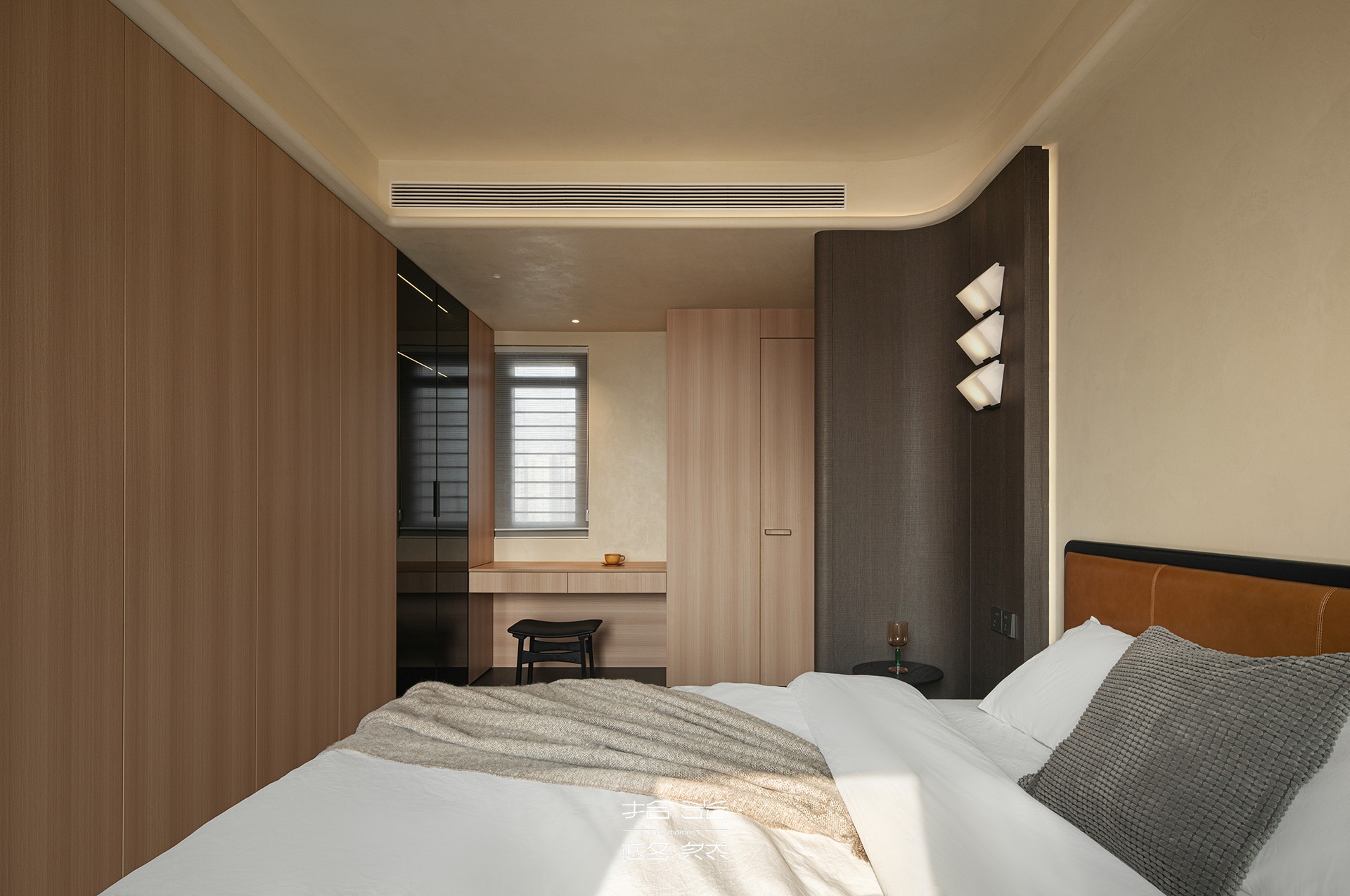 真正的松弛,源于“一切皆有归处”。一整面墙的棕色木质衣柜,线条利落,将所有琐碎与杂乱不动声色地收纳于内。它不仅是储物工具,更是空间整洁感的守护者。