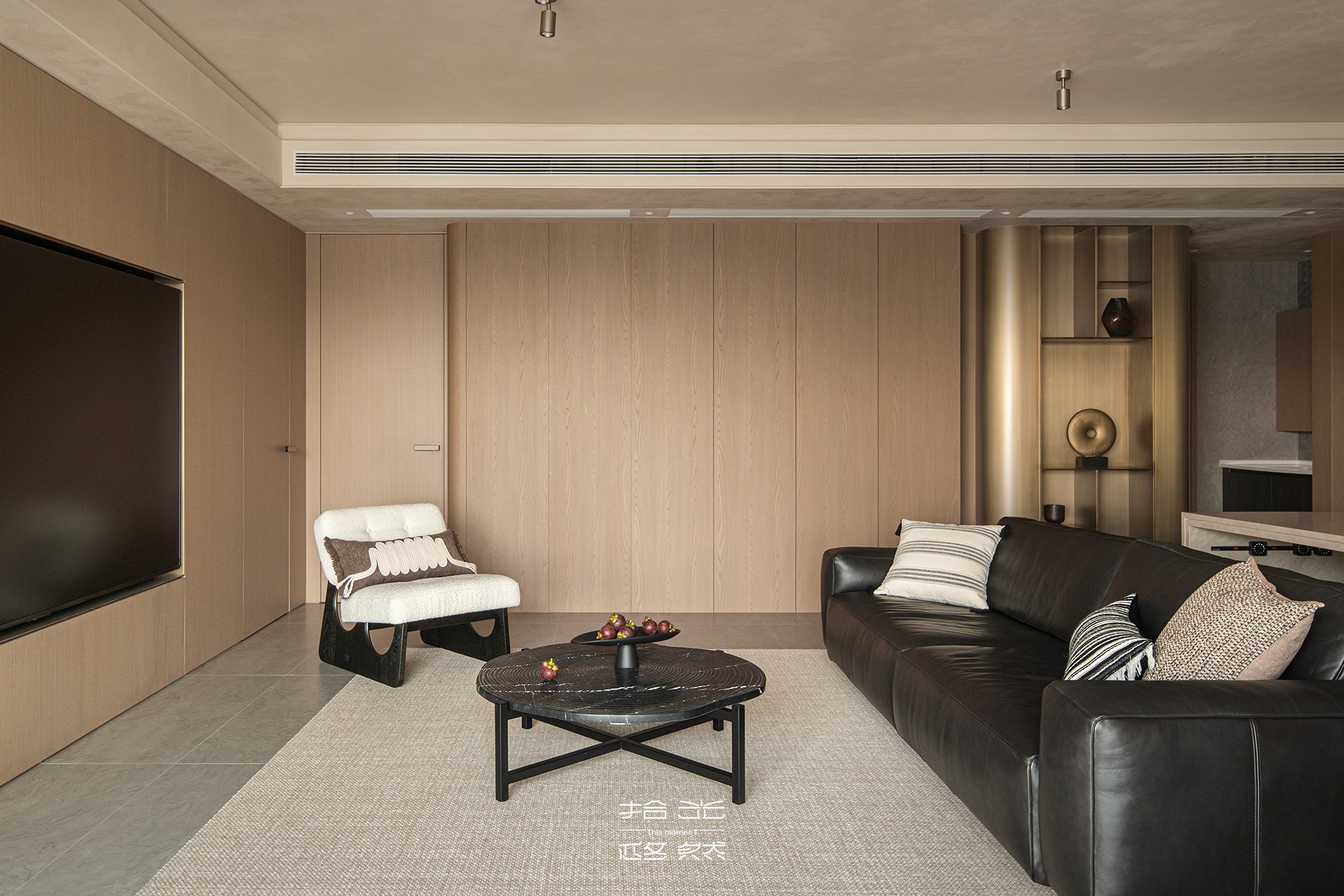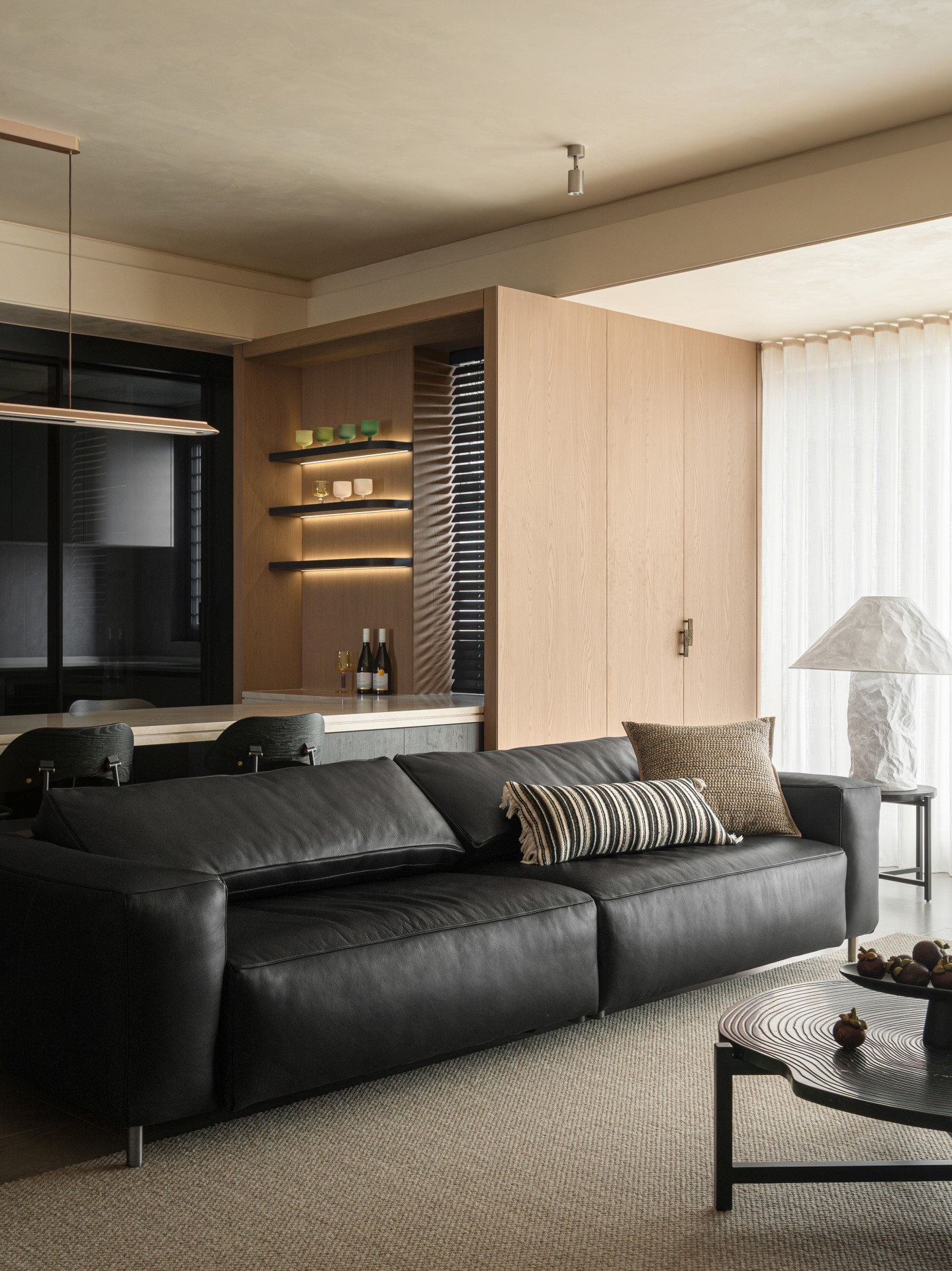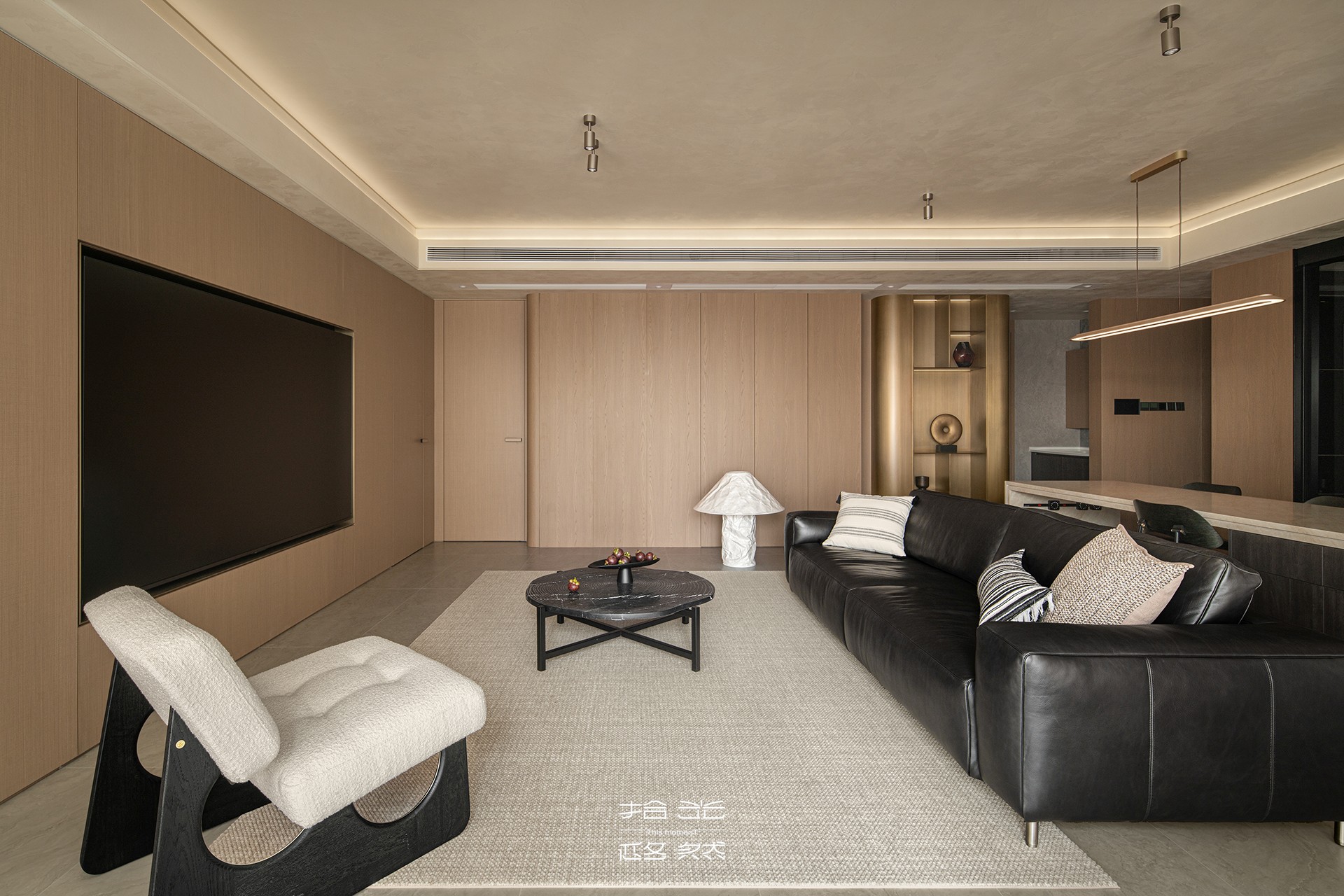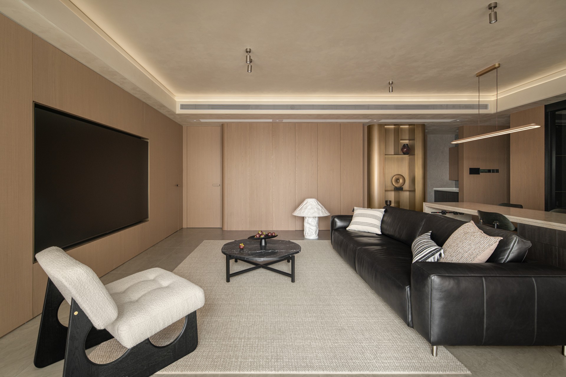 当我们穿过玄关,踏进这片被柔光包裹的天地,第一眼便被一种温暖的秩序感所俘获。浅木色调的墙面如秋日暖阳,包容一切。宽大的黑色皮质沙发沉静地卧于中央,稳稳接住你所有的疲惫。陷进去,是被欢迎、被接纳的感觉。