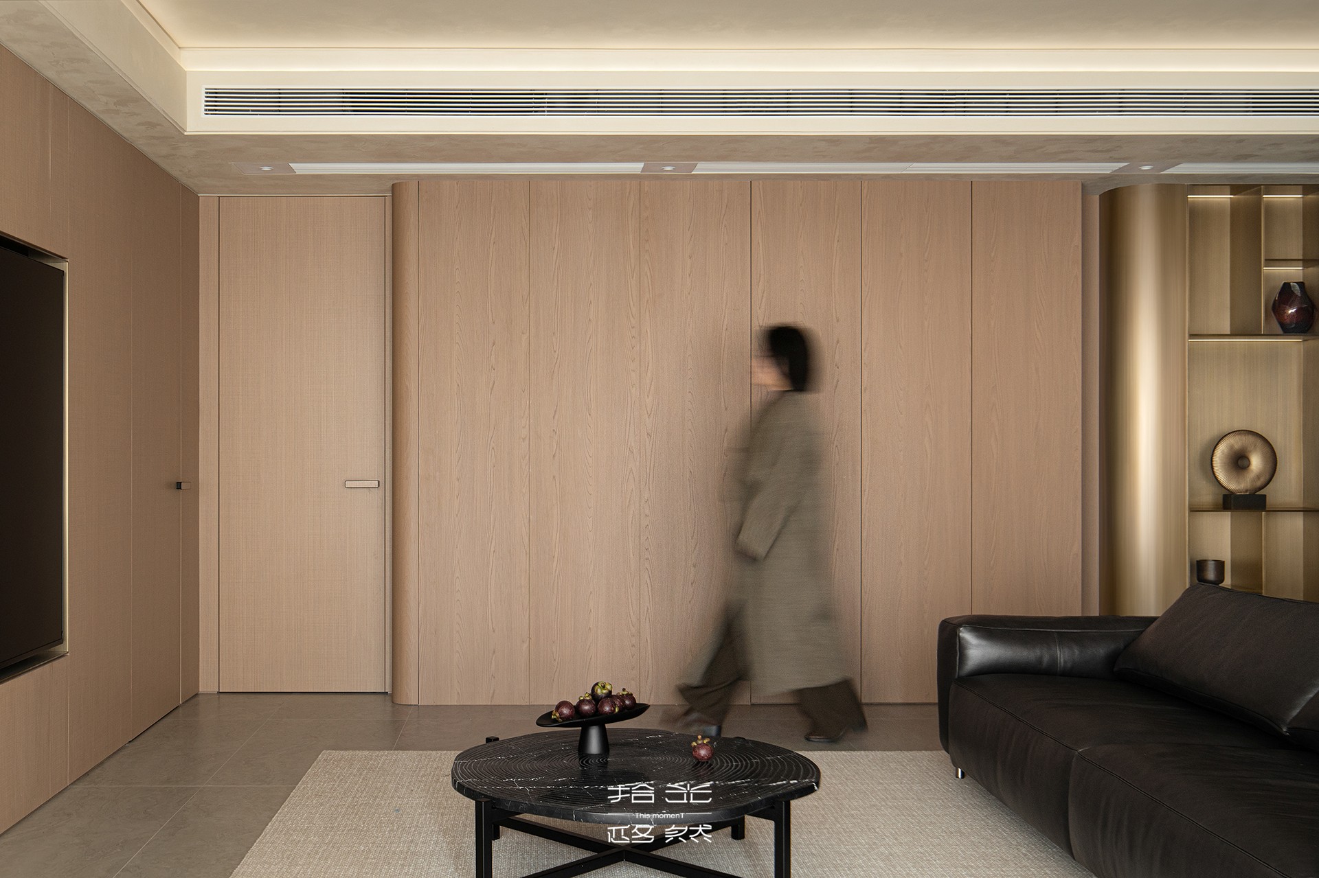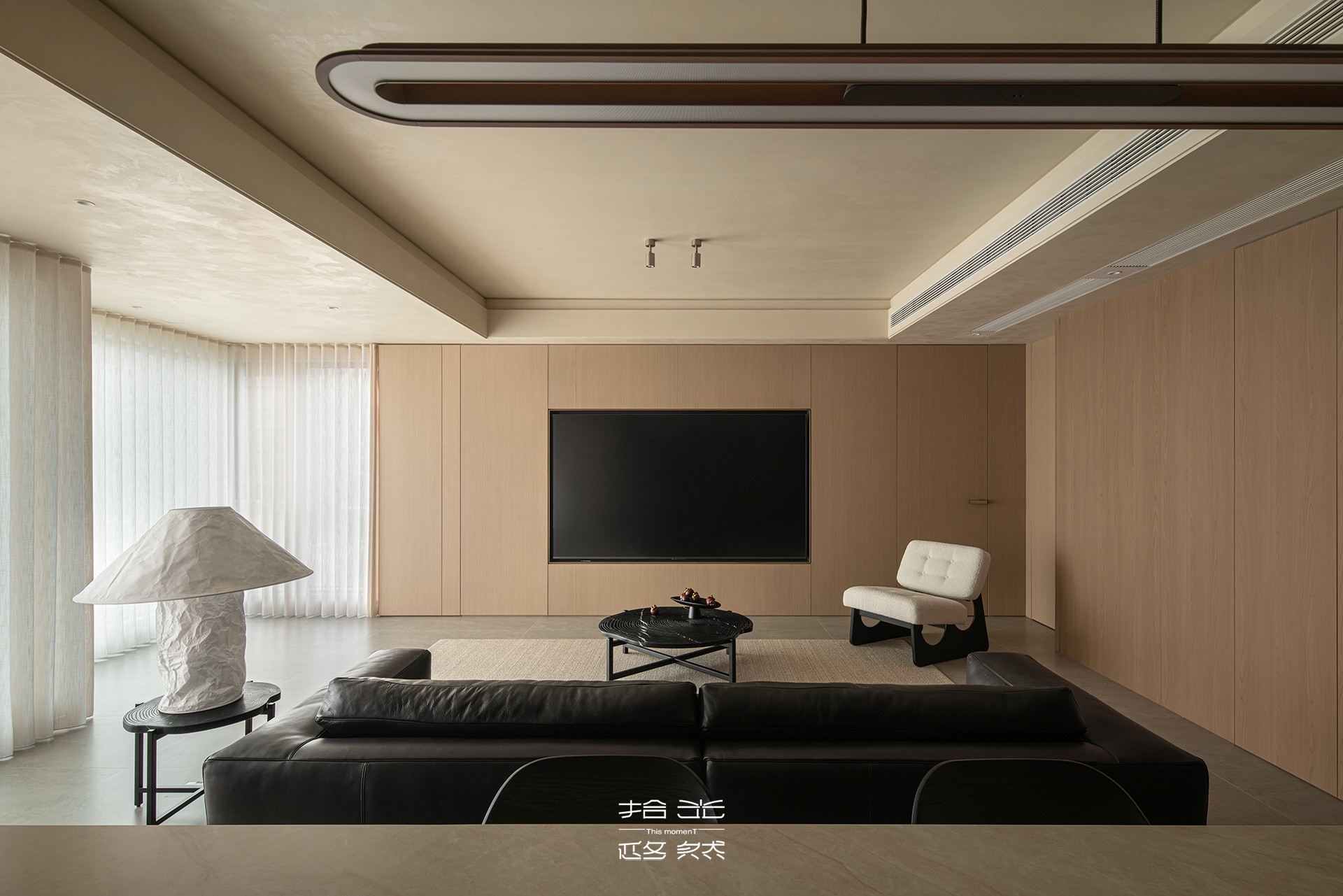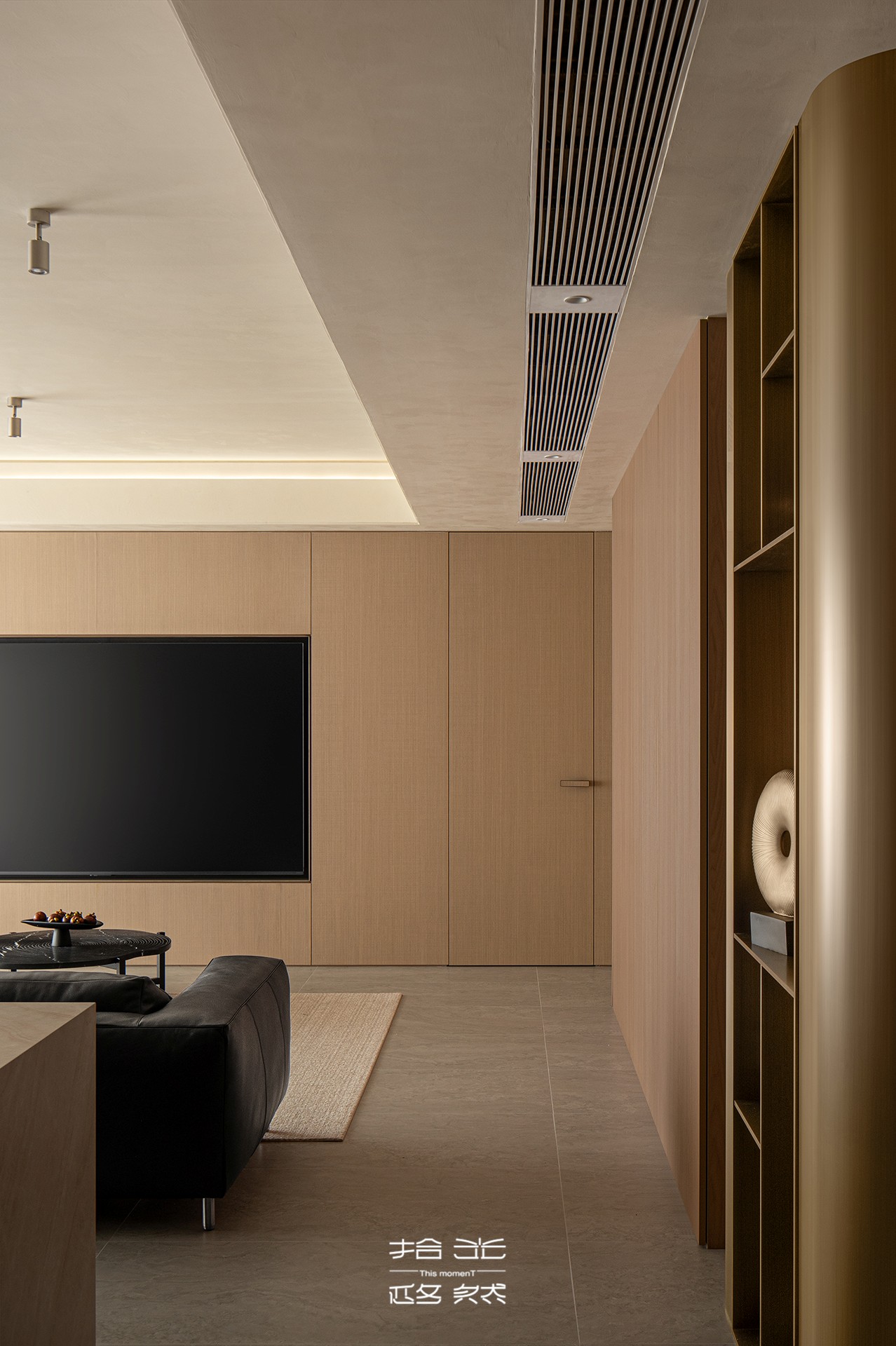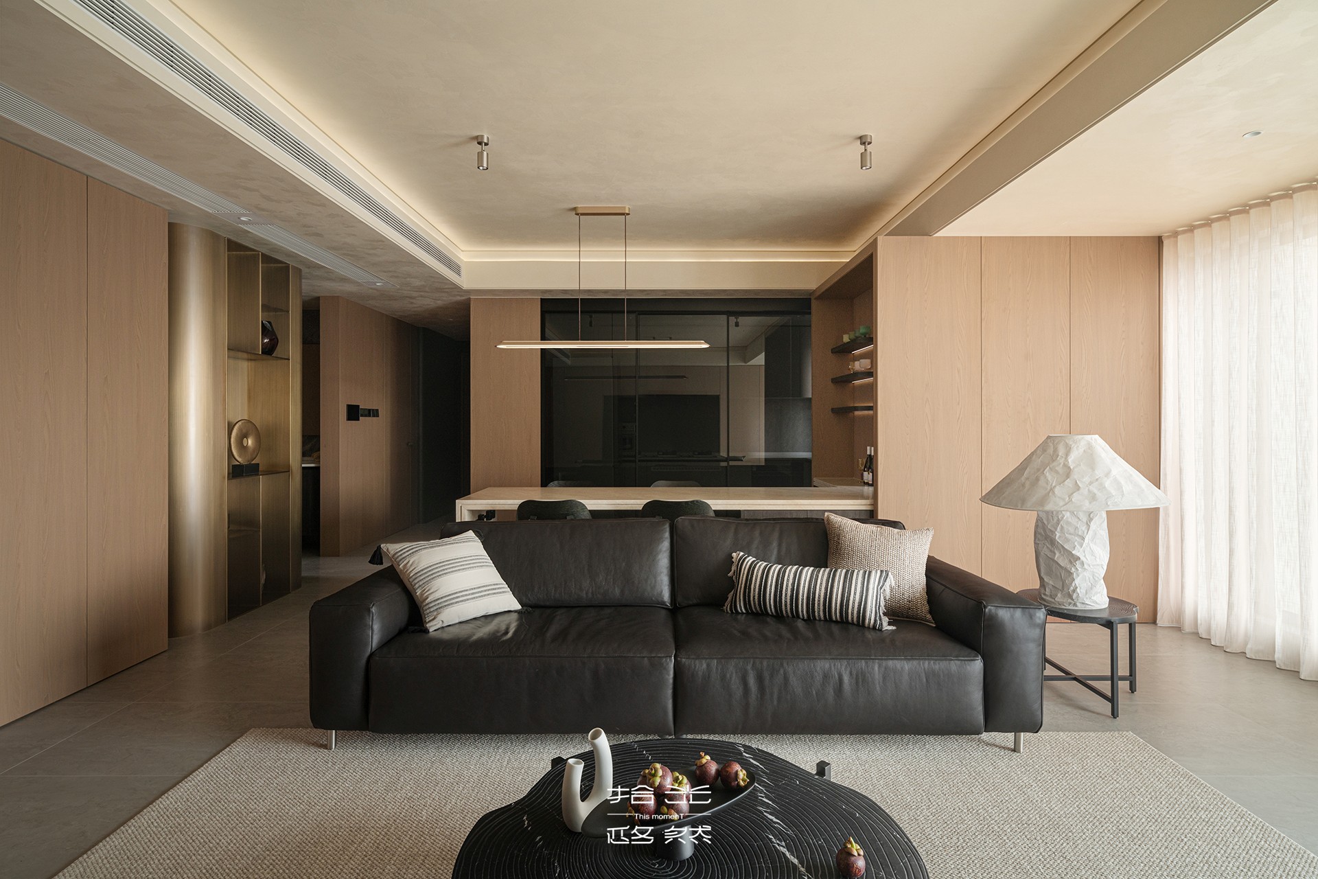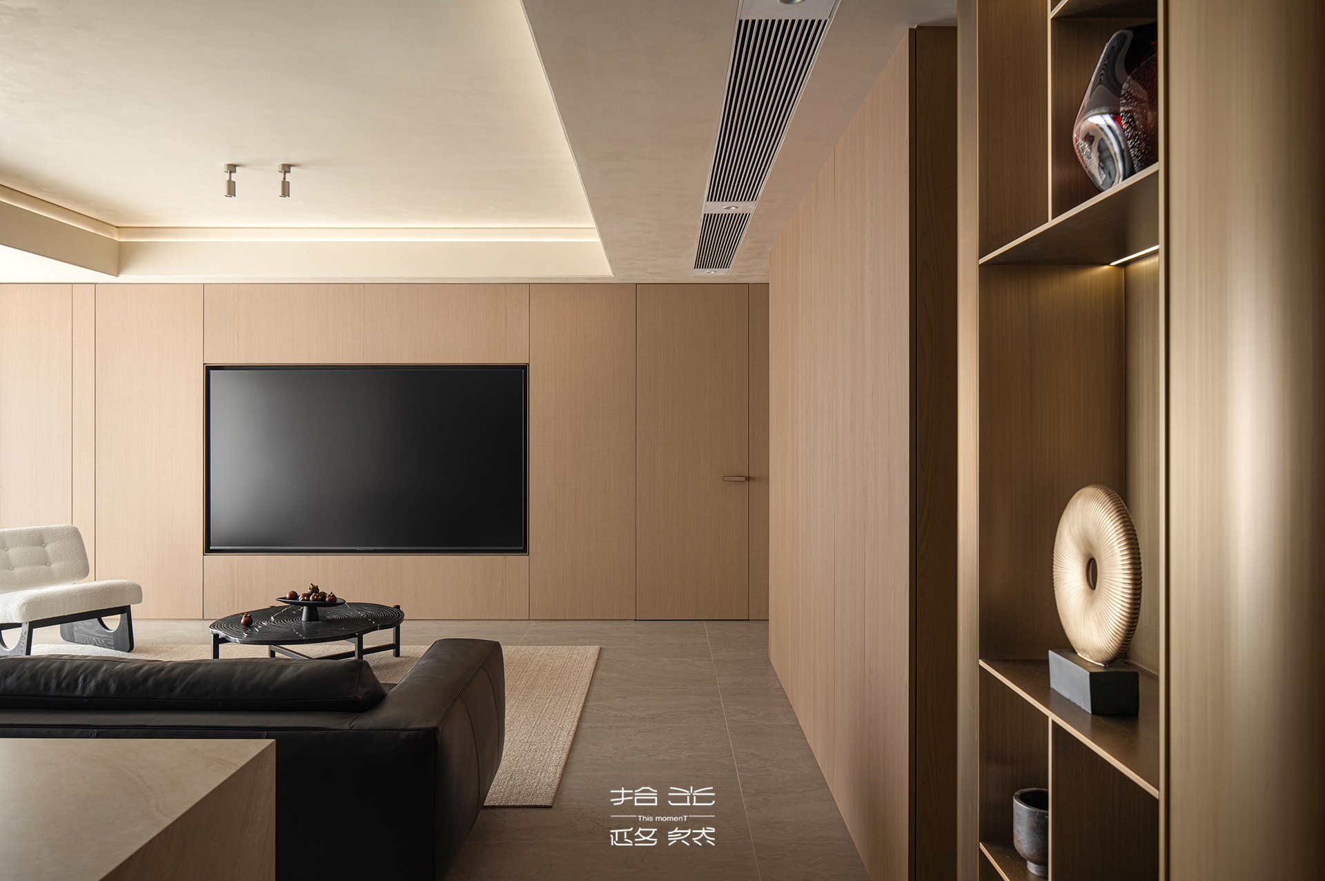 当我们穿过玄关,踏进这片被柔光包裹的天地,第一眼便被一种温暖的秩序感所俘获。浅木色调的墙面如秋日暖阳,包容一切。宽大的黑色皮质沙发沉静地卧于中央,稳稳接住你所有的疲惫。陷进去,是被欢迎、被接纳的感觉。