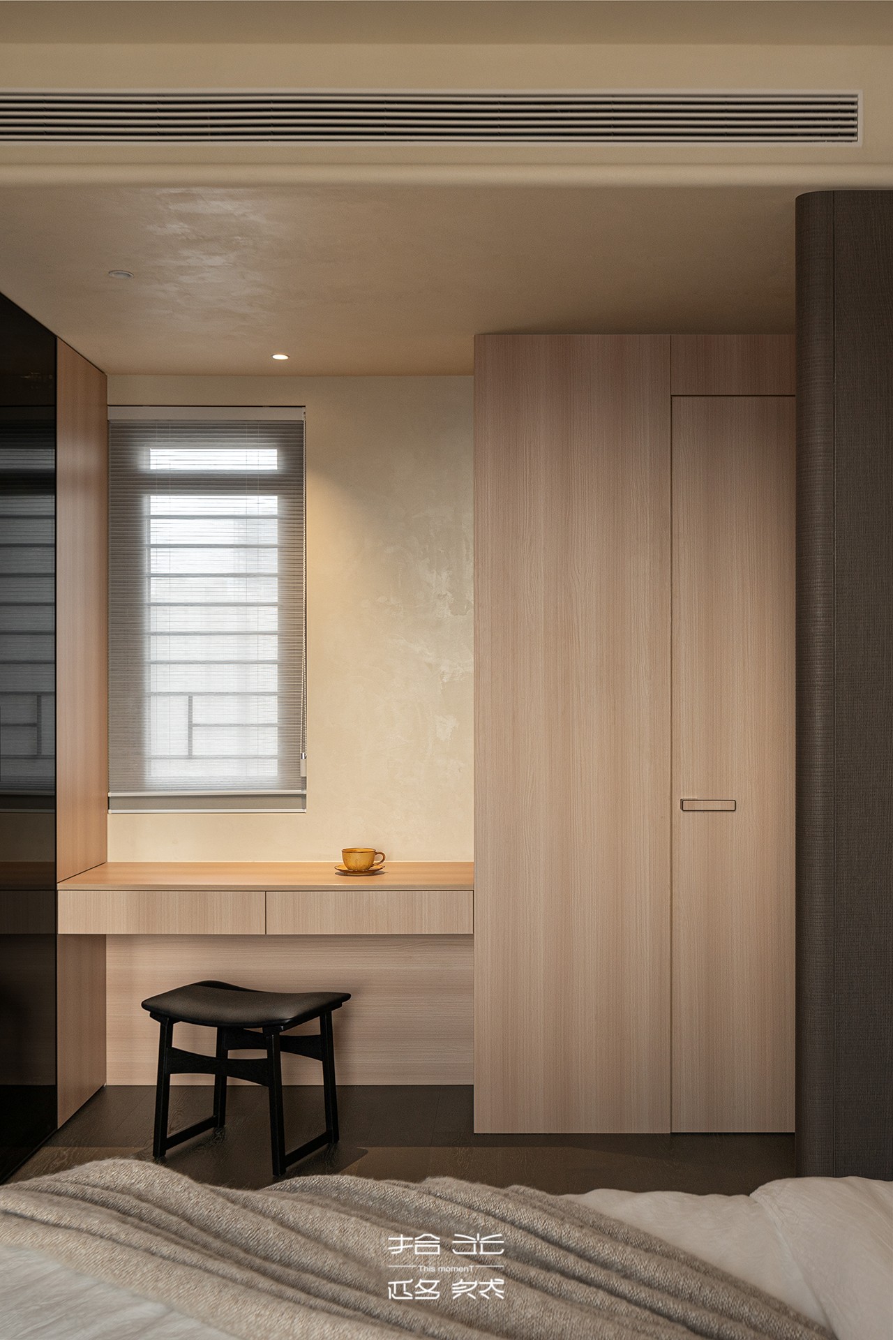 窗边一隅,被巧妙地设计成梳妆台或安静的阅读角。浅木色的桌面,一把简约的黑色单椅,一扇可调节光线的百叶窗。晨起时,这里是整理仪容;深夜时,这里也可以是暂时逃离、与自己独处的精神角落。
