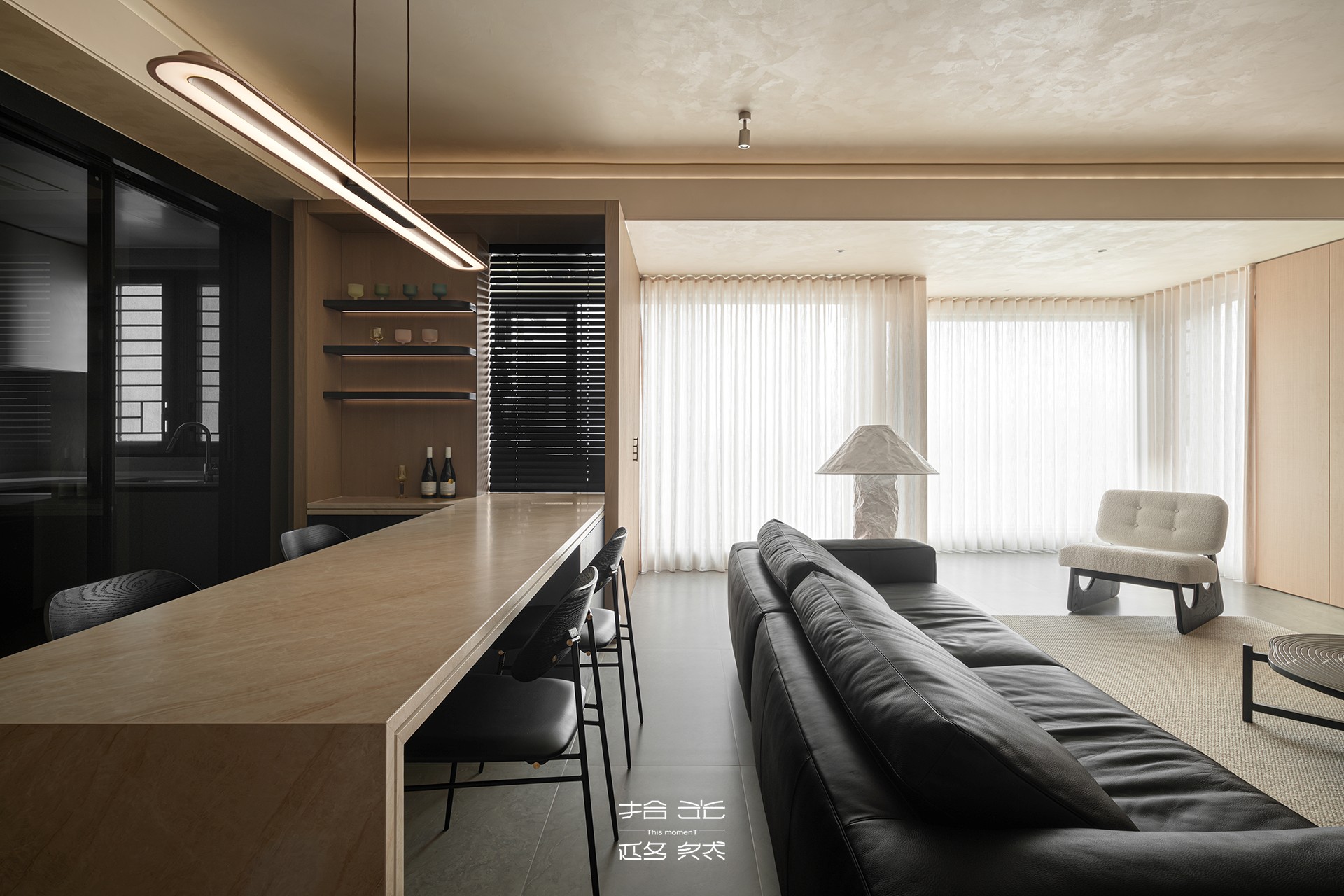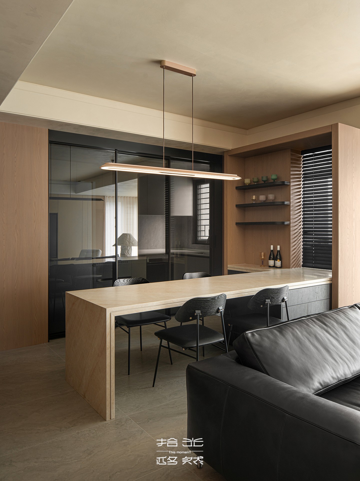 餐厅紧邻客厅,一张温润的石材长桌,仿佛承载着自然的痕迹,与四把线条利落的黑色餐椅静静相守。上方垂落一盏修长的吊灯,光线如水般温柔洒下,为每一次举箸、每一次碰杯,镀上一层柔和的滤镜。这里的设计,剥除了冗余的装饰,只留下温暖的秩序——让美食与交谈,成为真正的主角。