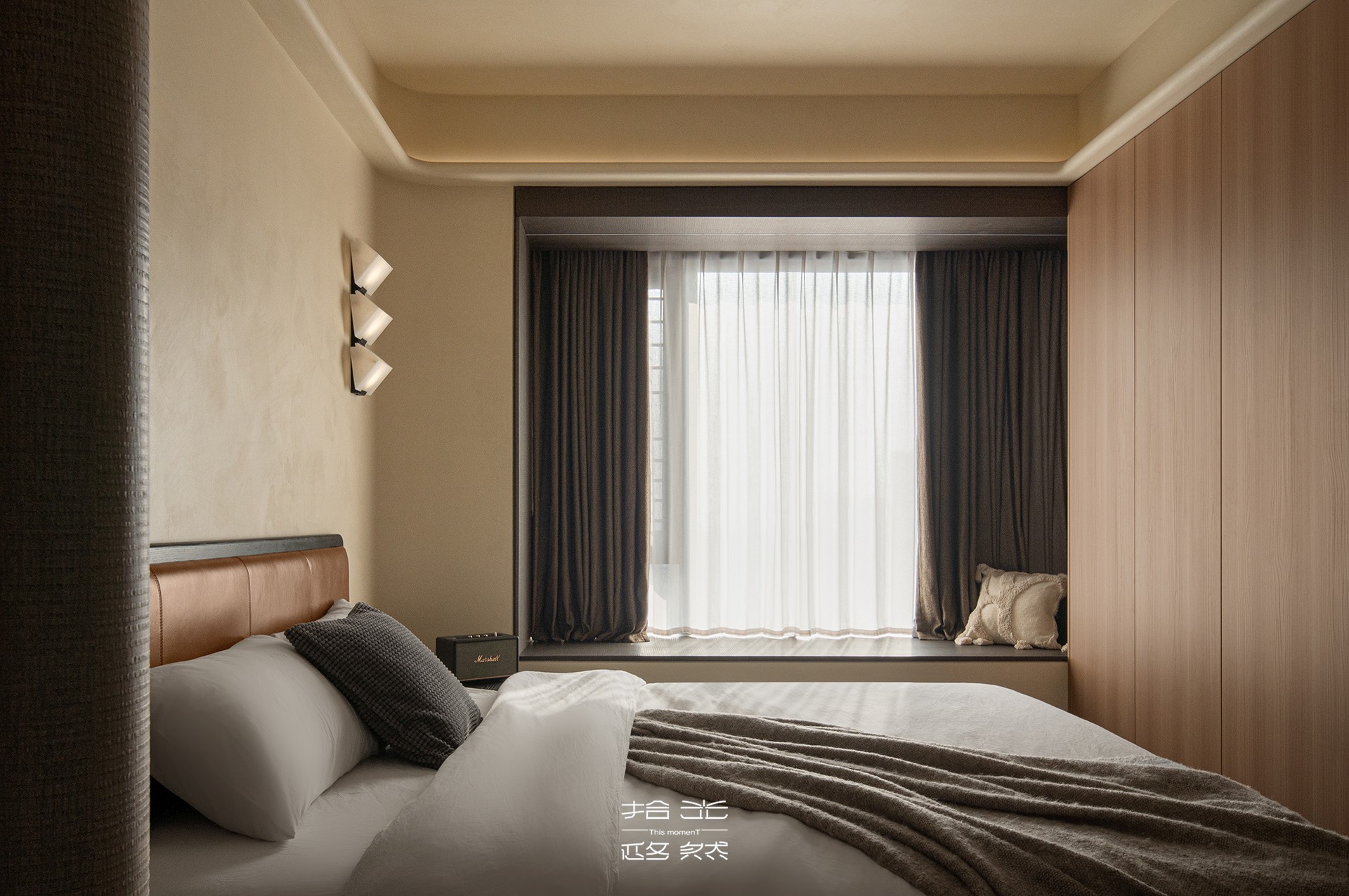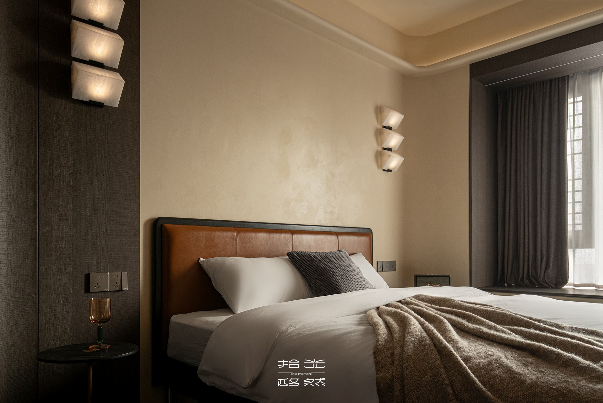目光所及,首先被一种 “温暖的秩序感” 抚慰。浅米色与棕木色调,像秋日午后阳光与土地的拥抱,奠定了空间静谧、包容的基底。一张宽大的床居于中央,白色床品是纯净的底衬,一条柔软的灰色毛毯随意搭着,勾勒出回家后第一刻就想陷进去的放松轮廓。深色背景墙并非沉闷,反而像深邃的夜空,衬得三盏白色方形壁灯如同定制的星辰。它们散发出的不是照明,而是包裹性的柔光。