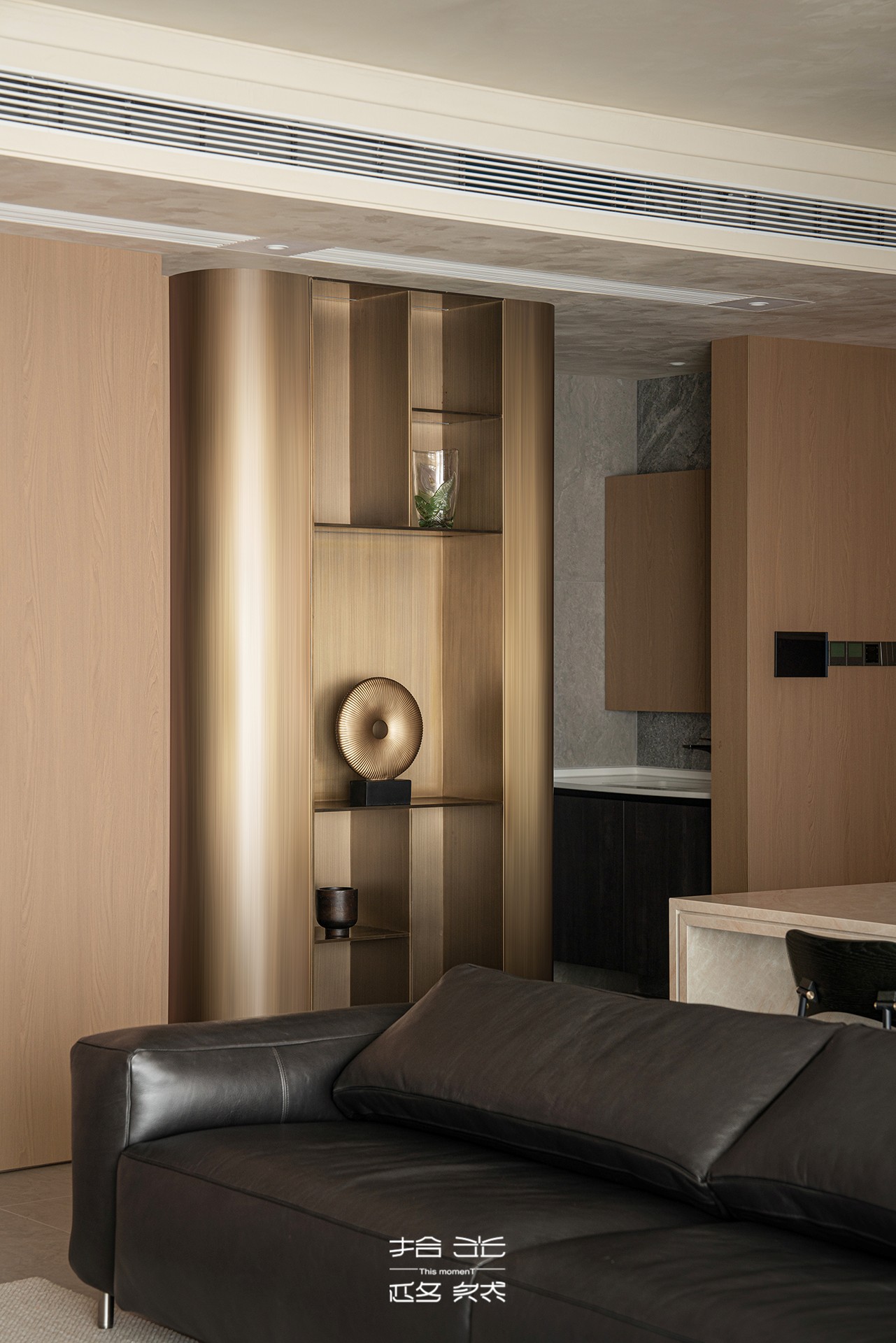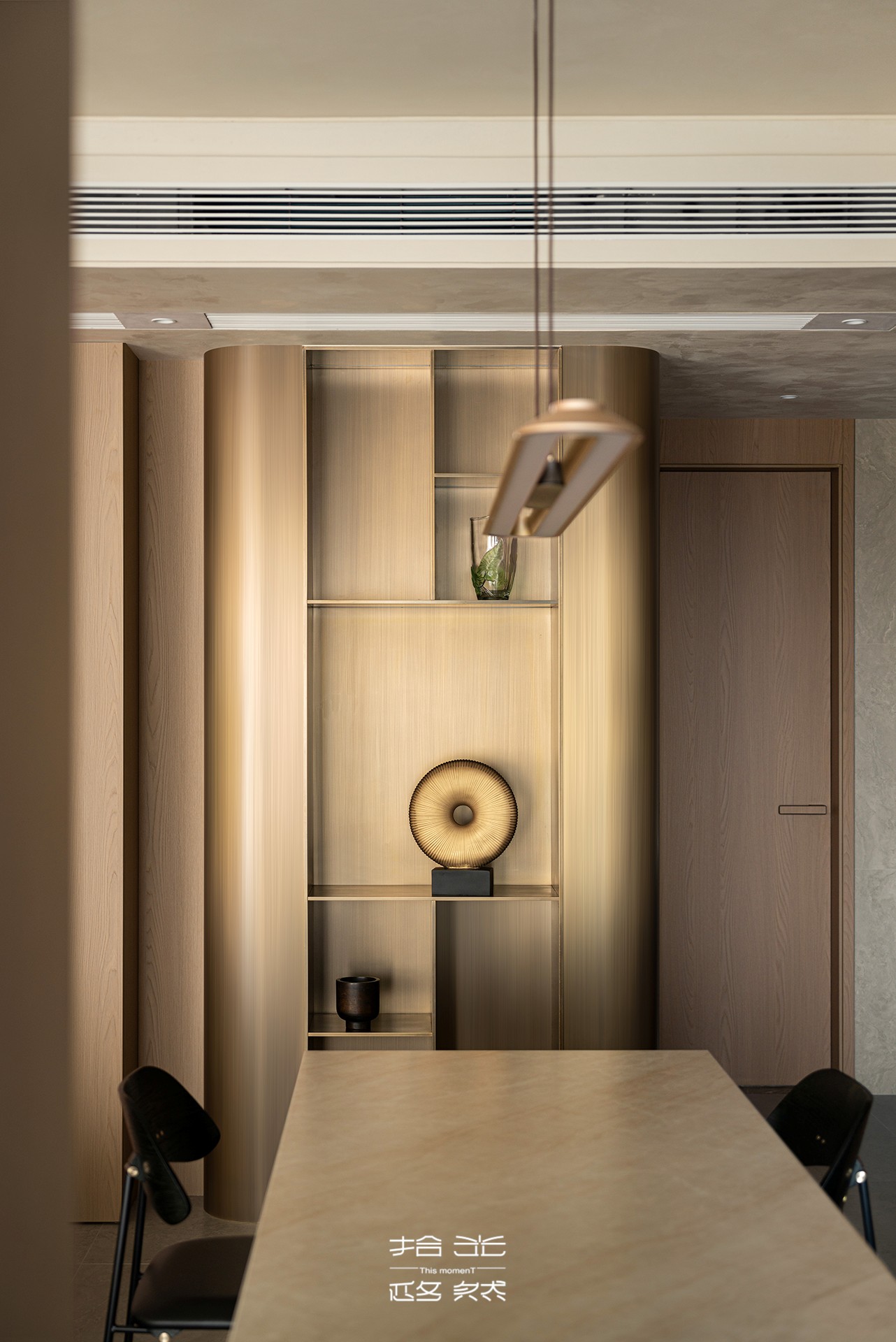 移步换景,走廊处那面拥有金属光泽的现代展示柜,则宛如空间叙事中的一个华丽顿号。它不再仅仅是储物功能,而更像一个家庭的“记忆光匣”。光滑的金属表面,冷静地映照着流动的居家身影与光线;内置的灯带将每一件收藏品——无论是旅途带回的纪念、重要的合影,还是一件纯粹的艺术摆件——都烘托得如同展馆珍品。它连接着空间的动线,让每一次经过,都成为与美好记忆的一次不经意重逢。