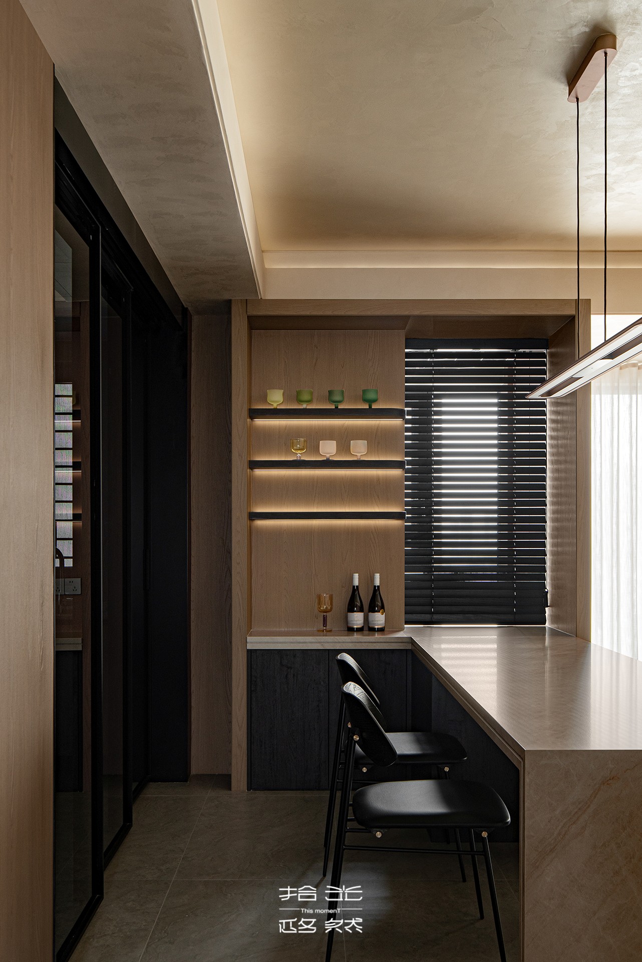 与餐桌一体延伸出来,那个沉稳的木质茶水柜,是生活烟火气的安放处。它不仅是一个储物容器,更是一处微小的风景。多层搁板上,或许陈列着几支主人珍爱的酒,或是一套素雅的茶具,日常的器物在此化为静美的展品。百叶窗滤过的光线,在木纹与玻璃器皿上投下斑驳光影,随着日升月落静静游移,记录着家的日常诗学。