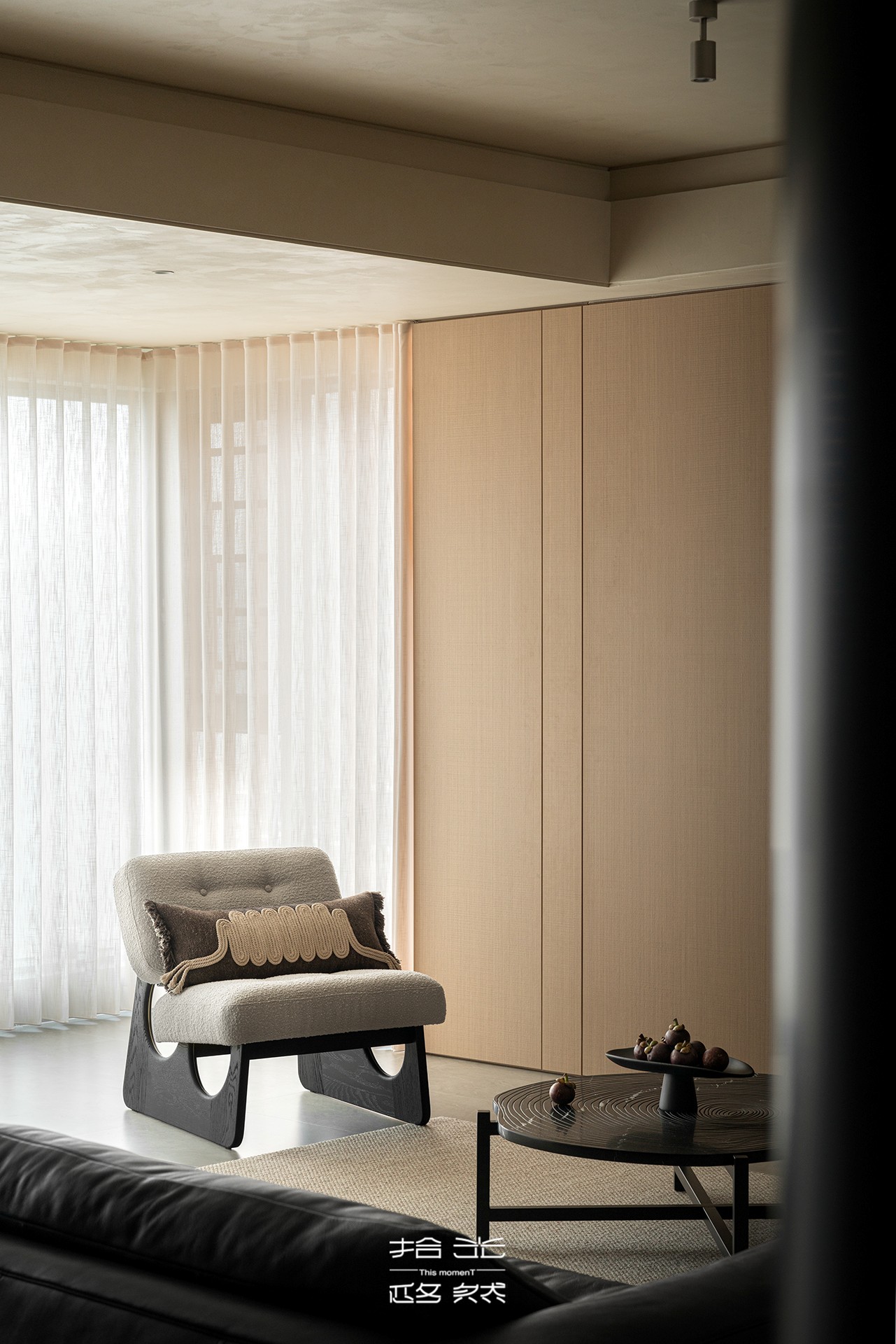 没有多余的喧嚣。一盏褶皱造型的台灯,像一朵凝固的云,只照亮你手边那本书或深夜的思绪。光影在此被柔化,成为最安静的陪伴。电视墙消隐于木色中,屏幕暗下时是安静的背景,亮起时是通往世界的窗口。热闹与宁静,收放自如。那把待在光影最好处的浅灰色单人椅,是留给自己的特权座位。在这里,看日光在地毯上缓慢移动,时间第一次显出了具体而温柔的形状。