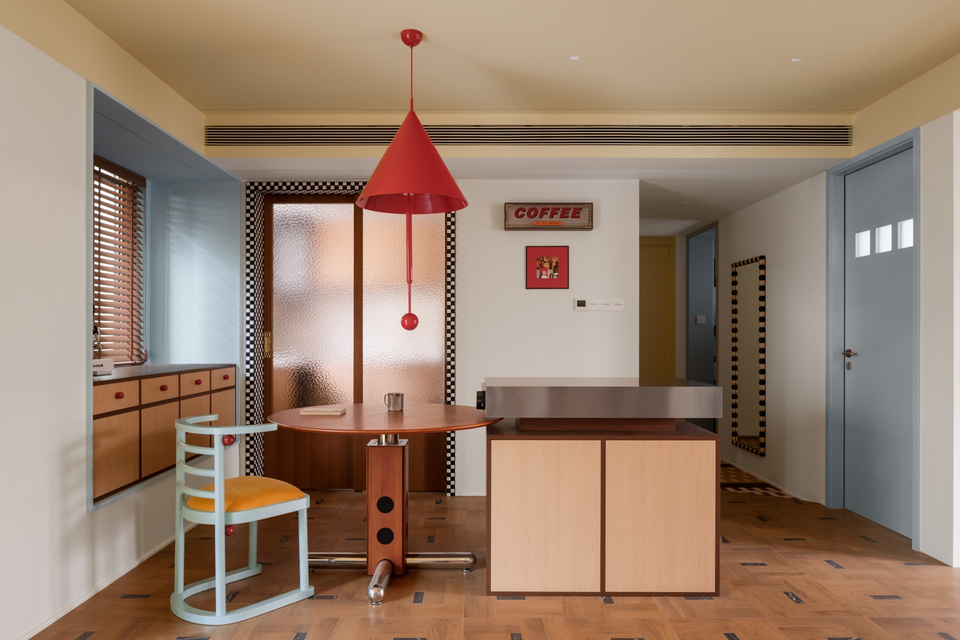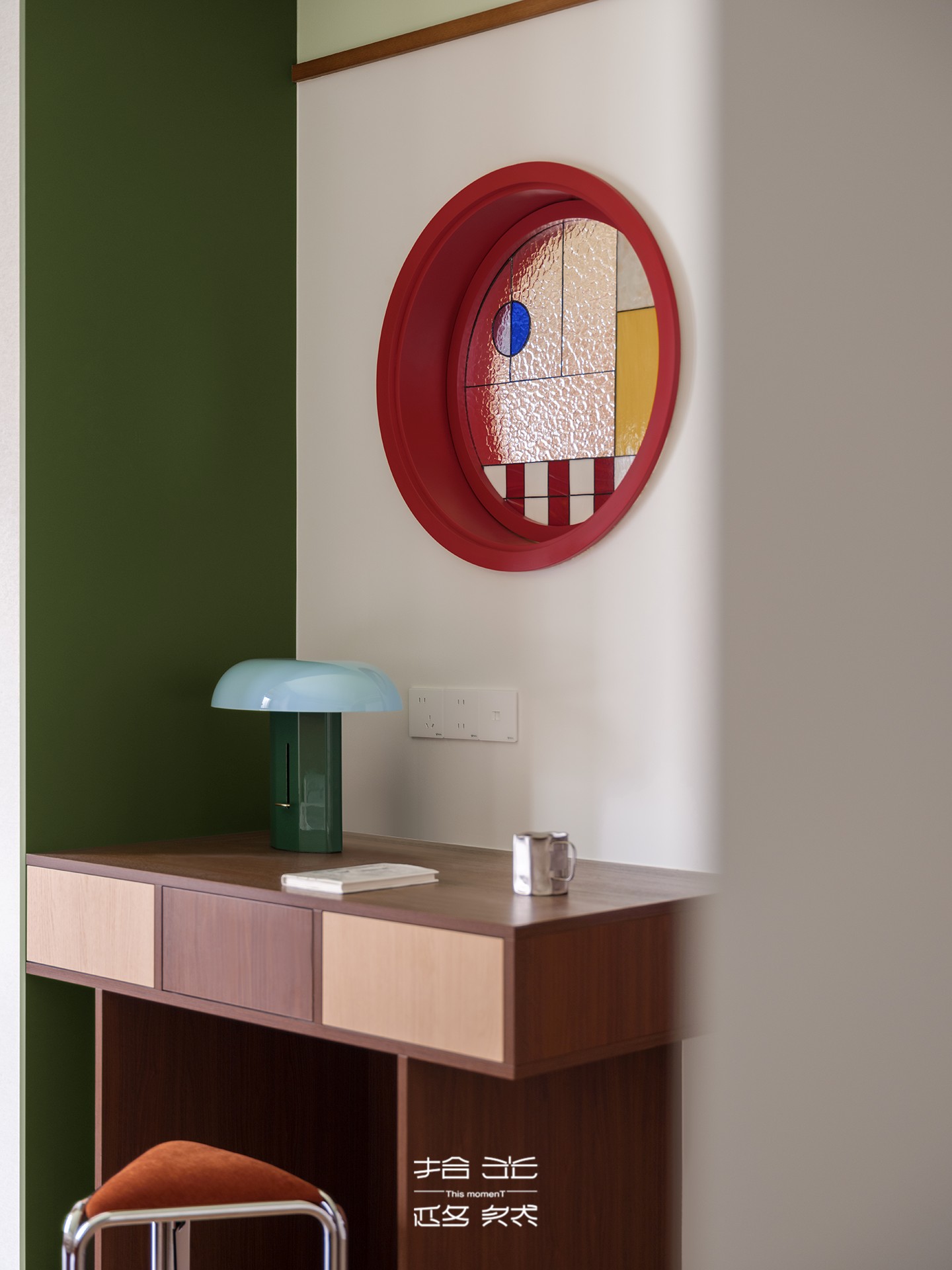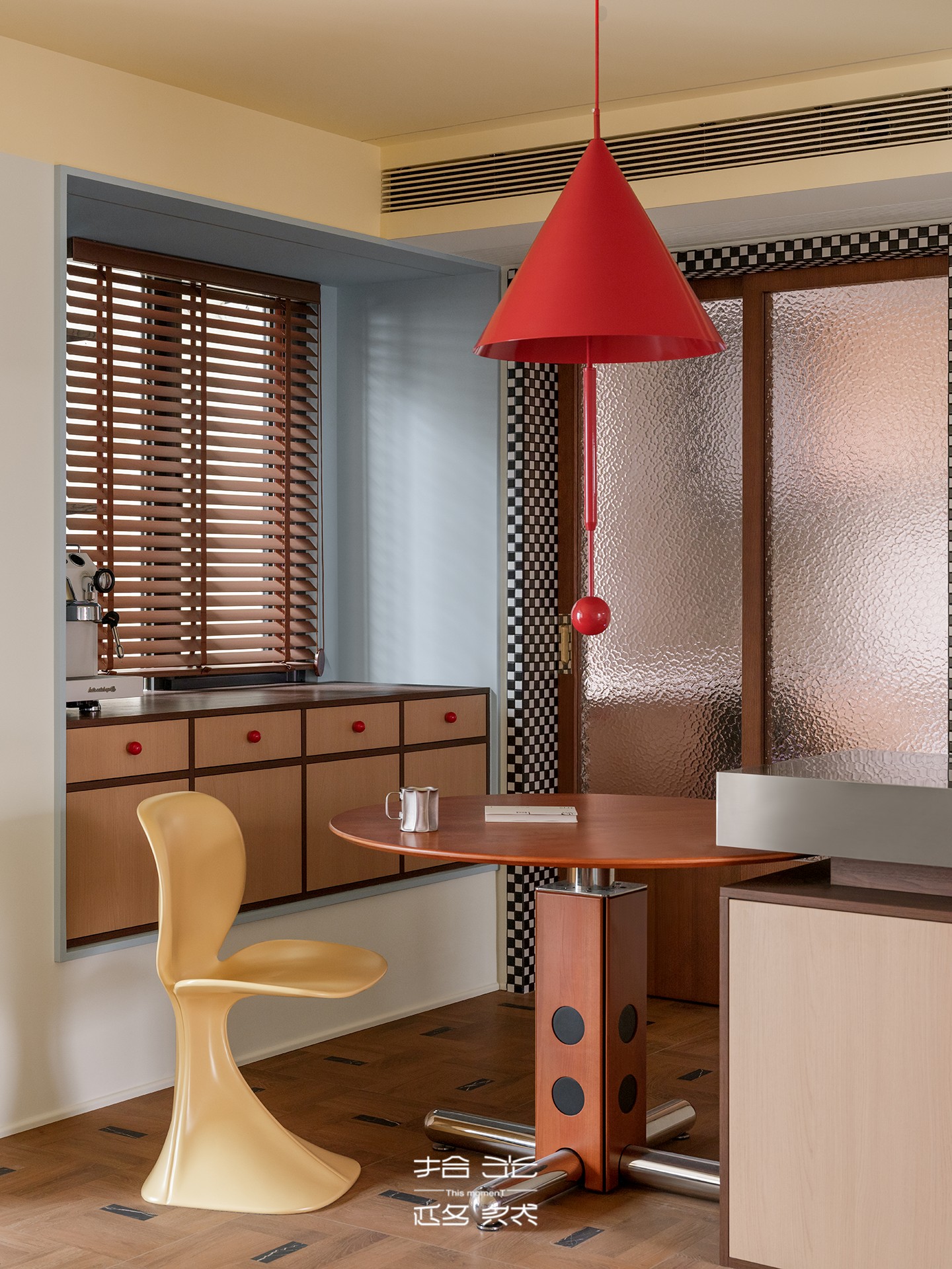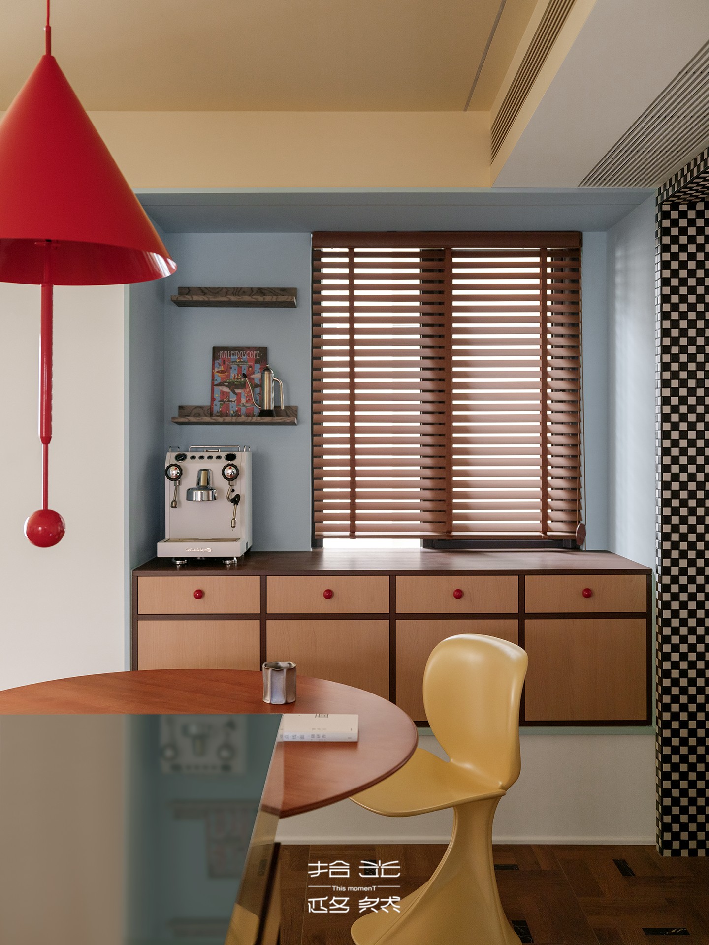 色彩的层次在这里很丰富。窗外的自然绿、窗边的静谧蓝、吊灯的热情红……诸多色彩相互交织,达成了微妙的和谐。而对我而言,最实用的莫过于那个被改造的飘窗餐边柜,成了厨房的功能延伸,非常实用。