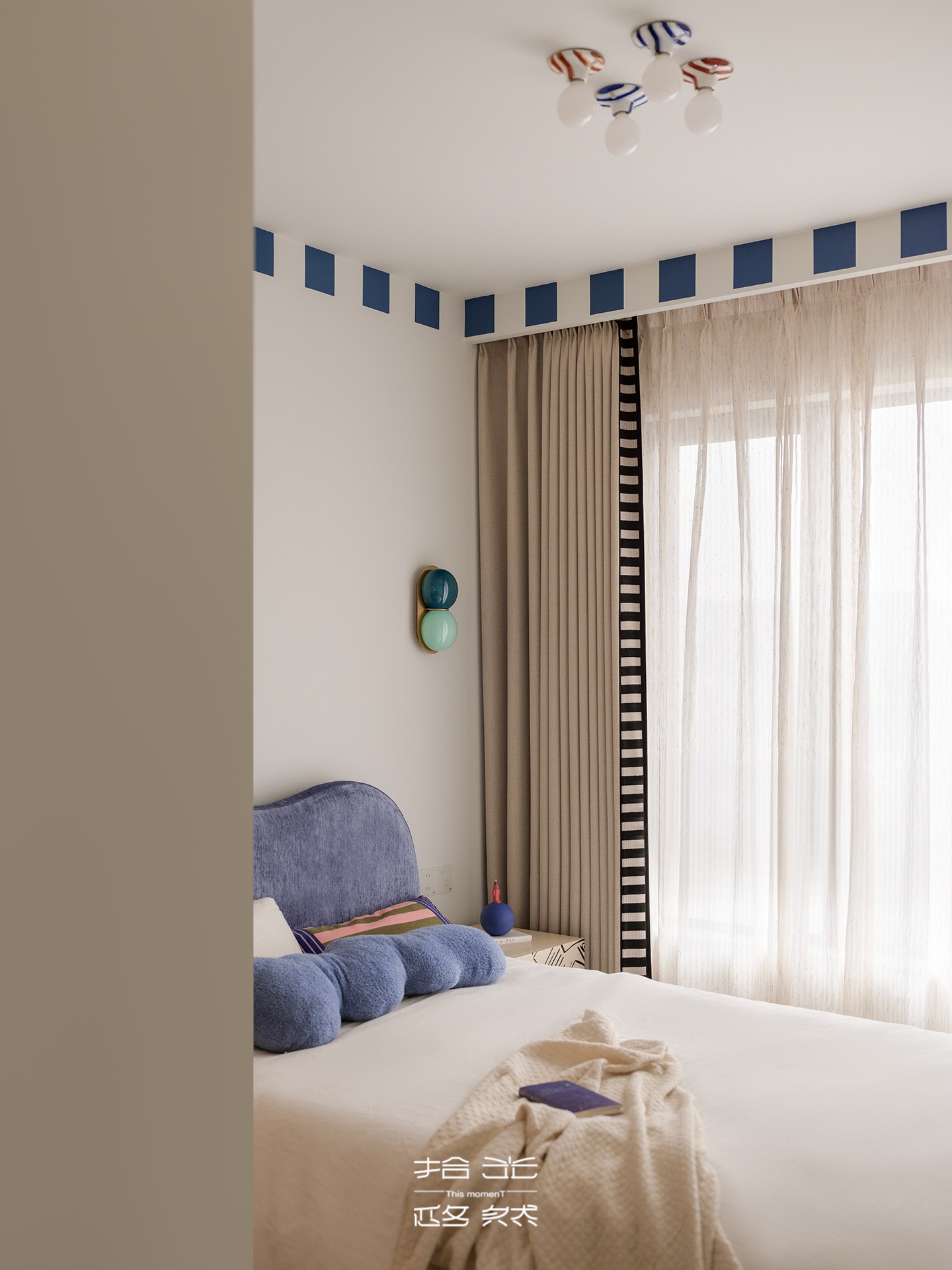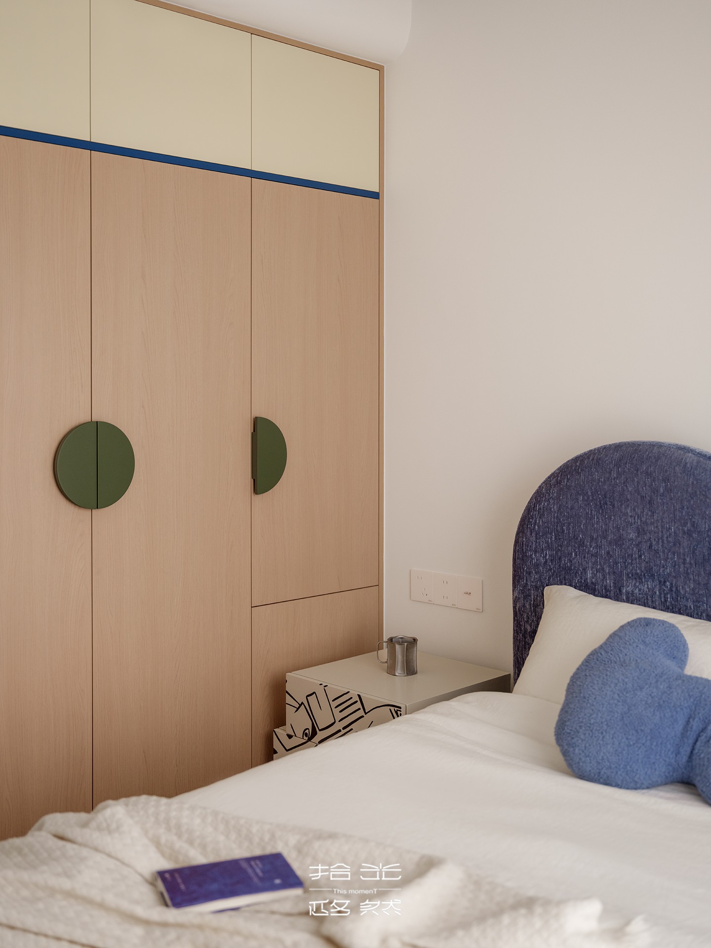 墙面是大面积的留白米色,一盏蓝绿撞色的圆形壁灯,恰好与衣柜的圆形绿色把手、顶面的蓝色线条悄悄对话,让童趣在细节中流动,而非喧闹。绒面的蓝色弧形床头柔软地包裹着梦境,云朵抱枕仿佛触手可及。我们想象着,未来孩子会在这里阅读、玩耍,这个房间的色彩会默默陪伴他,编织出最初的美感记忆。